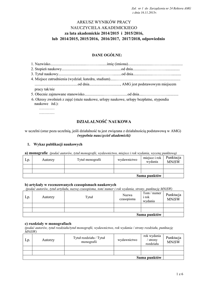 Zał. nr 1 do Zarządzenia nr 24 Rektora AMG z dnia 16.11.2015r. ARKUSZ WYNIKÓW PRACY NAUCZYCIELA AKADEMICKIEGO za lata akademickie 2014/2015 i 2015/2016, lub 2014/2015, 2015/2016, 2016/2017, 2017/2018, odpowiednio DANE OGÓLNE: 1. Nazwisko......................................……….........imię (imiona).........................……………............ 2. Stopień naukowy............................………......................od dnia..............……………............... 3. Tytuł naukowy.............................................……….........od dnia....................…………….......... 4. Miejsce zatrudnienia (wydział, katedra, studium).......……………………………...................... .............................................od dnia................................, AMG jest podstawowym miejscem pracy tak/nie 5. Obecnie zajmowane stanowisko.....................……................od dnia.....………………............ 6. Okresy zwolnień z zajęć (staże naukowe, urlopy naukowe, urlopy bezpłatne, stypendia naukowe itd.): ………… ………… DZIAŁALNOŚĆ NAUKOWA w uczelni (oraz poza uczelnią, jeśli działalność ta jest związana z działalnością podstawową w AMG) (wypełnia nauczyciel akademicki) 1. Wykaz publikacji naukowych a) monografie (podać autorów, tytuł monografii, wydawnictwo, miejsce i rok wydania, wycenę punktową) miejsce i rok Punktacja Tytuł monografii wydawnictwo Lp. Autorzy wydania MNiSW Suma punktów b) artykuły w recenzowanych czasopismach naukowych (podać autorów, tytuł artykułu, nazwę czasopisma, tom/ numer i rok wydania, strony, punktację MNiSW) Tom / numer Punktacja Nazwa Tytuł i rok Lp. Autorzy czasopisma MNiSW wydania Suma punktów c) rozdziały w monografiach (podać autorów, tytuł rozdziału/tytuł monografii, wydawnictwo, rok wydania / strony rozdziału, punktację MNiSW) rok wydania Punktacja Tytuł rozdziału / Tytuł wydawnictwo / strony Lp. Autorzy monografii MNiSW rozdziału Suma punktów 1z6 Zał. nr 1 do Zarządzenia nr 24 Rektora AMG z dnia 16.11.2015r. d) Referaty opublikowane w materiałach konferencyjnych Lp. Tytuł referatu / Nazwa konferencyji Autorzy wydawnictwo rok wydania / strony Punktacja MNiSW Suma punktów 2. Redagowanie czasopism naukowych oraz wieloautorskich monografii: Nazwa czasopisma lub Wydawnictwo Lp. Pełniona funkcja (dot. monografii) monografii rok wydania Punktacja MNiSW 3. Wykaz patentów i wdrożeń patentowych: a) uzyskane patenty krajowe i międzynarodowe: Lp. Autorzy Tytuł/numer patentu Rok przyznania Punktacja MNiSW Tytuł/numer zgłoszenia patentowego Rok przyjęcia zgłoszenia Punktacja MNiSW b) zgłoszenia patentowe: Lp. Autorzy 4. Wykaz ekspertyz, opracowań naukowych, projektów naukowych i badawczo-rozwojowych: Lp. Nazwa Pełniona funkcja/wartość/udział Punktacja wg Regulaminu Nagród Rektora 5. Pełnienie roli recenzenta: a) recenzje w przewodach doktorskich, recenzje w postępowaniach habilitacyjnych, opinie w postępowaniu o nadanie tytułu naukowego profesora: Lp. Imię i nazwisko doktoranta / habilitanta / kandydata do tytułu profesora Tytuł rozprawy doktorskiej lub habilitacyjnej Jednostka prowadząca przewód / wnioskująca Data opracowania recenzji / opinii Punktacja wg Regulaminu Nagród Rektora 6. Promotorstwo obronionych lub wszczętych prac / przewodów doktorskich Lp. Imię i nazwisko doktoranta Tytuł rozprawy doktorskiej Jednostka prowadząca przewód doktorski data wszczęcia przewodu doktorskiego / Data uzyskania stopnia doktora Dziedzina i dyscyplina naukowa Punktacja wg Regulaminu Nagród Rektora 2z6 Zał. nr 1 do Zarządzenia nr 24 Rektora AMG z dnia 16.11.2015r. Łączna liczba punktów za osiągnięcia naukowe ……………………………………….. 7. Organizowanie kongresów, konferencji, sympozjów i innych spotkań naukowych: Lp. Nazwa Miejsce i data wydarzenia Pełniona funkcja 8. Uczestnictwo w działalności (członkostwo) krajowych, zagranicznych lub międzynarodowych organizacji naukowych: Lp. Nazwa organizacji Charakter członkostwa/działalności Data wstąpienia 9. Inne osiągnięcia w kształceniu kadry naukowej 1) … 2) … 10. Inne osiągnięcia naukowe, mogące mieć wpływ na ocenę: (np. ekspertyzy, opinie, nagrody, wyróżnienia itp.) 1) … 2) … …………………………………………. data i czytelny podpis ocenianego nauczyciela akademickiego OPINIA O DZIAŁALNOŚCI NAUKOWEJ (wypełnia kierownik jednostki organizacyjnej) …………………………………………………………………………………………………………… …………………………………………………………………………………………………………… …………………………………………………………………………………………………………… …………………………………………………………………………………………………………… …………………………………………………………………………………………………………… ………………………………………………… data, podpis i pieczęć kierownika jednostki organizacyjnej 3z6 Zał. nr 1 do Zarządzenia nr 24 Rektora AMG z dnia 16.11.2015r. DZIAŁALNOŚĆ DYDAKTYCZNA (wypełnia nauczyciel akademicki) Osiągnięcia dydaktyczne wg kryteriów zawartych w Regulaminie Nagród Rektora 1. Publikacje dydaktyczne (podręczniki, skrypty) Lp. Autorzy Tytuł Wydawnictwo Rok wydania / liczba stron Punktacja zgodnie z par. 5 pkt.4 Regulaminu Nagród Rektora 2. Wykaz pozostałych osiągnięć dydaktycznych zgodnie z par. 5 pkt. 4 Regulaminu Nagród Rektora: Lp. Nazwa osiągnięcia Punktacja wg Regulaminu Nagród Rektora 3. Punkty za osiągniecia dydaktyczne, z uwzględnieniem opinii studentów, przyznane na wniosek dziekana Punktacja zgodna z Lp. Nazwa osiągnięcia załącznikiem Nr 4 Łączna liczba pun