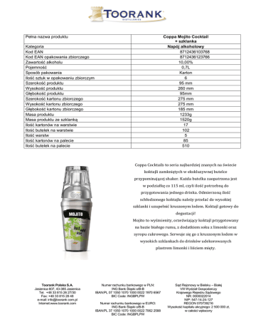 Pełna nazwa produktu Coppa Mojito Cocktail + szklanka Napój alkoholowy 8712436103768 8712436123766 10,00% 0,7L Karton 6 95 mm 260 mm 95mm 275 mm 275 mm 185 mm 1233g 1520g 17 102 5 85 510 Kategoria Kod EAN Kod EAN opakowania zbiorczego Zawartość alkoholu Pojemność Sposób pakowania Ilość sztuk w opakowaniu zbiorczym Szerokość produktu Wysokość produktu Głębokość produktu Szerokość kartonu zbiorczego Wysokość kartonu zbiorczego Głębokość kartonu zbiorczego Masa produktu Masa produktu ze szklanką Ilość kartonów na warstwie Ilość butelek na warstwie Ilość warstw Ilość kartonów na palecie Ilość butelek na palecie Coppa Cocktails to seria najbardziej znanych na świecie koktajli zamkniętych w ekskluzywnej butelce przypominającej shaker. Każda butelka zaopatrzona jest w podziałkę co 115 ml, czyli ilość potrzebną do przygotowania jednego drinka. Odmierzoną ilość schłodzonego koktajlu należy przelać do wysokiej szklanki i uzupełnić kruszonym lodem. Koktajl gotowy do degustacji! Mojito to wyśmienity, orzeźwiający koktajl przygotowany na bazie białego rumu, z dodatkiem soku z limonki oraz syropu cukrowego. Serwuje się go z kruszonym lodem w wysokich szklankach do drinków udekorowanych plastrem limonki i liściem mięty. Toorank Polska S.A. Jasienica 607, 43-385 Jasienica Tel. +48 33 815 26 27/30 Fax: +48 33 815 28 48 e-mail: info@toorank com.pl Internet:www.toorank.com Numer rachunku bankowego w PLN: ING Bank Śląski o/B-B IBAN:PL 07 1050 1070 1000 0022 1970 6567 BIC Code: INGBPLPW Numer rachunku bankowego w EURO: ING Bank Śląski o/B-B IBAN:PL 37 1050 1070 1000 0022 7062 2588 BIC Code: INGBPLPW Sąd Rejonowy w Bielsku – Białej VIII Wydział Gospodarczy Krajowego Rejestru Sądowego NR: 0000022014 NIP: 547-14-24-127 REGON 070739216 Wysokość kapitału akcyjnego: 2 500 000 zł, w całości wpłacony