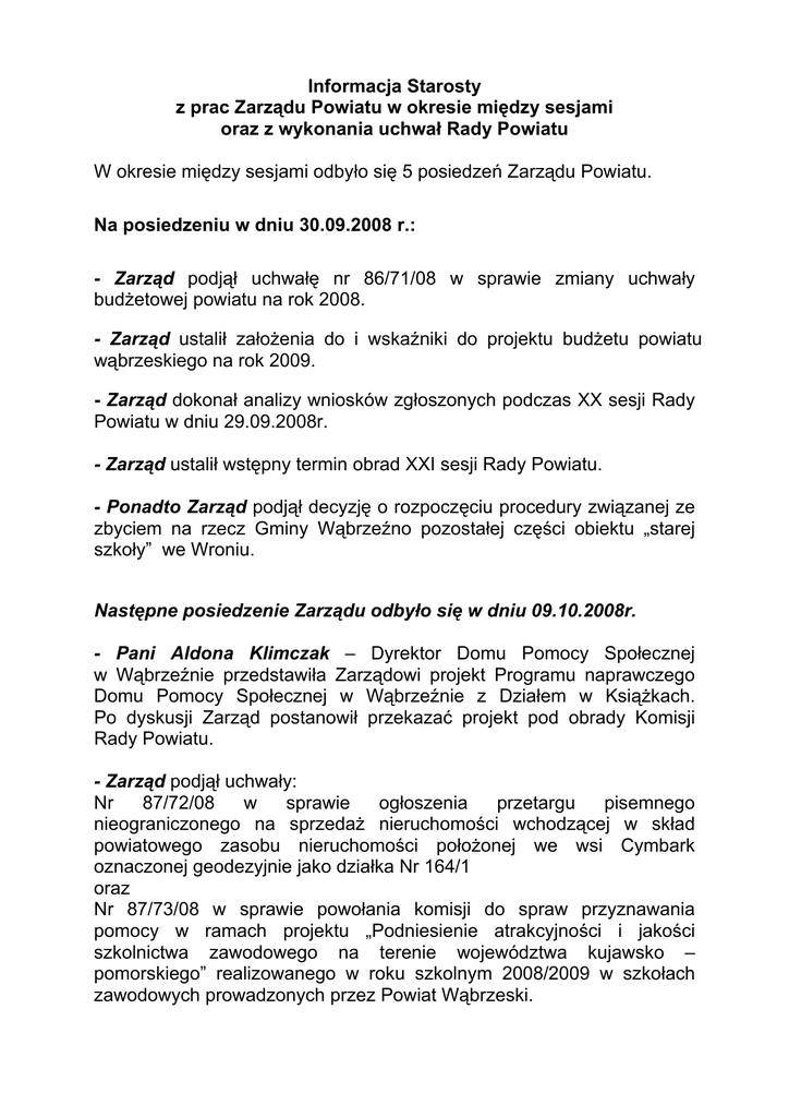 Informacja Starosty z prac Zarządu Powiatu w okresie między sesjami oraz z wykonania uchwał Rady Powiatu W okresie między sesjami odbyło się 5 posiedzeń Zarządu Powiatu. Na posiedzeniu w dniu 30.09.2008 r.: - Zarząd podjął uchwałę nr 86/71/08 w sprawie zmiany uchwały budżetowej powiatu na rok 2008. - Zarząd ustalił założenia do i wskaźniki do projektu budżetu powiatu wąbrzeskiego na rok 2009. - Zarząd dokonał analizy wniosków zgłoszonych podczas XX sesji Rady Powiatu w dniu 29.09.2008r. - Zarząd ustalił wstępny termin obrad XXI sesji Rady Powiatu. - Ponadto Zarząd podjął decyzję o rozpoczęciu procedury związanej ze zbyciem na rzecz Gminy Wąbrzeźno pozostałej części obiektu „starej szkoły” we Wroniu. Następne posiedzenie Zarządu odbyło się w dniu 09.10.2008r. - Pani Aldona Klimczak – Dyrektor Domu Pomocy Społecznej w Wąbrzeźnie przedstawiła Zarządowi projekt Programu naprawczego Domu Pomocy Społecznej w Wąbrzeźnie z Działem w Książkach. Po dyskusji Zarząd postanowił przekazać projekt pod obrady Komisji Rady Powiatu. - Zarząd podjął uchwały: Nr 87/72/08 w sprawie ogłoszenia przetargu pisemnego nieograniczonego na sprzedaż nieruchomości wchodzącej w skład powiatowego zasobu nieruchomości położonej we wsi Cymbark oznaczonej geodezyjnie jako działka Nr 164/1 oraz Nr 87/73/08 w sprawie powołania komisji do spraw przyznawania pomocy w ramach projektu „Podniesienie atrakcyjności i jakości szkolnictwa zawodowego na terenie województwa kujawsko – pomorskiego” realizowanego w roku szkolnym 2008/2009 w szkołach zawodowych prowadzonych przez Powiat Wąbrzeski. -2- Zarząd zaopiniował aneks do porozumienia w sprawie prowadzenia w Centrum Kształcenia Praktycznego w Wąbrzeźnie zajęć teoretycznych i praktycznych dla uczniów oddziałów przysposabiających do pracy, funkcjonujących w Gimnazjum nr 1 w Wąbrzeźnie. Porozumienie w tej sprawie zostało zawarte w dniu 03.09.2007r. pomiędzy Miastem Wąbrzeźno, a Powiatem Wąbrzeskim i dotyczyło roku szkolnego 2007/2008. Zgodnie z § 6 Porozumienia w razie zaistnienia potrzeby strony zobowiązują się do przedłużenia porozumienia na podstawie aneksu, ponieważ w bieżącym roku szkolnym zadanie to będzie kontynuowane stąd zaistniała potrzeba zawarcia tego aneksu. - Pan K. Maćkiewicz – Starosta poinformował członków Zarządu, że w dniu 7 października 2008r. odbyło się w Warszawie VI Samorządowe Forum Kapitału i Finansów. Powiat Wąbrzeski zajął III miejsce w rankingu „Inwestorów Samorządowych" w kategorii „Powiaty" organizowanym przez pismo samorządu terytorialnego „Wspólnota". Podczas uroczystej gali statuetkę Kazimierza Wielkiego z rąk organizatorów odebrała pani Maria Zakrawacz – Skarbnik Powiatu. - Zarząd omówił organizację tegorocznych Niepodległości i ustalił program obchodów. obchodów Święta - Ponadto Zarząd zapoznał się z informacją o prowadzeniu spraw z zakresu zamówień publicznych powyżej 3 000 EURO dotyczących następujących spraw: • postępowania w trybie przetargu nieograniczonego na dostawę artykułów mleczarskich na potrzeby mieszkańców Domu Pomocy Społecznej w Wąbrzeźnie z Działem w Książkach, • postępowania w trybie przetargu nieograniczonego na dostawę mięsa i wyrobów wędliniarskich na potrzeby mieszkańców Domu Pomocy Społecznej w Wąbrzeźnie z Działem w Książkach, • postępowania w trybie zapytania ofertowego na dostawę pieczywa na potrzeby Domu Pomocy Społecznej w Wąbrzeźnie z Działem w Książkach, • postępowania w trybie zapytania ofertowego na remont estakady i wejścia głównego do budynku Domu Pomocy Społecznej w Wąbrzeźnie z Działem w Książkach. W związku z powyższym Zarząd nie zgłosił żadnych uwag. Kolejne posiedzenie Zarządu odbyło się w dniu 16.10.2008r. -3- Zarząd podjął uchwały: • Nr 88/74/08 w sprawie zaopiniowania projektu „Program Ochrony Środowiska Gminy Książki na lata 2008 – 2011 z perspektywą na lata 2012 – 2015” i „Planu Gospodarki Odpadami Gminy Książki na lata 2008 – 2011 z perspektywą na lata 2012 – 2015”. • Nr 88/75/08 w sprawie projektów budżetów powiatu na lata 2009 – 2011. - Zarząd zatwierdził przygotowania Zarządu Dróg Powiatowych w Wąbrzeźnie do zimowego utrzymania dróg oraz pozytywnie zaopiniował wykaz dróg powiatowych objętych zimowym utrzymaniem w III, V i VI standardzie w sezonie zimowym 2008/2009 i tym samym zobowiązał jednostkę do realizacji planu. - Zarząd rozpatrzył wniosek Dyrektora Zakładu Opieki Zdrowotnej Szpitala Powiatowego w Wąbrzeźnie w sprawie wyrażenia zgody na wydzierżawienie majątku ZOZ SP w Wąbrzeźnie. Proponuje się, że majątek ruchomy zostanie wydzierżawiony na 10 lat, natomiast majątek nieruchomy na – 30 lat Nowemu Szpitalowi 4 sp. z o.o. z siedzibą w Szczecinie. - Po czym Zarząd pozytywnie zaopiniował i zaakceptował umowy dzierżawy ruchomości oraz nieruchomości Szpitala Powiatowego na rzecz Spółki Nowy Szpital 4 sp. z o.o. w Szczecinie. - Zarząd pozytywnie zaopiniował projekty uchwał Rady Powiatu w sprawach: a) przyjęcia Programu naprawczego Domu Pomocy Społecznej w Wąbrzeźnie z Działem w Książkach, b) określenia zadań, na które przeznacza się środki Państwowego Funduszu Rehabilitacji Osób Niepełnosprawnych przekazane na zadania w zakresie rehabilitacji zawodowej i społecznej na rok 2008, c) przystąpienia do spółki z ograniczoną odpowiedzialnością. - Zarząd pozytywnie rozpatrzył wnioski: -4a) Ogniska Miejskiego Towarzystwa Krzewienia Kultury Fizycznej w Wąbrzeźnie w sprawie dofinansowania w kwocie 300 zł turnieju brydża sportowego z okazji 90 Rocznicy Odzyskania Niepodległości. W/w impreza odbędzie się w dniu 10.11.2008r. b) w sprawie przedłużenia umowy o współpracy między Powiatem Wąbrzeskim, a Kujawsko – Pomorskim Funduszem Pożyczkowym sp. z o.o. W dniu 4 październik