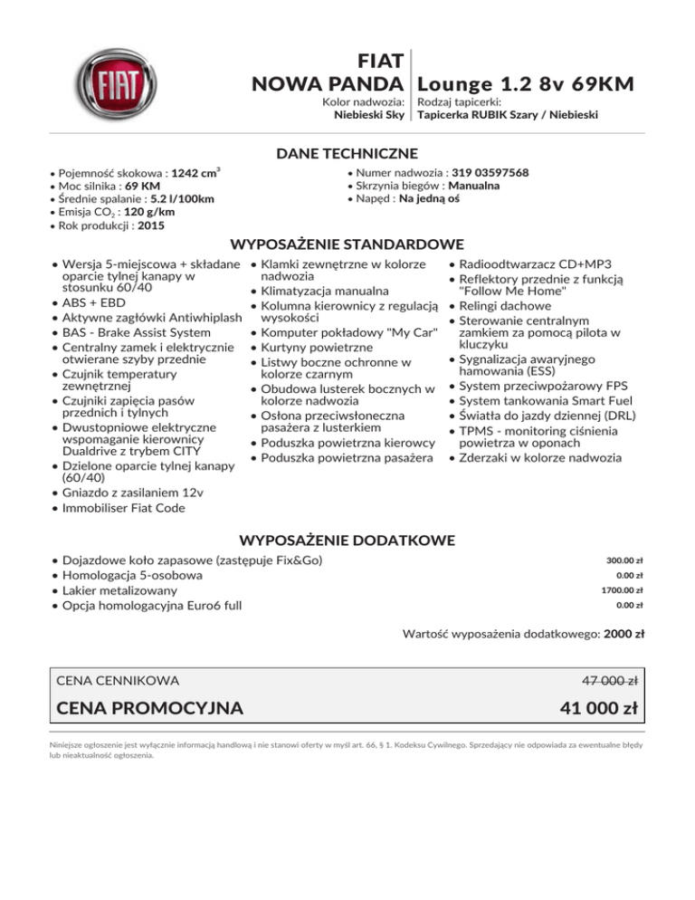 FIAT NOWA PANDA Lounge 1.2 8v 69KM Kolor nadwozia: Niebieski Sky Rodzaj tapicerki: Tapicerka RUBIK Szary / Niebieski DANE TECHNICZNE 3 • Numer nadwozia : 319 03597568 • Skrzynia biegów : Manualna • Napęd : Na jedną oś • Pojemność skokowa : 1242 cm • Moc silnika : 69 KM • Średnie spalanie : 5.2 l/100km • Emisja CO2 : 120 g/km • Rok produkcji : 2015 WYPOSAŻENIE STANDARDOWE • Wersja 5-miejscowa + składane oparcie tylnej kanapy w stosunku 60/40 • ABS + EBD • Aktywne zagłówki Antiwhiplash • BAS - Brake Assist System • Centralny zamek i elektrycznie otwierane szyby przednie • Czujnik temperatury zewnętrznej • Czujniki zapięcia pasów przednich i tylnych • Dwustopniowe elektryczne wspomaganie kierownicy Dualdrive z trybem CITY • Dzielone oparcie tylnej kanapy (60/40) • Gniazdo z zasilaniem 12v • Immobiliser Fiat Code • Klamki zewnętrzne w kolorze nadwozia • Klimatyzacja manualna • Kolumna kierownicy z regulacją wysokości • Komputer pokładowy "My Car" • Kurtyny powietrzne • Listwy boczne ochronne w kolorze czarnym • Obudowa lusterek bocznych w kolorze nadwozia • Osłona przeciwsłoneczna pasażera z lusterkiem • Poduszka powietrzna kierowcy • Poduszka powietrzna pasażera • Radioodtwarzacz CD+MP3 • Reflektory przednie z funkcją "Follow Me Home" • Relingi dachowe • Sterowanie centralnym zamkiem za pomocą pilota w kluczyku • Sygnalizacja awaryjnego hamowania (ESS) • System przeciwpożarowy FPS • System tankowania Smart Fuel • Światła do jazdy dziennej (DRL) • TPMS - monitoring ciśnienia powietrza w oponach • Zderzaki w kolorze nadwozia WYPOSAŻENIE DODATKOWE • Dojazdowe koło zapasowe (zastępuje Fix&Go) • Homologacja 5-osobowa • Lakier metalizowany • Opcja homologacyjna Euro6 full 300.00 zł 0.00 zł 1700.00 zł 0.00 zł Wartość wyposażenia dodatkowego: 2000 zł CENA CENNIKOWA CENA PROMOCYJNA 47 000 zł 41 000 zł Niniejsze ogłoszenie jest wyłącznie informacją handlową i nie stanowi oferty w myśl art. 66, § 1. Kodeksu Cywilnego. Sprzedający nie odpowiada za ewentualne błędy lub nieaktualność ogłoszenia.