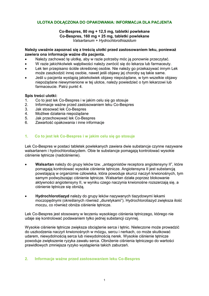 ULOTKA DOŁĄCZONA DO OPAKOWANIA: INFORMACJA DLA PACJENTA Co-Bespres, 80 mg + 12,5 mg, tabletki powlekane Co-Bespres, 160 mg + 25 mg, tabletki powlekane Valsartanum + Hydrochlorothiazidum Należy uważnie zapoznać się z treścią ulotki przed zastosowaniem leku, ponieważ zawiera ona informacje ważne dla pacjenta. Należy zachować tę ulotkę, aby w razie potrzeby móc ją ponownie przeczytać. W razie jakichkolwiek wątpliwości należy zwrócić się do lekarza lub farmaceuty. Lek ten przepisano ściśle określonej osobie. Nie należy go przekazywać innym Lek może zaszkodzić innej osobie, nawet jeśli objawy jej choroby są takie same. Jeśli u pacjenta wystąpią jakiekolwiek objawy niepożądane, w tym wszelkie objawy niepożądane niewymienione w tej ulotce, należy powiedzieć o tym lekarzowi lub farmaceucie. Patrz punkt 4. Spis treści ulotki: 1. Co to jest lek Co-Bespres i w jakim celu się go stosuje 2. Informacje ważne przed zastosowaniem leku Co-Bespres 3. Jak stosować lek Co-Bespres 4. Możliwe działania niepożądane 5. Jak przechowywać lek Co-Bespres 6. Zawartość opakowania i inne informacje 1. Co to jest lek Co-Bespres i w jakim celu się go stosuje Lek Co-Bespres w postaci tabletek powlekanych zawiera dwie substancje czynne nazywane walsartanem i hydrochlorotiazydem. Obie te substancje pomagają kontrolować wysokie ciśnienie tętnicze (nadciśnienie). Walsartan należy do grupy leków tzw. „antagonistów receptora angiotensyny II”, które pomagają kontrolować wysokie ciśnienie tętnicze. Angiotensyna II jest substancją powstającą w organizmie człowieka, która powoduje skurcz naczyń krwionośnych, tym samym podwyższając ciśnienie tętnicze. Walsartan działa poprzez blokowanie aktywności angiotensyny II, w wyniku czego naczynia krwionośne rozszerzają się, a ciśnienie tętnicze się obniżą. Hydrochlorotiazyd należy do grupy leków nazywanych tiazydowymi lekami moczopędnymi (określanych również „diuretykami”). Hydrochlorotiazyd zwiększa ilość moczu, co również obniża ciśnienie tętnicze. Lek Co-Bespres jest stosowany w leczeniu wysokiego ciśnienia tętniczego, którego nie udaje się kontrolować podawaniem tylko jednej substancji czynnej. Wysokie ciśnienie tętnicze zwiększa obciążenie serca i tętnic. Nieleczone może prowadzić do uszkodzenia naczyń krwionośnych w mózgu, sercu i nerkach, co może skutkować udarem, niewydolnością serca lub niewydolnością nerek. Wysokie ciśnienie tętnicze powoduje zwiększenie ryzyka zawału serca. Obniżenie ciśnienia tętniczego do wartości prawidłowych zmniejsza ryzyko wystąpienia takich zaburzeń. 2. Informacje ważne przed zastosowaniem leku Co-Bespres 1 Kiedy NIE stosować leku Co-Bespres Jeśli pacjent ma uczulenie na walsartan, hydrochlorotiazyd, pochodne sulfonamidu (substancje o strukturze chemicznej podobnej do hydrochlorotiazydu) lub którykolwiek z pozostałych składników tego leku (wymienionych w punkcie 6). Jeśli pacjentka jest w ciąży powyżej 3. miesiąca (lepiej jest również unikać stosowania leku Co-Bespres we wczesnym okresie ciąży - patrz punkt „Ciąża i karmienie piersią”). Jeśli u pacjenta występuje ciężka choroba wątroby, uszkodzenie małych przewodów żółciowych w wątrobie (marskość żółciowa wątroby) prowadzące do gromadzenia żółci w wątrobie (cholestaza). Jeśli u pacjenta występuje ciężka choroba nerek. Jeśli pacjent nie może wytwarzać moczu (bezmocz). Jeśli pacjent jest dializowany za pomocą sztucznej nerki. Jeśli u pacjenta występuje zmniejszone stężenie potasu lub sodu we krwi lub zwiększone stężenie wapnia we krwi, pomimo leczenia. Jeśli u pacjenta występuje dna moczanowa. Jeśli pacjent ma cukrzycę lub zaburzenia czynności nerek i jest leczony aliskirenem lekiem obniżającym wysokie ciśnienie tętnicze. Jeśli którykolwiek z powyższych stanów dotyczy pacjenta, nie wolno stosować tego leku i należy skontaktować się z lekarzem. Ostrzeżenia i środki ostrożności Przed rozpoczęciem stosowania Co-Bespres należy omówić to z lekarzem lub farmaceutą. Jeśli pacjent stosuje leki oszczędzające potas, suplementy potasu lub substytuty soli kuchennej zawierające potas lub inne leki zwiększające stężenie potasu we krwi, takie jak heparyna. Konieczne może być monitorowanie stężenia potasu we krwi przez lekarza. Jeśli u pacjenta występuje małe stężenie potasu we krwi. Jeśli u pacjenta występuje biegunka lub nasilone wymioty. Jeśli pacjent przyjmuje duże dawki leków moczopędnych (diuretyków). Jeśli u pacjenta występuje ciężka choroba serca. Jeśli pacjent ma niewydolność serca lub przebył zawał serca. Należy ściśle przestrzegać zaleceń lekarza dotyczących rozpoczynania leczenia – konieczna może być również kontrola czynności nerek. Jeśli u pacjenta występuje zwężenie tętnicy nerkowej. Jeśli pacjentowi w ostatnim czasie przeszczepiono nerkę. Jeśli u pacjenta występuje hiperaldosteronizm - choroba, w której nadnercza wytwarzają zbyt duże ilości hormonu o nazwie aldosteron. W takim przypadku nie zaleca się stosowania leku Co-Bespres. Jeśli u pacjenta występuje choroba wątroby lub nerek. Jeśli u pacjenta wystąpił kiedykolwiek obrzęk języka i twarzy spowodowany reakcją alergiczną, nazywaną obrzękiem naczynioruchowym, po zastosowaniu innego leku (w tym inhibitorów ACE), należy powiadomić o tym lekarza. Jeśli wystąpią takie objawy podczas stosowania leku Co-Bespres należy natychmiast przerwać jego przyjmowanie i nigdy nie stosować go ponownie. Patrz także punkt 4. Jeśli u pacjenta występuje gorączka, wysypka i ból stawów, które mogą być objawami tocznia rumieniowatego układowego (SLE, choroba autoimmunologiczna). Jeśli pacjent ma cukrzycę, przebył dnę moczanową, ma duże stężenie cholesterolu lub triglicerydów we krwi. 2 Jeśli u pacjenta w przeszłości występowały reakcje alergiczne po zast