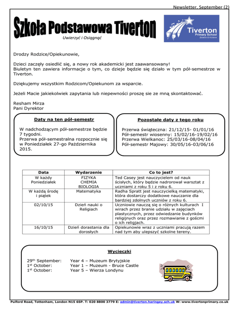 Newsletter, September (2) Uwierzyć i Osiągnąć Drodzy Rodzice/Opiekunowie, Dzieci zaczęły osiedlić się, a nowy rok akademicki jest zaawansowany! Biuletyn ten zawiera informacje o tym, co dzieje będzie się działo w tym pół-semestrze w Tiverton. Dziękujemy wszystkim Rodzicom/Opiekunom za wsparcie. Jeżeli Macie jakiekolwiek zapytania lub niepewności proszę sie ze mną skontaktować. Resham Mirza Pani Dyrektor Daty na ten pół-semestr Pozostałe daty z tego roku W nadchodzącym pół-semestrze będzie 7 tygodni. Przerwa pół-semestralna rozpocznie się w Poniedziałek 27-go Pażdziernika 2015. Do szkoły powracamy w Poniedziałek 2go Listopada. Przerwa świąteczna: 21/12/15- 01/01/16 Pół-semestr wiosenny: 15/02/16-19/02/16 Przerwa Wielkanoc: 25/03/16-08/04/16 Pół-semestr Majowy: 30/05/16-03/06/16 Data W każdy Poniedziałek W każdą środę i piątek Wydarzenie FIZYKA CHEMIA BIOLOGIA Matematyka 02/10/15 Dzień nauki o Religiach 16/10/15 Dzień dorastania dla dorosłych Co to jest? Ted Casey jest nauczycielem od nauk ścisłych, który będzie nadrorował warsztat z uczniami z roku 5 i z roku 6. Radha Spratt jest nauczycielką matematyki, która dostarczy dodatkowe nauczanie dla bardziej zdolnych uczniów z roku 6. Uczniowie nauczą się o różnych kulturach I wirach przez branie udziału w zajęciach plastycznych, przez odwiedzanie budynków religijnych oraz przez rozmawianie z goścmi o ich religjach. Opiekunowie wraz z uczniami pracują razem nad tym aby ulepszyć szkolne tereny. Wycieczki 29th September: 1st October: 1st October: Year 4 – Muzeum Brytyjskie Year 1 – Muzeum - Bruce Castle Year 5 – Wierza Londynu Ckmcckvmcvkvmb Pulford Road, Tottenham, London N15 6SP. T: 020 8800 3779 E: [email protected] W: www.tivertonprimary.co.uk Newsletter, September (2) Obecność Poniżej znajdują się obecnośći klas w procentach na tydzień, który zakończył się dnia 25/09/15: Fledglings – 83% Robin – 92% Starling – 91% Rhea – 85% Kiwi – 88% Kestrel – 87% Eagle – 91% Dove – 90% Owl – 86% Coral – 91% Garnet – 94% Pearl – 95% Jasper – 91% Opal – 93% Amber – 94% Gratulacje dla klasy Pearl za wygranie konkurencji na obecność w tym tygodniu! Prosimy aby wszystkie dzieci przyszły do szkoły każdego dnia i na czas. Inne wiadomości - Dziękujemy całem społeczności szkolnej…..Zebraliśmy w tym roku £337.60 podczas dnia DŻINSY NA GENY. - Jeżeli chcecie otrzymywać sms-y z informacjami o wydarzeniach w Tiverton, proszę przyjść do biura I zarejestrować się na Pocztę Rodziców (Parentmail). - Jeżeli chcecie wiedzieć co wasze dziecko je na przerwie, mamy karty w biurze, gdzie możecie poprosić o kopie. -ESOL Angielski dla Rodziców – w tym roku klasy odbędą się we wtorki i w czwartki rano, 9:15 – 11:15. Zapraszamy wszystkim rodziców / opiekunów (przepraszamy, ale opieka nad małymi dziećmi nie będzie zapewniona). Jeżli jesteście zainteresowani, prosimy o pozostawienie imienia i numeru telefonu w biurze. Klasy rozpoczną się we wtorek 29 Września. Z ostatniej chwili…Z przyjemnością chcemy Was poinformować, że szkoła Tiverton zdobyła srebrny medal za znakomite wyniki w konkurencji o naukach ścisłych. Wielkie podziękowania należą się dla Pani Waite za kierownictwo w tym projekcie. Przypomnienie o Recyklingu Prośimy pamiętać, że nadal zbieramy nastepujące rzeczy; Stare telefony komórkowe: W ten sposó wspieramy organizacje dla bezdomnych . Zużyte tusze do drukarek: Wysyłamy je do organizacji charytatywnej Starlight. Kupony zakupowe z Tesco: Pomagają one nam w zakupie sprzętu sportowego dla szkoły Strój Szkolny Biała koszula/Koszulka Polo/Granatowy sweter Szare spodnie /Spódnica /Sukienka/fartuszek Czarne/Szare/Granatowe/Białe skarpetki /Rajstopy Czarne/Szare/Granatowe/Białe/nakrycie głowy Strój na – W-F Granatowe/czarne spodenki Biała koszulka Pulford Road, Tottenham, London N15 6SP. T: 020 8800 3779 E: [email protected] W: www.tivertonprimary.co.uk