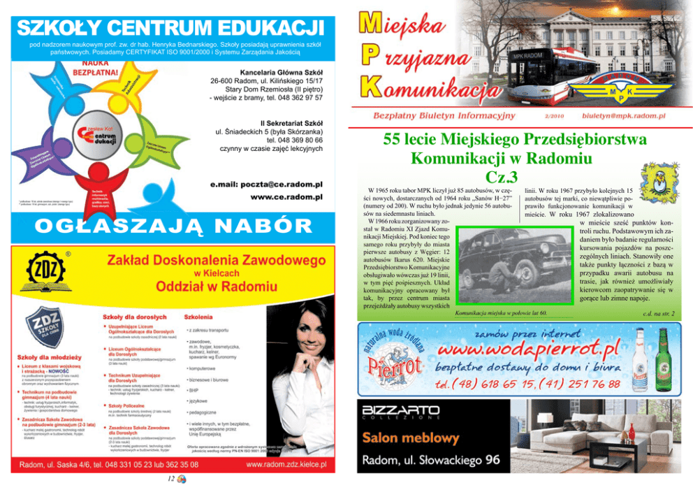 SZKOŁY CENTRUM EDUKACJI pod nadzorem naukowym prof. zw. dr hab. Henryka Bednarskiego. Szkoły posiadają uprawnienia szkół państwowych. Posiadamy CERTYFIKAT ISO 9001/2000 i Systemu Zarządania Jakością Kancelaria Główna Szkół 26-600 Radom, ul. Kilińskiego 15/17 Stary Dom Rzemiosła (II piętro) - wejście z bramy, tel. 048 362 97 57 II Sekretariat Szkół ul. Śniadeckich 5 (była Skórzanka) tel. 048 369 80 66 czynny w czasie zajęć lekcyjnych e.mail: [email protected] www.ce.radom.pl * podbudowa: 18 lat, szkoła zawodowa (starego I nowego typu) ** podbudowa: 18 lat, gimnazjum, szk. podst. (starego typu) OGŁASZAJĄ NABÓR 55 lecie Miejskiego Przedsiębiorstwa Komunikacji w Radomiu Cz.3 W 1965 roku tabor MPK liczył już 85 autobusów, w części nowych, dostarczanych od 1964 roku „Sanów H−27” (numery od 200). W ruchu było jednak jedynie 56 autobusów na siedemnastu liniach. W 1966 roku zorganizowany został w Radomiu XI Zjazd Komunikacji Miejskiej. Pod koniec tego samego roku przybyły do miasta pierwsze autobusy z Węgier: 12 autobusów Ikarus 620. Miejskie Przedsiębiorstwo Komunikacyjne obsługiwało wówczas już 19 linii, w tym pięć pośpiesznych. Układ komunikacyjny opracowany był tak, by przez centrum miasta przejeżdżały autobusy wszystkich linii. W roku 1967 przybyło kolejnych 15 autobusów tej marki, co niewątpliwie poprawiło funkcjonowanie komunikacji w mieście. W roku 1967 zlokalizowano Komunikacja miejska w połowie lat 60. 12 w mieście sześć punktów kontroli ruchu. Podstawowym ich zadaniem było badanie regularności kursowania pojazdów na poszczególnych liniach. Stanowiły one także punkty łączności z bazą w przypadku awarii autobusu na trasie, jak również umożliwiały kierowcom zaopatrywanie się w gorące lub zimne napoje. c.d. na str. 2 downictwa Komunalnego w Kielcach, zmieniło Lata 70. rozpoczęły się decyzją o likwidacji nazwę na Wojewódzkie Przedsiębiorstwo obsługi konduktorskiej w pojazdach i wprowKomunikacji Miejskiej (WPKM), którego adzeniu kasowników typu Krak. Następowały jednostką nadrzędną stało się identycznie jak też kolejne dostawy nowego taboru: w 1971 poprzednio Zjednoczenie, ale mieszczące się roku MPK otrzymało 20 autobusów Ikarusów w Radomiu. W tym czasie Przedsiębiorstwo 556 oraz 3 autobusy Jelcz Mex−272 (numery ok. zatrudniało 682 pracowników. W autobusach 300). W kolejnych latach dostarczano głównie ostatecznie zlikwidowano autobusy Jelcz, które zaczęły obsługę konduktorską, zastępować najstarsze Sany. we wszystkich bowiW 1972 roku oddano do em obowiązywała już użytku obiekt usług techsamoobsługa. Każdego nicznych z sześcioma dnia na ulice miasta stanowiskami naprawczymi wyjeżdżały autobusy mari stacją paliw w bazie przy ki San, Autosan (H9−33 ul. Świerczewskiego. Wprowi 35 - numery od 350), adzono także pierwsze raIkarus i Jelcz. Łącznie 133 diotelefony oraz ostatecznie autobusy przewoziły wówzlikwidowano przewozy czas pasażerów na 22 linbagażowe. Samochody TAXI radomskiego MPK iach miejskich i 7 podmiejs1 czerwca 1975 roku wprowkich, oznaczanych literowo. adzono w życie reformę Łączna długość linii wynosiła 276 km. Wspólny administracyjną kraju, tworząc województwo przystanek linii podmiejskich zlokalizowano na radomskie. Zmiany nie ominęły też MPK: od Pl. Zwycięstwa (obecnie Pl. Jagielloński). 1 lipca 1975 roku Przedsiębiorstwo przestało podlegać Wojewódzkiemu Zjednoczeniu Gosciąg dalszy w następnym biuletynie podarki Komunalnej, Mieszkaniowej i Bu- OŚRODEK SZKOLENIA KIEROWCÓW STUDENT DOM TECHNIKA NOT Biuro czynne od pn-pt: 12.00-17.00 Radom, ul. Struga 7A nad rest. „Fanaberia” pok 104 tel. 48 362 28 70 kom. 601 922 840 www.osk-student.yoyo.pl MEBLO PROJEKT Nie wierzysz w tanie meble jak z obrazka? Zadzwoń na pewno się nie zawiedziesz tel. 607 296 850 MICHAŁ KALBARCZYK ul. Zakręt 3 KĄCIK HUMORU :) (obok przychodni przy ul. 1905 Roku) - kat. A, A1 - kat. B - kat. C - kat. D - kat. B+E - kat. C+E Z gazetką MPK 5% rabatu Radom, ul. Kolejowa 17/19, tel. (048) 385 07 55 Policka 2 , 26-600 Radom, Oś .Południe, tel. 607 928 808 Słowackiego 7A, 26-640 Skaryszew, tel. 603 223 993 2 www.radom.osk.reflex.fm.interia.pl e-mail: [email protected] Do pasażera podchodzi kontroler: - Poproszę bilet. - A, to trzeba było kupić sobie w kiosku, ja nie sprzedaję. ………………………………………………. W jadącym autobusie obok kasownika stoi podpity facet. W jego kierunku pomiędzy pasażerami przeciska się jakaś kobieta, trzymająca nie skasowany bilet. Wyciąga rękę z biletem i mówi do faceta: -Czy można?... -W autobusie nie tańczę! ………………………………………………. Dwaj mężczyźni jadą autobusem. Jeden z nich pyta kierowcę: -Czy dojadę tym autobusem na dworzec? -Nie. A drugi na to: -A ja? ………………………………………………. W autobusie -Co się pan tak pchasz na chama?! -A bo to człowiek wie, na kogo się pcha... ………………………………………………. Kierowca autobusu ostro zahamował, tak że młody ksiądz poleciał do przodu i wpadł na kobietę. - Ho, ho - skomentowała kobieta - To nie było żadne ho, ho, tylko klucz do zakrystii. ………………………………………………. Do ruszającego z przystanku autobusu podbiega mężczyzna i krzyczy: - Ludzie, zatrzymajcie ten autobus, bo spóźnię się do pracy! -Panie kierowco! -wołają pasażerowie. - Niech pan stanie! Jeszcze ktoś chce wsiąść! Kierowca zatrzymuje autobus, mężczyzna wsiada i mówi z ulgą: - No, dzięki Bogu zdążyłem... A teraz bileciki do kontroli... ………………………………………………. Jasio mówi do mamy: -Mamo dzisiaj rano , kiedy jechałem autobusem , Tata kazał mi wstać i ustąpić miejsca jednej pani. - To bardzo ładnie. -Ale mamo! Ja siedziałem u taty na kolanach! ……………………………………