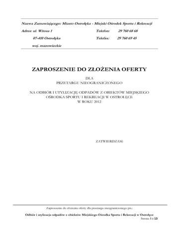 Nazwa Zamawiającego: Miasto Ostrołęka - Miejski Ośrodek Sportu i Rekreacji Adres: ul. Witosa 1 07-410 Ostrołęka Telefon: 29 760 68 68 Telefax: 29 760 69 45 woj. mazowieckie ZAPROSZENIE DO ZŁOŻENIA OFERTY DLA PRZETARGU NIEOGRANICZONEGO NA ODBIÓR I UTYLIZACJĘ ODPADÓW Z OBIEKTÓW MIEJSKIEGO OŚRODKA SPORTU I REKREACJI W OSTROŁĘCE W ROKU 2012 ZATWIERDZAM: Zaproszenie do złożenia oferty dla przetargu nieograniczonego pn.: Odbiór i utylizacja odpadów z obiektów Miejskiego Ośrodka Sportu i Rekreacji w Ostrołęce Strona 1 z 13 Zapraszam do złożenia oferty na odbiór i utylizację odpadów z obiektów Miejskiego Ośrodka Sportu i Rekreacji w Ostrołęce w 2012 roku. § 1 – Nazwa i adres Zamawiającego. Zamawiający: Miasto Ostrołęka – Miejski Ośrodek Sportu i Rekreacji Adres: ul. Witosa 1, 07-410 Ostrołęka Telefon: 29 760 68 68 Telefax: 29 760 69 45 Konto bankowe: BPS 29 1930 1666 2340 0336 2039 0007 Numer NIP: 758-000-27-80 Numer REGON: 000329349 e-mail: [email protected] URL: www.mosir.ostroleka.pl § 2 – Tryb udzielenia zamówienia Wykonawca wyłoniony zostanie zgodnie z Zarządzeniem Nr 15/2008 Dyrektora Miejskiego Ośrodka Sportu i Rekreacji w Ostrołęce z dnia 21 października 2008 roku. § 3 – Opis przedmiotu zamówienia 1. Przedmiotem zamówienia jest odbiór i utylizacja odpadów z następujących obiektów MOSiR Ostrołęka: a) Zespół Kortów Tenisowych, ul. Hallera b) Hala Sportowa, ul. Partyzantów c) Hala Sportowo – Widowiskowa, ul. Traugutta d) Hotel, ul. Witosa e) Targowisko Miejskie, ul. Prądzyńskiego f) Targowisko Miejskie, ul. Targowa Zaproszenie do złożenia oferty dla przetargu nieograniczonego pn.: Odbiór i utylizacja odpadów z obiektów Miejskiego Ośrodka Sportu i Rekreacji w Ostrołęce Strona 2 z 13 g) Targowisko Miejskie, ul. Westerplatte h) Stadion, ul. Witosa 2. Zgodnie z Rozporządzeniem Ministra Środowiska z 27 września 2001 roku w sprawie katalogu odpadów (Dz. U. nr 112, poz. 1206) odbiór odpadów odbywać się będzie w następujący sposób: Lp. Miejsce odbioru odpadów Liczba pojemników Rodzaj pojemników Symbol katalogowy odpadów Częstotliwość odbioru 1. Korty Tenisowe, ul. Hallera 1 MGB 240 Grupa 200301 na zgłoszenie telefoniczne 2. Hala Sportowa, ul. Partyzantów 1 MGB 120 Grupa 200301 co 14 dni Hala Sportowo3. Widowiskowa, ul. Traugutta 1 KP-7 Grupa 200301 na zgłoszenie telefoniczne 4. Hotel, ul. Witosa 2 MGB 1100 Grupa 200301 na zgłoszenie telefoniczne 5. Targowisko Miejskie, ul. Targowa 1 KP-7 Grupa 200302 na zgłoszenie telefoniczne 1 KP-7 Grupa 200302 5 MGB 1100 Grupa 200302 1 KP-7 Grupa 200301 Targowisko Miejskie, ul. Westerplatte Targowisko Miejskie, 7. ul. Prądzyńskiego 6. 8. Stadion, ul. Witosa 1 na zgłoszenie telefoniczne na zgłoszenie telefoniczne na zgłoszenie telefoniczne § 4 – Termin wykonania zadania Umowa na odbiór odpadów zawarta zostanie na okres od 1 stycznia 2012 roku do 31 grudnia 2012 roku włącznie. § 5 – Opis warunków udziału w postępowaniu oraz opis oceny spełniania tych warunków 1. O udzielenie zamówienia mogą ubiegać się Wykonawcy, którzy: a) posiadają uprawnienia do wykonania określonej działalności lub czynności, jeśli ustawy nakładają obowiązek posiadania takich uprawnień, b) posiadają niezbędną wiedzę i doświadczenie oraz dysponują potencjałem technicznym i osobami zdolnymi do wykonania zamówienia, Zaproszenie do złożenia oferty dla przetargu nieograniczonego pn.: Odbiór i utylizacja odpadów z obiektów Miejskiego Ośrodka Sportu i Rekreacji w Ostrołęce Strona 3 z 13 c) znajdują się w sytuacji ekonomicznej i finansowej zapewniającej wykonanie zamówienia. 2. Zamawiający oceni spełnienie warunków udziału w postępowaniu na podstawie dokumentów załączonych do oferty. 3. Wykonawca musi wykazać spełnienie każdego z warunków. 4. Niespełnienie któregokolwiek warunku spowoduje wykluczenie wykonawcy z postępowania. § 6 – Informacja o oświadczeniach i dokumentach, jakie mają dostarczyć Wykonawcy w celu potwierdzenia spełnienia warunków udziału w postępowaniu 1. Oferent zobowiązany jest do dostarczenia następujących dokumentów: a) Aktualnego odpisu właściwego rejestru albo aktualnego zaświadczenia o wpisie do ewidencji działalności gospodarczej, jeżeli odrębne przepisy wymagają wpisu do rejestru lub zgłoszenia do ewidencji działalności gospodarczej, wystawionego nie wcześniej niż 6 miesięcy przed upływem terminu składania ofert. b) Aktualnych zaświadczeń właściwego Naczelnika Urzędu Skarbowego oraz właściwego oddziału Zakładu Ubezpieczeń Społecznych lub Kasy Rolniczego Ubezpieczenia Społecznego potwierdzających odpowiednio, że Wykonawca nie zalega z opłaceniem podatków, opłat oraz składek na ubezpieczenie zdrowotne i społeczne, lub zaświadczeń, że uzyskał przewidziane prawem zwolnienie, odroczenie lub rozłożenie na raty zaległych płatności lub wstrzymanie w całości wykonania decyzji właściwego organu – wystawionych nie wcześniej niż 3 miesiące przed upływem terminu składania ofert. c) Aktualnej informacji z Krajowego Rejestru Karnego w zakresie określonym art. 24 ust. 1 pkt. 4-8 ustawy, wystawionej nie wcześniej niż 6 miesięcy przed upływem terminu składania ofert. d) Aktualnej informacji z Krajowego Rejestru Karnego w zakresie określonym art. 24 ust. 1 pkt. 9 ustawy, wystawionej nie wcześniej niż 6 miesięcy przed upływem terminu składania ofert. e) Oświadczenia o spełnieniu warunków udziału w postępowaniu i nie podleganiu wykluczeniu zgodnie z art. 22 ust. 1 i art. 24 ust. 1 i 2 Pzp. 2. W celu potwierdzenia opisanego przez Zamawiającego warunku dysponowania potencjałem technicznym, Zamawiający żąda: Zaproszenie do złożenia oferty dla przetargu nieograniczonego pn.: Odbiór i utylizacja odpadów z obiektów Miejskiego Ośrodka Sportu i Rekreacji w Ostrołęce Strona 4 z 13 a) Oświadczenia oferenta, iż posiada wszystkie rodzaje