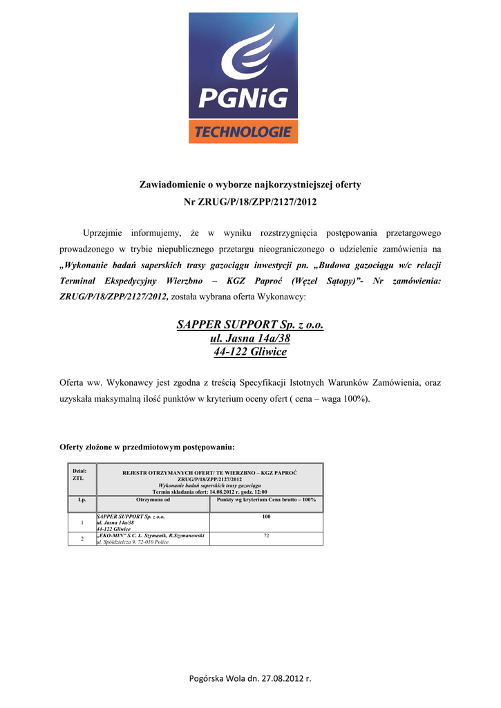 Zawiadomienie o wyborze najkorzystniejszej oferty Nr ZRUG/P/18/ZPP/2127/2012 Uprzejmie informujemy, że w wyniku rozstrzygnięcia postępowania przetargowego prowadzonego w trybie niepublicznego przetargu nieograniczonego o udzielenie zamówienia na „Wykonanie badań saperskich trasy gazociągu inwestycji pn. „Budowa gazociągu w/c relacji Terminal Ekspedycyjny Wierzbno – KGZ Paproć (Węzeł Sątopy)”- Nr zamówienia: ZRUG/P/18/ZPP/2127/2012, została wybrana oferta Wykonawcy: SAPPER SUPPORT Sp. z o.o. ul. Jasna 14a/38 44-122 Gliwice Oferta ww. Wykonawcy jest zgodna z treścią Specyfikacji Istotnych Warunków Zamówienia, oraz uzyskała maksymalną ilość punktów w kryterium oceny ofert ( cena – waga 100%). Oferty złożone w przedmiotowym postępowaniu: Dział: ZTL Lp. 1 2 REJESTR OTRZYMANYCH OFERT/ TE WIERZBNO – KGZ PAPROĆ ZRUG/P/18/ZPP/2127/2012 Wykonanie badań saperskich trasy gazociągu Termin składania ofert: 14.08.2012 r. godz. 12:00 Otrzymana od Punkty wg kryterium Cena brutto – 100% SAPPER SUPPORT Sp. z o.o. ul. Jasna 14a/38 44-122 Gliwice „EKO-MIN” S.C. L. Szymanik, R.Szymanowski ul. Spółdzielcza 9, 72-010 Police 100 72 Pogórska Wola dn. 27.08.2012 r.