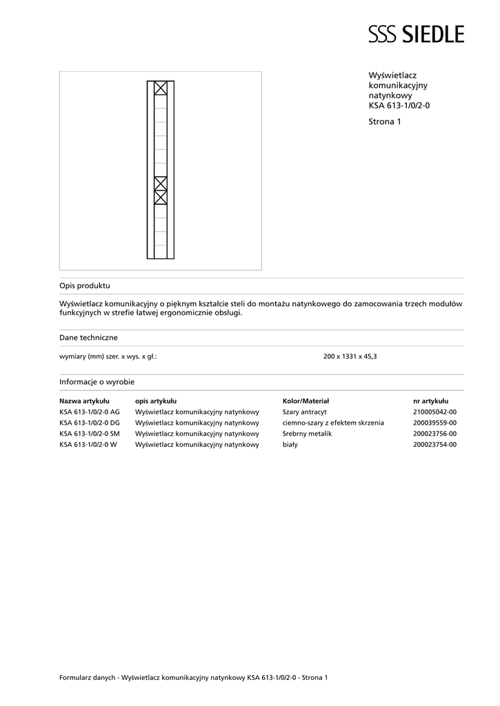 Wyświetlacz komunikacyjny natynkowy KSA 613-1/0/2-0 Strona 1 Opis produktu Wyświetlacz komunikacyjny o pięknym kształcie steli do montażu natynkowego do zamocowania trzech modułów funkcyjnych w strefie łatwej ergonomicznie obsługi. Dane techniczne wymiary (mm) szer. x wys. x gł.: 200 x 1331 x 45,3 Informacje o wyrobie Nazwa�artykułu opis�artykułu Kolor/Materiał nr�artykułu KSA 613-1/0/2-0 AG Wyświetlacz komunikacyjny natynkowy Szary antracyt 210005042-00 KSA 613-1/0/2-0 DG Wyświetlacz komunikacyjny natynkowy ciemno-szary z efektem skrzenia 200039559-00 KSA 613-1/0/2-0 SM Wyświetlacz komunikacyjny natynkowy Srebrny metalik 200023756-00 KSA 613-1/0/2-0 W Wyświetlacz komunikacyjny natynkowy biały 200023754-00 Formularz danych - Wyświetlacz komunikacyjny natynkowy KSA 613-1/0/2-0 - Strona 1 Wyświetlacz komunikacyjny natynkowy KSA 613-1/0/2-0 Strona 2 Osprzęt Nazwa�artykułu opis�artykułu Kolor/Materiał nr�artykułu Vario 611 AG Lakier naprawczy Szary antracyt 210005171-00 Vario 611 DG Lakier naprawczy ciemno-szary z efektem skrzenia 200039946-01 Vario 611 SM Lakier naprawczy Srebrny metalik 200039937-01 Vario 611 W Lakier naprawczy biały 200039936-01 ZVM/KSA 611-0 Osprzęt-Mufa łącząca szary 200021207-00 Formularz danych - Wyświetlacz komunikacyjny natynkowy KSA 613-1/0/2-0 - Strona 2 Wyświetlacz komunikacyjny natynkowy KSA 613-1/0/2-0 Strona 3 Formularz danych - Wyświetlacz komunikacyjny natynkowy KSA 613-1/0/2-0 - Strona 3 Wyświetlacz komunikacyjny natynkowy KSA 613-1/0/2-0 Strona 4 Informacja o produktach Formularz danych - Wyświetlacz komunikacyjny natynkowy KSA 613-1/0/2-0 - Strona 4 725 kB Pobieranie