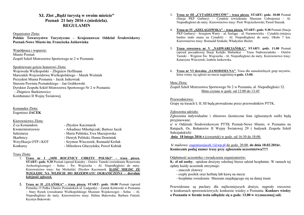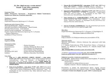 XL Zlot „Bądź turystą w swoim mieście” Poznań 21 luty 2016 r.(niedziela). REGULAMIN 3. Trasa nr III „CYTADELOWCÓW” - trasa piesza. START: godz. 10.00 Poznań (Stacja PKP Garbary) – Cytadela (zwiedzanie Muzeum Uzbrojenia) - Al. Niepodległości do mety. Kierownictwo trasy: Piotr Wojciechowski; Paweł Staszak. 4. Trasa nr IV „SZELĄGOWSKA” – trasa piesza. START: godz. 9.30 Poznań (Stacja PKP Garbary) – brzegiem Warty – ul. Szeląga – ul. Naramowicka – Cytadela (miejsca bardzo mało znane na Cytadeli) – Al. Niepodległości do mety. Około 7 km. Kierownictwo trasy: Romuald Szukała; Władysław Bezler. 5. Trasa rowerowa nr V „NADWARCIAŃSKA”. START: godz. 11.00 Poznań (sprzed początkowej Stacji Kolejki Maltanka) – Trasa Nadwarciańska – Ostrów Tumski – Wzgórze Św. Wojciecha - Al. Niepodległości do mety. Kierownictwo trasy: Katarzyna Wieczorek; Izabela Jankowska. 6. Trasa nr VI dowolna „SAMODZIELNA”. Trasa dla samodzielnych grup turystów, które winny się zgłosić na mecie najpóźniej o godz. 13:00. Organizator Zlotu: Polskie Towarzystwo Turystyczno – Krajoznawcze Oddział Środowiskowy Poznań-Nowe Miasto im. Franciszka Jaśkowiaka Współpraca i wsparcie: Miasto Poznań Zespół Szkół Mistrzostwa Sportowego nr 2 w Poznaniu Spodziewani goście honorowi Zlotu: Wojewoda Wielkopolski – Zbigniew Hoffmann Marszałek Województwa Wielkopolskiego – Marek Woźniak Prezydent Miasta Poznania – Jacek Jaśkowiak Starosta Powiatu Poznańskiego – Jan Grabkowski Dyrektor Zespołu Szkół Mistrzostwa Sportowego Nr 2 w Poznaniu – Zbigniew Burkietowicz Kombatanci II Wojny Światowej Meta Zlotu: Zespół Szkół Mistrzostwa Sportowego Nr 2 w Poznaniu, al. Niepodległości 32. Meta czynna w godz. od 12:00 do 13:45 Przewodnictwo: Grupy na trasach I; II; III będą prowadzone przez przewodników PTTK. Komandor Zlotu: Eugeniusz JACEK Kierownictwo Zlotu: Z-ca Komandora Kwatermistrzowie Sekretarze Skarbnicy Weryfikacja OTP i KOT Konkursy - Zbysław Kaczmarek - Arkadiusz Mikołajczak; Bartosz Jacek - Maria Pelińska; Ewa Maciejewska - Henryk Peliński; Hanna Dominiak - Szymon Wieczorek; Romuald Królak - Miłosława Głaczyńska; Paweł Kubiak Zgłoszenia udziału: Zgłoszenia indywidualne i zbiorowe (konieczna lista zgłaszanych osób) będą przyjmowane: a/ w Oddziale Środowiskowym PTTK Poznań-Nowe Miasto, w Poznaniu na Ratajach, Os. Bohaterów II Wojny Światowej 29 ( budynek Zespołu Szkół Salezjańskich) dnia 18 lutego 2016 r.(czwartek) w godz. od 16:30 do 18:00. b/ mailowo: [email protected] do godz. 20.00, do dnia 18.02.2016r. Koniecznie podaj numer trasy przy zgłoszeniu uczestnictwa!!!!! Trasy Zlotu: 1. Trasa nr I „1050 ROCZNICY CHRZTU POLSKI” - trasa piesza. START: godz. 9.30 Poznań (sprzed Katedry - Ostrów Tumski (zwiedzanie Rezerwatu Archeologicznego) - Solna - Św. Wojciecha - Al. Niepodległości do mety. Kierownictwo trasy: Jan Michalski; Zbysław Kaczmarek. ILOŚĆ MIEJSC ZE WZGLĘDU NA WEJŚCIE DO REZERWATU OGRANICZONA – decyduje kolejność zgłoszeń. Odpłatność uczestnika i świadczenia organizatorów: 8,- zł od osoby; opiekun drużyny szkolnej bierze udział bezpłatnie. W ramach tej opłaty każdy uczestnik otrzymuje: - znaczek zlotowy - ciepły posiłek oraz herbatę lub kawę na mecie - bezpłatne zwiedzanie Muzeum znajdującego się na danej trasie 2. Trasa nr II „UŁAŃSKA” - trasa piesza. START: godz. 10.00 Poznań (sprzed Pomnika 15 Pułku Ułanów Poznańskich ul. Ludgardy) – Zamek Królewski w Poznaniu – Stary Rynek (zwiedzanie Wielkopolskiego Muzeum Wojskowego) - Solna - Al. Niepodległości do mety. Kierownictwo trasy: Halina Bukowska; Barbara Fintzel; Krystyn Bukowski Przewidziane są puchary dla najliczniejszych drużyn, nagrody rzeczowe w konkursach sprawnościowych; konkursie wiedzy o Poznaniu. Konkurs wiedzy o Poznaniu w formie testu odbędzie się o godz. 13.00 w wyznaczonej sali. Uwaga! W przypadku zgłoszeń po podanym terminie, organizatorzy zastrzegają sobie prawo do nie zapewnienia pełnych świadczeń. Uczestnicy tras rowerowych muszą posiadać kaski; przestrzegać przepisy ruchu drogowego. Wszyscy muszą wykonywać polecenia kierowników tras i przewodników. Każda drużyna winna posiadać apteczkę. ŻYCZYMY SŁONECZNEJ POGODY! Rajd dofinansowano z środków: 1050 ROCZNICA CHRZTU POLSKI ROK KRAJOZNAWSTWA POLSKIEGO XL ZLOT BĄDŹ TURYSTĄ W SWOIM MIEŚCIE Poznań 21.02.2016r (niedziela)