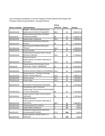 Lista rankingowa projektów w ramach Programu Działaj Lokalnie 2013 (edycja VIII) Fundacja Lokalna Grupa Działania - Naszyjnik Północy Numer wniosku Wnioskodawca Miejsko - Gminny Ośrodek Pomocy Społecznej w Kamieniu Krajeńskim 345/2013/33 Stowarzyszenie Na Rzecz Inicjatyw Lokalnych proIDEA 24/2013/33 410/2013/33 Zespół Szkół w Debrznie Stowarzyszenie Rozwoju Sołectwa Brzeźno 246/2013/33 Stowarzyszenie Kobiet Aktywnych "Malwa" 157/2013/33 229/2013/33 Gmina Koczała Towarzystwo Przyjaciół Dzieci Zarząd Gminny w Okonku 152/2013/33 Gminne Centrum Kultury,Sportu,Turystyki i Rekreacji w Rzeczenicy 240/2013/33 Stowarzyszenie Dla Rozowju Starej Wiśniewki i Okolic "GROMADA" 2/2013/33 144/2013/33 241/2013/33 354/2013/33 378/2013/33 243/2013/33 275/2013/33 297/2013/33 304/2013/33 296/2013/33 422/2013/33 36/2013/33 426/2013/33 Ocena końcowa Status Dotacja 36,5 D 3 001,67 zł 36 35,5 D D 2 626,67 zł 3 296,66 zł 35 D 4 750,00 zł 34,5 34 D D 4 500,00 zł 3 620,00 zł 33,5 D 4 750,00 zł 33,5 D 2 740,00 zł 33 D 4 650,00 zł Gminne Centrum Kultury w Przechlewie Stowarzyszenie ""Na Rzecz Rozwoju Miasta i Gminy Debrzno" Gmina Czarne Gmina Lipka 32,5 D 4 710,00 zł 32,5 32,5 32,5 D D D 2 080,00 zł 2 750,00 zł 4 500,00 zł Kamieńskie Towarzystwo Kulturalne Samodzielne Koło Terenowe Społecznego Towarzystwa Oświatowego nr 131 w Człuchowie Stowarzyszenie Sabat Człuchowskich Szefowych Gminne Centrum Kultury,Sportu,Turystyki i Rekreacji w Rzeczenicy Stowarzyszenie Pro Kultura Zespół Szkół w Debrznie Salezjańska Organizacjaa Sportowa Rzeczpospolitej Polskiej Stowarzyszenie "Strefa Kultury" w Zakrzewie 32 D 2 375,00 zł 32 D 2 375,00 zł 32 D 2 375,00 zł 28,5 0 0 D OF OF 2 000,00 zł 0,00 zł 0,00 zł 27,5 OM 0,00 zł 27 OM 0,00 zł 307/2013/33 44/2013/33 119/2013/33 387/2013/33 331/2013/33 206/2013/33 423/2013/33 270/2013/33 Miejsko - Gminny Ośrdoek Kultury w Kamieniu Krajeńskim Polski Związek Emerytów,Rencistów i Inwalidów Zarząd Rejonowy w Okonku Stowarzyszenie Inicjatyw Lokalnych Horyzont Szkoła Podstawowa w Starym Gronowie Stowarzyszenie "Nad Głomią" Ochotnicza Straż Pożarna w Lotyniu Wielkopolskie Stowarzyszenie Społeczno - Gospodarcze Miejski Klub Sportowy Debrzno OF- odrzucony na etapie oceny formalnej OM-odrzucony na etapie oceny merytorycznej D-dofinansowany 26,5 OM 0,00 zł 26 OM 0,00 zł 25,5 OM 0,00 zł 24,5 23 21,5 OM OM OM 0,00 zł 0,00 zł 0,00 zł 21,5 21 OM OM 0,00 zł 0,00 zł