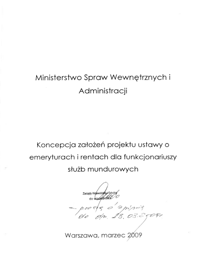 Ministerstwo Spraw Wewnętrznych i Administracji Koncepcja założeń projektu ustawy o emeryturach i rentach dla funkcjonariuszy służb mundurowych I. Opis obecnego systemu emerytalnego służb mundurowych 1. Stan faktyczny Zaopatrzeniowy systemu system emerytalny emerytalnego. funkcjonuje Świadczenia niezależnie emerytalne, renty od powszechnego inwalidzkie oraz renty rodzinne sq wypłacane ze środków budżetu państwa. Uposażenia funkcjonariuszy służb mundurowych nie sq objęte składkami na ubezpieczenie emerytalne czy rentowe. Do otrzymania emerytury lub renty inwalidzkiej z zaopatrzeniowego systemu emerytalnego służb mundurowych uprawnieni sq byli funkcjonariusze Policji, Agencji Bezpieczeństwa Wewnętrznego, Agencji Wywiadu, Służby Kontrwywiadu Wojskowego, Służby Wywiadu Wojskowego, Centralnego Biura Antykorupcyjnego, Straży Granicznej, Biura Ochrony Rzqdu, Państwowej Straży Pożarnej. Świadczenia te sq wypłacane przez właściwe organy emerytalne: w stosunku do byłych funkcjonariuszy Policji, ABW, AW, CBA, SG, BOR oraz PSP wypłaty sq realizowane przez Zakład Emerytalno-Rentowy Ministerstwa Spraw Wewnętrznych. Emerytury i renty inwalidzkie dla byłych funkcjonariuszy SW wypłaca Biuro Emerytalne Służby Więziennej. Wypłaty świadczeń dla emerytów z SKW i SWW majq dokonywać wojskowe biura emerytalne. Te same organy emerytalne dokonuję również wypłaty rent rodzinnych na rzecz uprawnionych osób. Świadczenia emerytalne z zaopatrzeniowego systemu emerytalnego służb mundurowych otrzymuje łgcznie 209 158 osób (grudzień 2008r.), z tego: 182 147 wypłacanych przez ZER MSWiA, 27 011 wypłacanych przez BESW. ZER MSWiA BESW kjcznie emerytury 130 659 19 083 149 742 renty inwalidzkie 14511 2 112 16 623 renty rodzinne 36 977 5816 42 793 razem 182 147 27 011 209 158 Oprócz zaopatrzeniowego systemu służb mundurowych funkcjonuje, na analogicznych zasadach, zaopatrzeniowy system emerytalny żołnierzy zawodowych. 2 Świadczenia z tego systemu sq wypłacane przez 15 wojskowych biur emerytalnych, znajdujgcych się w każdym województwie (wspólne biuro dla województwa śląskiego i opolskiego). Wojskowe organy emerytalne wypłacają ponad 157 tys. świadczeń (dane za rok 2007). Liczba świadczeniobiorców ZER MSWiA (emerytury, renty inwalidzkie, renty rodzinne, stan na koniec roku) rok świadczeniobiorcy wzrost 2001 155 758 2002 157 695 1,24% 2003 159 934 1,42% 2004 162 740 1,75% 2005 166 311 2,19% 2006 171 647 3,21% 2007 178 244 3,84% 2008 182 147 2,19% Liczba nowych świadczeń emerytalnych przyznanych przez ZER MSWiA według stażu w służbie (liczbowo) staż w 15 1. 16 1. 171. 181. 191. 201 21-25 1. pow. 25 1. razem 2001 450 263 206 161 159 215 742 634 2830 2002 385 235 267 197 202 259 982 954 3481 2003 474 246 237 222 221 304 1188 1151 4043 2004 638 271 287 287 276 392 1465 1429 5045 2005 473 432 366 307 301 427 1835 1827 5968 2006 702 381 585 361 370 583 2738 2962 8682 służbie: 3 2007 549 450 455 590 410 536 2678 1948 7616 2008 407 304 375 338 486 390 1915 1461 5673 Liczba przyznanych nowych świadczeń emerytalnych według stażu w służbie (procentowo) staż w służbie: 15 1. 16 1. 171. 181. 191. 20 1 21-25 1. pow. 25 1. 2001 15,90% 9,29% 7,28% 5,69% 5,62% 7,60% 26,22% 22,40% 2002 11,06% 6,75% 7,67% 5,66% 5,80% 7,44% 28,21% 27,41% 2003 11,72% 6,08% : 5,86% 5,49% 5,47% 7,52% 29,38% 28,47% 2004 12,65% 5,37% 5,69% 5,69% 5,47% 7,77% 29,04% 28,33% 2005 7,93% 7,24% 6,13% 5,14% 5,04% 7,15% 30,75% 30,61% 2006 8,09% 4.39% 6,74% 4,16% 4,26% 6,72% 31,54% 34,12% 2007 7,21% 5,97% 7,75% 5,38% 7,04% 35,16% 25,58% 2008 7,17% 6,61% 5,96% 8,57% 6,87% 33,70% 25,75% 5,91% 5,36% Liczba przyznanych nowych świadczeń emerytalnych według stażu w służbie (procentowo) nowe świadczenia nowe świadczenia słaż 15-25 1. słaż powyżej 25 1. 2001 77,60% 22,40% 2002 72,59% 27,41% 2003 71,53% 28,47% 2004 71,67% 28,33% 2005 69,39% 30,61% 2006 65,88% 34,12% 2007 74,42% 25,58% rok 4 2008 25,75% 74,25% Łączna wysokość świadczeń wypłacanych przez ZER MSWiA wzrost w stosunku do roku rok łączna wysokość świadczeń 2001 3 374 806 678 zł 2002 3 507 734 365 zł 3,93% 2003 3 665 266 946 zł 4.49% 2004 3 829 916 227 zł 4,49% 2005 3 995 688 348 zł 4,32% 2006 4 366 831 647 zł 9,28% 2007 4 721 275 456 zł 8,11% 2008 5 137 164 000 zł 8,81% 5 poprzedniego 2. Stan prawny Wypłata świadczeń emerytalnego służb emerytalnych mundurowych i rentowych jest z obecnie zaopatrzeniowego realizowana w systemu oparciu o następujące akty prawne: 1. ustawa z dnia 18 lutego 1994r. o zaopatrzeniu emerytalnym funkcjonariuszy Policji, Agencji Bezpieczeństwa Wewnętrznego, Agencji Wywiadu, Służby Kontrwywiadu Wojskowego, Służby Wywiadu Wojskowego, Centralnego Biura Antykorupcyjnego, Straży Granicznej, Biura Ochrony Rzqdu, Państwowej Straży Pożarnej i Służby Więziennej oraz ich rodzin (Dz. U. z 2004r. Nr 8, poz, 67 z późn. zm.) 2. akty wykonawcze: rozporządzenie Ministra Spraw Wewnętrznych z dnia 16 stycznia 1995r. w sprawie zasad orzekania o inwalidztwie funkcjonariuszy Policji, Urzędu Ochrony Państwa, Straży Granicznej, Państwowej Straży Pożarnej, Służby Więziennej, emerytów i rencistów policyjnych, tryb postępowania i właściwość komisji lekarskich w tych sprawach, sposób przeprowadzania kontrolnych badań lekarskich oraz wzywanie inwalidów na te badania (Dz. U. Nr 8, poz. 41 z późn. zm.) rozporządzenie z dnia 20 sierpnia 2003r.Prezesa Rady Ministrów w sprawie orzekania o inwalidztwie funkcjonariuszy Agencji Bezpieczeństwa Wewnętrznego i Agencji Wywiadu, emerytów i rencistów Urzędu Ochrony Państwa, Agencji Bezpieczeństwa Wewnętrznego i Agencji Wywiadu (Dz. U. Nr 160, poz. 1552 z późn. zm.) rozporządzenie Ministra Sprawiedliwości z dnia 19 grudnia 2003r. w sprawie zwrotu kosztów przejazdów osób wezwanych do stawiennictwa przez organ emerytalny (Dz. U. Nr 227, poz. 2253) 6 rozporządzenie Ministra Sprawiedliwości z dnia 19 grudn