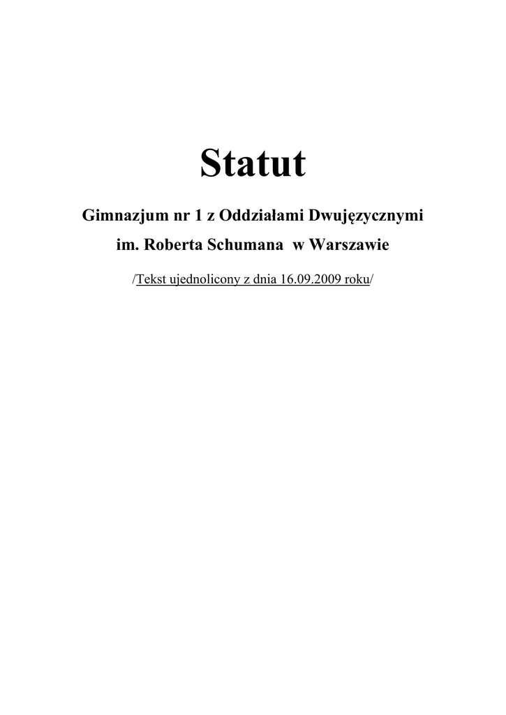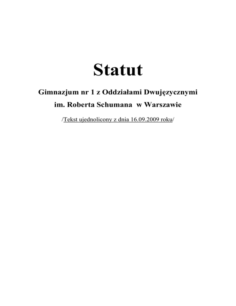 Statut Gimnazjum nr 1 z Oddziałami Dwujęzycznymi im. Roberta Schumana w Warszawie /Tekst ujednolicony z dnia 16.09.2009 roku/ Podstawy prawne do statutu Niniejszy statut został znowelizowany na podstawie następujących aktów prawnych: 1. Ustawa z dnia 7 września 1991 r. o systemie oświaty z późn. zm.; 2. Ustawy z dnia 26 stycznia 1982 r. – Karta Nauczyciela z późn. zm.; 3. Rozporządzenia MENiS z dnia 26 marca 2004 r. w sprawie ramowych statutów z późn. zm.; 4. Rozporządzenia MENiS z dnia 27 sierpnia 2001 r. w sprawie warunków i trybu przyjmowania uczniów ... oraz przechodzenia z jednych typów szkół do innych; 5. Rozporządzenia MENiS z dnia 18 kwietnia 2002 r. w sprawie organizacji roku szkolnego z późn. zm.; 6. Rozporządzenia MENiS z dnia 21 marca 2001 r. w sprawie warunków i sposobu oceniania, klasyfikowania i promowania ... z późn. zm.; 7. Rozporządzenia MENiS z dnia 9 kwietnia 2002 r. w sprawie warunków prowadzenia działalności innowacyjnej i eksperymentalnej; 8. Rozporządzenia MENiS z dnia 12 lutego 2002 r. w sprawie ramowych planów nauczania w szkołach publicznych; 9. Rozporządzenia MENiS z dnia 24 kwietnia 2002 r. w sprawie warunków i trybu dopuszczania do użytku szkolnych programów nauczania ...; 10. Konwencji o Prawach Dziecka ratyfikowanej przez Polskę w 1991 r.; 11. Powszechnej Deklaracji Praw Człowieka z dnia 10 grudnia 1948 r.; 12. Ustawy z dnia 14 czerwca 1960 r. – Kodeks postępowania administracyjnego; 13. Rozporządzenia MENiS z dnia 7 stycznia 2003 r. w sprawie zasad udzielania i organizacji pomocy psychologiczno-pedagogicznej w publicznych przedszkolach, szkołach i placówkach (Dz. U. Nr 11 z 2003r., poz.114); 14. Rozporządzenia MEN z dnia 9 lutego 2007 r. zmieniające rozporządzenie w sprawie ramowych statutów publicznego przedszkola oraz publicznych szkół; 15. Ustawy z dnia 25 lipca 2008 r. o zmianie ustawy o systemie oświaty, ustawy – Karta Nauczyciela oraz ustawy o postępowaniu w sprawach nieletnich (Dz. U. z dnia 8 sierpnia 2008 r.); 16. Rozporządzenia MENiS z dnia 21 maja 2001 r. w sprawie ramowych statutów publicznego przedszkola i publicznych szkół, Załącznik Nr 3 §1 ust. 1 pkt 1 – dot. sposobu określania w statucie publicznego gimnazjum nazwy gimnazjum dwujęzycznego jako „Gimnazjum z Oddziałami Dwujęzycznymi”, Załącznik Nr 3 §2 ust.1 pkt 5 – dot. określania w statucie gimnazjum organizacji oddziałów dwujęzycznych; 17. Rozporządzenia MENiS z dnia 20 lutego 2004 r. w sprawie warunków i trybu przyjmowania uczniów do szkół publicznych oraz przechodzenia z jednych typów szkół do innych, §5 pkt 3 – dot. przeprowadzania sprawdzianów uzdolnień kierunkowych dla kandydatów do oddziałów 2 dwujęzycznych gimnazjów, §5 pkt 4 – dot. terminu ogłaszania przez dyrektorów gimnazjów dwujęzycznych kryteriów i warunków przyjęć. 18. Zmiany wprowadzone w ustawie z dnia 7 września 1991 r. o systemie oświaty na podstawie ustawy nowelizującej, uchwalonej w dniu 7 września 2007 r., obejmującą m.in. następujące zagadnienia: „Szkoła dwujęzyczna”, „oddział dwujęzyczny” (zmiany w art. 2 pkt 2 lit. b i c, art. 3 pkt 2a-2d, art. 58 ust. 2a i art. 62 ust. 5c ustawy o systemie oświaty); 19. Rozporządzenia MEN z dnia 18 września 2008 r. w sprawie sposobu i trybu organizowania indywidualnego obowiązkowego rocznego przygotowania przedszkolnego i indywidualnego nauczania dzieci i młodzieży (Dz. U. Nr 175 z 2008 r., poz. 1086), oraz w sprawie orzeczeń i opinii wydawanych przez zespoły orzekające w publicznych poradniach psychologicznopedagogicznych (Dz. U. z 2008 r. Nr 173, poz. 1072); 20. Rozporządzenia MEN z dnia 23 grudnia 2008 r. w sprawie podstawy programowej wychowania przedszkolnego oraz kształcenia ogólnego w poszczególnych typach szkół (Dz. U. z 2009 r.); 21. Rozporządzenia MEN z dnia 6 stycznia 2009 r. w sprawie dopuszczenia do użytku szkolnego programów wychowania przedszkolnego, programów nauczania i podręczników oraz cofania dopuszczenia (Dz. U. z 2009 r. Nr 4, poz. 18); 22. Rozporządzenia MEN z dnia 20 lutego 2009 r. zmieniające rozporządzenie w sprawie warunków i trybu przyjmowania uczniów do szkół publicznych oraz przechodzenia z jednych typów szkół do innych 23. Ustawa z dnia 19 marca 2009 r. o zmianie ustawy o systemie oświaty art. 1 pkt 21 lit. e) i f) (Dz. U. z dnia 2009 r. Nr 56, poz. 458); 24. Rozporządzenia MEN z dnia 23 marca 2009 r. zmieniające rozporządzenie w sprawie ramowych planów nauczania w szkołach publicznych (Dz. U. Nr 54, poz. 442); 25. Rozporządzenia MEN z dnia 31 marca 2009 r. zmieniające rozporządzenie w sprawie warunków i sposobu oceniania , klasyfikacji i promowania uczniów i słuchaczy oraz przeprowadzania sprawdzianów i egzaminów w szkołach publicznych (Dz. U. Nr 58, poz. 475); 3 §1 Postanowienia ogólne 1. Gimnazjum nr 1 z Oddziałami Dwujęzycznymi im. Roberta Schumana w Dzielnicy Mokotów, zwane dalej „gimnazjum”, jest szkołą publiczną. 2. Oznaczenie siedziby gimnazjum: 02-615 Warszawa, ul. Tyniecka 25 3. Organem prowadzącym gimnazjum jest Miasto Stołeczne Warszawa. 4. Gimnazjum działa na mocy ustawy z dnia 07 września 1991 r. o systemie oświaty (Dz. U. z 2004 r. Nr 256, poz.2572 z późn. zm.), uchwały nr 39/V/99 Gminy Warszawa-Centrum z dnia 25 lutego 1999 r. w sprawie założenia gimnazjów, ustalenia planu ich sieci oraz granic ich obwodów oraz niniejszego statutu. 5. Cykl kształcenia w gimnazjum trwa 3 lata i kończy się w ostatnim roku nauki egzaminem zewnętrznym, dającym możliwość dalszego kształcenia w szkołach ponadgimnazjalnych. Dyrektor Okręgowej Komisji Egzaminacyjnej może zwolnić ucznia z przystępowania do egzaminu zewnętrznego w przypadku złożenia przez rodziców ucznia podania wraz z załączonym zaświadczeniem lekarskim do dyrektora szkoły. 6. Gimnazjum zapewnia bezpłatne nauczanie w zakresie ramowych planów nauczania uwzględniającyc
