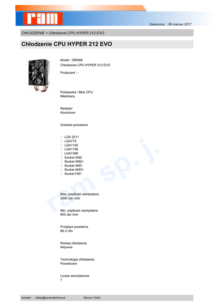 Utworzono : 08 marzec 2017 CHŁODZENIE > Chłodzenie CPU HYPER 212 EVO Chłodzenie CPU HYPER 212 EVO Model : 098368 Chłodzenie CPU HYPER 212 EVO Producent : - Podstawka / Blok CPU Miedziany Radiator Aluminium Gniazdo procesora � LGA 2011 � LGA775 � LGA1155 � LGA1156 � LGA1366 � Socket AM2 � Socket AM2+ � Socket AM3 � Socket AM3+ � Socket FM1 m a r Max. prędkość wentylatora 2000 obr./min Min. prędkość wentylatora 600 obr./min Przepływ powietrza 66.3 cfm Rodzaj chłodzenia Aktywne Technologia chłodzenia Powietrzem Liczba wentylatorów 1 kontakt : - [email protected] Strona 1/{nb} p s . j . Utworzono : 08 marzec 2017 CHŁODZENIE > Chłodzenie CPU HYPER 212 EVO Chłodzenie CPU HYPER 212 EVO Wentylator 12 cm Ilość rurek Heatpipe 4 Poziom hałasu 31 dB Wymiary 116 x 51 x 159 mm . j . Waga 104 g p s Cena : 159,00 zł Brutto ( 129,27 zł Netto) m a r Dostępność: Produkt dostępny w naszym sklepie od 18 marzec 2014 kontakt : - [email protected] Strona 2/{nb}