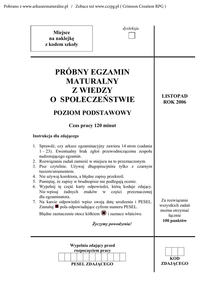Pobrano z www.arkuszematuralne.pl / Zobacz też www.ccrpg.pl ( Crimson Creation RPG ) dysleksja Miejsce na naklejkę z kodem szkoły PRÓBNY EGZAMIN MATURALNY Z WIEDZY O SPOŁECZEŃSTWIE LISTOPAD ROK 2006 POZIOM PODSTAWOWY Czas pracy 120 minut Instrukcja dla zdającego 1. Sprawdź, czy arkusz egzaminacyjny zawiera 14 stron (zadania 1 – 23). Ewentualny brak zgłoś przewodniczącemu zespołu nadzorującego egzamin. 2. Rozwiązania zadań zamieść w miejscu na to przeznaczonym. 3. Pisz czytelnie. Używaj długopisu/pióra tylko z czarnym tuszem/atramentem. 4. Nie używaj korektora, a błędne zapisy przekreśl. 5. Pamiętaj, że zapisy w brudnopisie nie podlegają ocenie. 6. Wypełnij tę część karty odpowiedzi, którą koduje zdający. Nie wpisuj żadnych znaków w części przeznaczonej dla egzaminatora. 7. Na karcie odpowiedzi wpisz swoją datę urodzenia i PESEL. Zamaluj pola odpowiadające cyfrom numeru PESEL. Błędne zaznaczenie otocz kółkiem i zaznacz właściwe. Życzymy powodzenia! Za rozwiązanie wszystkich zadań można otrzymać łącznie 100 punktów Wypełnia zdający przed rozpoczęciem pracy PESEL ZDAJĄCEGO KOD ZDAJĄCEGO 2 Próbny egzamin maturalny z wiedzy o społeczeństwie Poziom podstawowy W zadaniach 1 – 7 zakreśl prawidłową odpowiedź. Zadanie 1. (1 pkt) Proces przystosowania jednostki do życia społecznego, polegający na przyswajaniu wzorców kulturowych nazywamy A) demokratyzacją. B) stratyfikacją. C) socjalizacją. D) reedukacją. Zadanie 2. (1 pkt) Do pierwszej generacji praw człowieka należy prawo do A) korzystania z dóbr kultury. B) opieki socjalnej. C) zawierania związków partnerskich. D) wolności sumienia. Zadanie 3. (1 pkt) Nazwa państwa Rzeczpospolita Polska została przyjęta przez Sejm w roku A) 1988. B) 1989. C) 1990. D) 1991. Zadanie 4. (1 pkt) Traktaty Rzymskie z 25 marca 1957 roku powołały do życia A) Europejski Program Odbudowy. B) Europejską Wspólnotę Gospodarczą. C) Europejską Wspólnotę Węgla i Stali. D) Radę Europy. Zadanie 5. (1 pkt) Islamska fundamentalistyczna organizacja terrorystyczna działająca głównie na terenie Autonomii Palestyńskiej nazywa się A) Al Kaida. B) Bractwo Muzułmańskie. C) Hamas. D) Tupamaros. Zadanie 6. (1 pkt) Vacatio legis oznacza A) czas, jaki upływa między przedłożeniem uchwalonej ustawy do podpisania prezydentowi a jej podpisaniem. B) czas, jaki upływa od momentu złożenia projektu ustawy w Sejmie do jego pierwszego czytania. C) okres między dniem ogłoszenia ustawy a dniem jej wejścia w życie. D) okres między uchwaleniem ustawy przez Sejm a jej rozpatrzeniem przez Senat. Próbny egzamin maturalny z wiedzy o społeczeństwie Poziom podstawowy 3 Zadanie 7. (1 pkt) Nadzór nad działalnością sądów powszechnych i wojskowych w zakresie orzekania sprawuje w Polsce A) Naczelny Sąd Administracyjny. B) Najwyższa Izba Kontroli. C) Sąd Najwyższy. D) Trybunał Konstytucyjny. Zadanie 8. (4 pkt) Opisanym zasadom ustrojowym demokratycznego państwa prawnego przyporządkuj właściwe określenia. 1. Zasada pluralizmu politycznego 2. Zasada trójpodziału władzy 3. Zasada praworządności 4. Zasada suwerenności narodu A) Najwyższa władza zwierzchnia należy do ogółu obywateli. B) Zobowiązanie do stosowania prawa, przestrzegania prawa i działanie na mocy prawa przez wszystkich uczestników życia publicznego. C) Uczestnictwo w życiu publicznym różnorodnych sił politycznych konkurujących ze sobą. D) Wyodrębnienie trzech obszarów kompetencji władzy publicznej i realizowanie każdej z nich przez inny zespół organów. E) Zasadniczą rolę odgrywa konstytucja regulująca podstawowe kwestie dla państwa i społeczeństwa. Odp.: 1. ....... 2. ....... 3. ....... 4. ....... Zadanie 9. (4 pkt) Przyporządkuj nazwy doktryn politycznych (1- 5) do zamieszczonych niżej opisów (A – D), np. E – 6. 1. anarchizm, 2. chrześcijańska demokracja, 3. konserwatyzm, 4. liberalizm, 5. socjaldemokracja A) Przyjmuje, że najwyższą wartością jest jednostka ludzka i jej szczęście, a jedyną granicą wolności człowieka jest wolność innych ludzi. Uznaje równość wszystkich ludzi w sensie równego prawa do wolności. Kładzie nacisk na wolność dysponowania własnością. Zakłada ograniczenie działalności państwa do zapewnienia praw jednostki oraz zapewnienia bezpieczeństwa. Przeciwstawia się ingerencji państwa w sprawy moralne i decydowanie o dobru obywateli. B) Zakłada budowę sprawiedliwego ładu społecznego uwzględniającego dobro i godność osoby ludzkiej. Uznaje zasadę solidaryzmu społecznego, pomocniczości i dobra wspólnego. Przyjmuje, że własność prywatna jest najlepszym, bo skutecznym gwarantem wolności i niezależności człowieka. Dopuszcza inne uspołecznione formy własności, jeśli tylko będą one służyły człowiekowi. Szczególną rolę przypisuje pracy ludzkiej, akcentując godność człowieka pracującego i przeciwstawiając się traktowaniu pracy wyłącznie jako towaru. Państwo powinno rozpoznać podmiotowość rodziny jako podstawy życia społecznego. 4 Próbny egzamin maturalny z wiedzy o społeczeństwie Poziom podstawowy C) Odwołuje się do poszanowania tradycji i uznanych zasad moralnych. Krytykując rewolucję i gwałtowne zmiany, przeciwstawia im powolne, naturalne przemiany ewolucyjne. Zakłada nieufność wobec egalitaryzmu i uniformizmu, połączoną z przekonaniem, że istnienie hierarchii warstw i grup społecznych a także elit rządzących jest nieodłącznym elementem ładu społecznego. Przyjmuje przekonanie, że własność i wolność są nierozdzielne, krytykując programy nacjonalizacji i kolektywizacji. D) Opiera się na idei uspołecznienia środków produkcji (ziemi, maszyn i surowców), tak aby służyły one wszystkim w jednakowym stopniu. Uznaje za niesprawiedliwe społeczeństwo, w którym o pozycji jednostki decyduje własność. Kładzie nacisk na uzupełnienie praw obywatelskich i polityczny