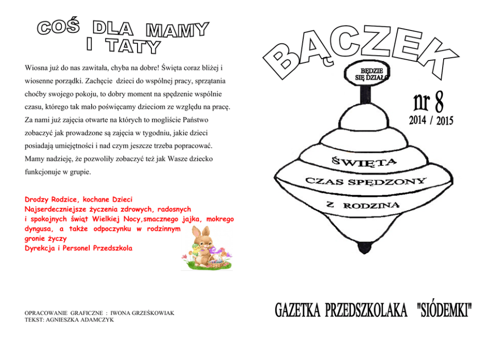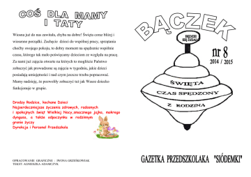 Wiosna już do nas zawitała, chyba na dobre! Święta coraz bliżej i wiosenne porządki. Zachęcie dzieci do wspólnej pracy, sprzątania choćby swojego pokoju, to dobry moment na spędzenie wspólnie czasu, którego tak mało poświęcamy dzieciom ze względu na pracę. Za nami już zajęcia otwarte na których to mogliście Państwo zobaczyć jak prowadzone są zajęcia w tygodniu, jakie dzieci posiadają umiejętności i nad czym jeszcze trzeba popracować. Mamy nadzieję, że pozwoliły zobaczyć też jak Wasze dziecko funkcjonuje w grupie. Drodzy Rodzice, kochane Dzieci Najserdeczniejsze życzenia zdrowych, radosnych i spokojnych świąt Wielkiej Nocy,smacznego jajka, mokrego dyngusa, a także odpoczynku w rodzinnym gronie życzy Dyrekcja i Personel Przedszkola OPRACOWANIE GRAFICZNE : IWONA GRZEŚKOWIAK TEKST: AGNIESZKA ADAMCZYK KRZYŻÓWKA WIELKANOCNA W puste pola krzyżówki wpisz słowa związane z Wielkanocą. ZAGADKI Zgodnie z wielkanocnym zwyczajem słodkie upominki każdemu rozdaje…………………. W ten świąteczny dzień każdy z nas się śmieje. A woda nie z nieba, lecz z wiader się leje……………………………. Święta już blisko wiatr na dworze dmucha. A w domu na talerzu Kiełkuje……………………… W wielkanocnym koszyczku leżeć będą sobie. Zanim je tam włożę, ślicznie je ozdobię……………………... POKOLRUJ ZRÓB TO SAM Marzysz o oryginalnych dekoracjach wielkanocnego stołu? Zobacz jak w prosty sposób zrobić z wydmuszek własne małe zoo. Rzeczy, których potrzebujesz: Jajka ugotowane na twardo, Barwniki do jaj, Arkusze kolorowej pianki/mikrogumy dekoracyjnej: biały, zielony, brązowy, różowy, żółty lub pomarańczowy, małe, ostre nożyczki, Czarny marker, Klej, Przezroczysta taśma klejąca np. Żaba. Zafarbuj jajko na jasnozielony kolor, wyjmij z barwnika i pozostaw do całkowitego wyschnięcia. 2 Z zielonej pianki wytnij duże zielone półkole i dwa małe półkola z pianki białej. Te ostatnie będą one stanowiły oczy naszej żaby. Na zielonym kawałku pianki narysuj markerem usta a na białych kawałkach źrenice oczu. 3 Końcówki oczu zagnij i przyklej na czubku jajka. Zieloną piankę, stanowiąca buzię żaby, przyklej nieco poniżej oczu. Zanim klej wyschnie, pianki przymocuj do jajka taśmą klejącą. Gdy klej dobrze złapie, ostrożnie usuń taśmę. KĄCIK KUCHCIKA Cudaczny miś Prosty w wykonaniu, a do tego bardzo pożywny i niskokaloryczny! Składniki: kromka chleba ser biały szynka rzodkiewka szczypiorek suszona śliwka sałata Sposób wykonania: Ser biały nakładamy na chlebek, a na nim układamy plasterki rzodkiewki z dodatkiem szczypiorku tworząc oczy. Nosem będzie suszona śliwka, a mordką szczypiorek. Na koniec uszy – najlepiej wykonać je ze zrulowanych plasterków szynki. Tło stanowić będę liście sałaty. Gotowe!