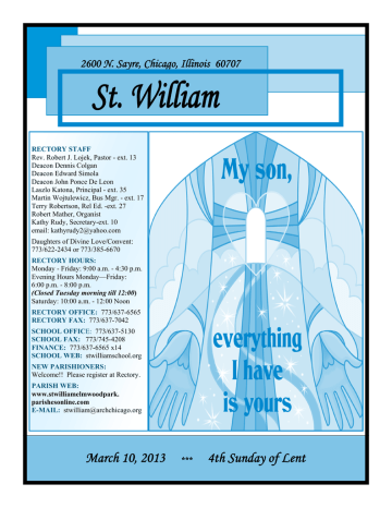 2600 N. Sayre, Chicago, Illinois 60707 St. William RECTORY STAFF Rev. Robert J. Lojek, Pastor - ext. 13 Deacon Dennis Colgan Deacon Edward Simola Deacon John Ponce De Leon Laszlo Katona, Principal - ext. 35 Martin Wojtulewicz, Bus Mgr. - ext. 17 Terry Robertson, Rel Ed. -ext. 27 Robert Mather, Organist Kathy Rudy, Secretary-ext. 10 email: [email protected] Daughters of Divine Love/Convent: 773/622-2434 or 773/385-6670 RECTORY HOURS: Monday - Friday: 9:00 a.m. - 4:30 p.m. Evening Hours Monday—Friday: 6:00 p.m. - 8:00 p.m. (Closed Tuesday morning till 12:00) Saturday: 10:00 a.m. - 12:00 Noon RECTORY OFFICE: 773/637-6565 RECTORY FAX: 773/637-7042 SCHOOL OFFICE: 773/637-5130 SCHOOL FAX: 773/745-4208 FI A CE: 773/637-6565 x14 SCHOOL WEB: stwilliamschool.org EW PARISHIO ERS: Welcome!! Please register at Rectory. PARISH WEB: www.stwilliamelmwoodpark. parishesonline.com E-MAIL: [email protected] March 10, 2013 *** 4th Sunday of Lent St. William March 10, 2013 MASS INTENTIONS SUNDAY, MARCH 10—4th Sunday of Lent 7:30am Primetta & Tom Hoban 9:00am Louis DeSalvo Raymond Urbane Marion Sutter—Happy Birthday! 10:30pm Polish Poor Souls in Purgatory Marta Marcinek—10th Death Anniv Eleonora & Andrzej Palasz Stanislaw Bogdal Bogdan—8th Death Anniv Kazimiera Kczuk Stanislawa Mularczuk Alicja Niedzialek –27th Death Anniv Roman/Stanislawa/Jan Wojciechowski Bogu Wiadomej Za wszystkich czlonkow Kola Rozancowego imienia Sw. Rity i ich Rodzin Klaudia o szczesliwa operacje Urszula jy dzicci Ann Blue & Margaret Carpino Louis DeSalvo Lucas Family 12:00pm MONDAY, MARCH 11 8:15am Chick Ricchio –(Birth Rem) Lou DeSalvo TUESDAY, MARCH 12 8:15am Zofia Glownia Ursulo Alaba WEDNESDAY, MARCH 13 8:15am Casey Pietrzyk 6:00pm Polish Jozef & Anna Lojek –God’s Blessings Peter & Children –God’s Blessings THURSDAY, MARCH 14 8:15am Joe Wawrzon (Birth Rem) FRIDAY, MARCH 15 8:15am SATURDAY, MARCH 16 8:15am 9:00am Polish Jozef Koszut & Zofia Modla Peter/Jennifer/Magdalene/Vincent— God’s Blessings Maria –Safe journey to Poland 4:30pm Maria Orrico (Birth Rem) MASS DONATION—$10 MINIMUM To order a Mass please fill out a form and either drop it in the collection basket with your check/ cash; stop by the rectory or mail it to the rectory. We do not take Masses over the phone. LITURGICAL CELEBRATION EUCHARISTIC LITURGY: Saturday: 8:15 a.m. & 4:30 p.m. Sunday: 7:30, 9:00, 10:30 (Polish) & 12:00pm Monday - Saturday: 8:15 a.m. Mass with rosary starting at 7:30 a.m. Novena to Our Lady of Perpetual Help on Wednesday after English & Polish Mass Polish Mass: Saturday 9:00 a.m., Sunday 10:30a.m. and Wednesday 6:00 p.m. Civic Holidays: 9:00 a.m. EUCHARISTIC ADORATION: Every Thursday from Noon—5:30p.m. 3:00pm Chaplet of Divine Mercy-Polish 5:15pm Chaplet of Divine Mercy-English followed by Benediction SACRAMENTAL LIFE BAPTISM: One Preparation Class is required. The Class will meet on the first Wednesday of the month at 7:30 p.m. in the Rectory. Baptism is celebrated on the second and fourth Sunday of the month, attend Noon Mass then Baptism immediately following. MARRIAGES: An appointment should be made with one of the priests or deacons at least six months prior to the wedding. This should be done before a date or banquet hall is reserved. SACRAMENT OF RECONCILIATION: Saturday: 3:30—4:15 p.m. You may also call the rectory for an appointment. SACRAMENT OF THE SICK: Call the Rectory for a priest. Please do not wait until the person is unconscious or near death. COMMUNION CALLS: If you or someone you love would like to receive Communion, call the rectory to make arrangements for regular visits. BULLETIN ARTICLES Articles are due on Friday by Noon, before the following Sunday. Articles can run 1—2 weeks. WHERE ARE MY ENVELOPES? Come to the Rectory to pick up envelopes, Monday Friday from 6:00—8:00pm and ask for Sr. Patrycja. St. William Page Three WEEK AT A GLANCE Amount needed weekly to cover our budgeted expenses is: $6,500 Budget for Weekly Collection .……………....$6,500 Weekend Collection ....………........................$6,203 Under -297 Building Fund Collection…………………….$2,321 Please remember St. William Parish in your will! THANK YOU! We are sincerely grateful to those who give regularly and generously of their treasure as well as those who give of their time and talent to support the work of St. William Parish. May God Bless You!! BOX TOPS FOR EDUCATION We are collecting Box Tops for Education; each one is worth 10 cents. Please send the little purple square to school or church. The money raised will be used to update educational resources, such as textbooks for our students. Thank you for your help. THOUGHTS FROM DEACON ED… Frame every so-called disaster with these words: "In five years will it matter?" TABERNACLE LIGHTS Katia & Casey Pietrzyk PLEASE PRAY FOR OUR DECEASED Anne Adescko (Mass on April 19th @ 11:00am) ADVERTISER OF THE WEEK: RE/MAX –WILLIAM MOMBELA Thanks for your sponsorship! See ad in the back of the bulletin. If you have a business and want to advertise here, please call J. S. Paluch at 800/566-6170. Sunday, March 10 2nd Collection: Church in Central & Eastern Europe 10:00am—1:00pm RCIA Class –School Rm 315 1:00pm 1st Reconciliation for Rel Ed Students –Church 5:30—10:00pm Raising Roof Rehearsal –Liebrich Monday, March 11 7:00—9:00pm School Board Mtg –School Library Tuesday, March 12 3:00—4:00pm Kids Zumba Class—Liebrich Hall 7:00—8:30pm Sports Com. Mtg –School Library Wednesday, March 13 6:30—9:00pm RCIA Confirmation Prep –Rm 315 7:00—9:00pm Knights St. Joseph Table –Liebrich Hall Thursday, March 14 Noon—5:30pm Eucharistic Adoration –Church 3:00pm Divine Mercy Chaplet/ Polish –Church 5:15pm Divine Mercy Chaplet/ English –Church 6:15—9:15pm Girl Scouts –Rm 315 7:00—8:00pm Parent Ambassador Mtg –School Lobby 7:00—8:30pm Boy Scout Troop 49 –Liebrich Hall 7:00—9:00pm Choir Practice –Church Friday, March 15 8:15a