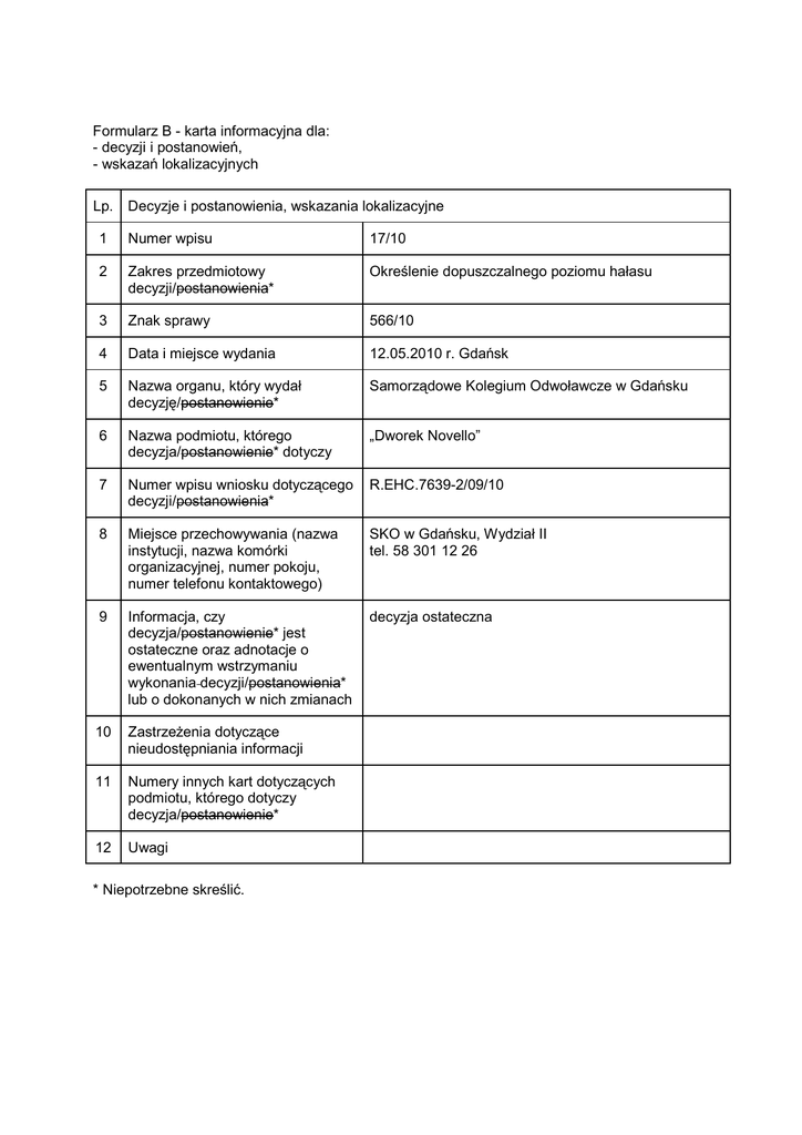 Formularz B - karta informacyjna dla: - decyzji i postanowień, - wskazań lokalizacyjnych Lp. Decyzje i postanowienia, wskazania lokalizacyjne 1 Numer wpisu 17/10 2 Zakres przedmiotowy decyzji/postanowienia* Określenie dopuszczalnego poziomu hałasu 3 Znak sprawy 566/10 4 Data i miejsce wydania 12.05.2010 r. Gdańsk 5 Nazwa organu, który wydał decyzję/postanowienie* Samorządowe Kolegium Odwoławcze w Gdańsku 6 Nazwa podmiotu, którego decyzja/postanowienie* dotyczy „Dworek Novello” 7 Numer wpisu wniosku dotyczącego decyzji/postanowienia* R.EHC.7639-2/09/10 8 Miejsce przechowywania (nazwa instytucji, nazwa komórki organizacyjnej, numer pokoju, numer telefonu kontaktowego) SKO w Gdańsku, Wydział II tel. 58 301 12 26 9 Informacja, czy decyzja/postanowienie* jest ostateczne oraz adnotacje o ewentualnym wstrzymaniu wykonania decyzji/postanowienia* lub o dokonanych w nich zmianach decyzja ostateczna 10 Zastrzeżenia dotyczące nieudostępniania informacji 11 Numery innych kart dotyczących podmiotu, którego dotyczy decyzja/postanowienie* 12 Uwagi * Niepotrzebne skreślić.