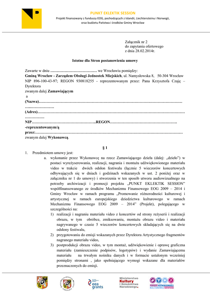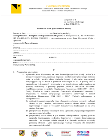 PUNKT EKLEKTIK SESSION Projekt finansowany z funduszy EOG, pochodzących z Islandii, Liechtensteinu i Norwegii, oraz budżetu Państwa i środków Gminy Wrocław Załącznik nr 2 do zapytania ofertowego z dnia 28.02.2014r. Istotne dla Stron postanowienia umowy Zawarte w dniu ……………………………… we Wrocławiu pomiędzy: Gminą Wrocław - Zarządem Obsługi Jednostek Miejskich, ul. Namysłowska 8, 50-304 Wrocław NIP 896-100-43-97; REGON 930818255 - reprezentowanym przez: Pana Krzysztofa Czaję – Dyrektora zwanym dalej Zamawiającym a (Nazwa)………………………………………………………………………………………………… …..……………… (Adres)…………………………………………………………………………………………………… …………… NIP…………………………………………..REGON……………………………………………. -reprezentowanym/ą przez:…………………………………………………………………………………………………… zwanym dalej Wykonawcą. §1 1. Przedmiotem umowy jest: a. wykonanie przez Wykonawcę na rzecz Zamawiającego dzieła (dalej: „dzieło”) w postaci wyreżyserowania, realizacji, nagrania i montażu udźwiękowionego materiału video w trakcie dwóch odsłon festiwalu (łącznie 5 wieczorów koncertowych odbywających się w dniach i godzinach wskazanych w ust. 2 poniżej oraz w załączniku nr 1 do umowy) i stworzenia w ten sposób utworu audiowizualnego na potrzeby archiwizacji i promocji projektu „PUNKT EKLEKTIK SESSION” współfinansowanego ze środków Mechanizmu Finansowego EOG 2009 – 2014 i Gminy Wrocław w ramach programu „Promowanie różnorodności kulturowej i artystycznej w ramach europejskiego dziedzictwa kulturowego w ramach Mechanizmu Finansowego EOG 2009 – 2014” (Projekt), polegającego w szczególności na: 1) realizacji i nagraniu materiału video z koncertów od strony reżyserii i realizacji obrazu, w tym obróbce, zmiksowaniu, montażu obrazu video i materiału nagrywanego w czasie 5 wieczorów koncertowych składających się na dwie odsłony festiwalu, 2) przygotowaniu do emisji wskazanych przez Dyrektora Artystycznego fragmentów nagranego materiału video, 3) postprodukcji obrazu video, w tym montaż, udźwiękowienie i oprawę graficzna materiału (zamieszczenie podpisów, logotypów) i wydanie Zamawiającemu materiału na trwałym nośniku danych i w formacie ustalonym wcześniej pomiędzy stronami , jako spełniającego wymogi wskazane dla materiałów przeznaczonych do emisji. PUNKT EKLEKTIK SESSION Projekt finansowany z funduszy EOG, pochodzących z Islandii, Liechtensteinu i Norwegii, oraz budżetu Państwa i środków Gminy Wrocław b. przeniesienie na Zamawiającego autorskich praw majątkowych do dzieła wskazanego w punkcie a. powyżej w zakresie wskazanym w §7 umowy; 2. 3. 4. 5. 6. 7. 8. 9. Obie odsłony festiwalu będą miały miejsce we Wrocławiu: a. pierwsza odsłona festiwalu (3 wieczory koncertowe) odbędzie się w dniach 7-9 marca 2014 – szczegółowy harmonogram znajduje się w załączniku nr 1 do umowy, b. druga odsłona festiwalu (2 wieczory koncertowe) odbędzie się w listopadzie 2014 – datę i szczegółowy harmonogram Zamawiający przekaże Wykonawcy najpóźniej na 30 dni przed festiwalem. Wykonawca zobowiązuje się do wykonania przedmiotu zamówienia stosownie do wskazówek Dyrektora Artystycznego Projektu, artystów i wykonawców występującymi w czasie Koncertów, a także wykonania ich z najwyższą sumiennością i starannością z uwzględnieniem zawodowego charakteru prowadzonej działalności oraz z poszanowaniem interesów Zamawiającego. Dzieło w postaci konkretnego utworu audiowizualnego o łącznym czasie trwania dla materiału z każdej z odsłon festiwalu – wynoszącym 1080 minut, w ramach wynagrodzenia umownego, zostanie przekazane Zamawiającemu w terminie nie dłuższym niż 21 dni liczonych od dnia każdej z odsłon festiwalu, w formie materiału video zapisanego na trwałym nośniku danych ustalonym wcześniej pomiędzy stronami (takimi jak: CD, DVD, itp.) i opakowanym w sposób zabezpieczający przed wpływem czynników atmosferycznych w ilości co najmniej 3sztuk. Odbiór materiału video nastąpi w siedzibie Zamawiającego poprzez jego merytoryczną i artystyczną ocenę, w formie protokołu sporządzonego i podpisanego przez obie Strony na tę okoliczność. Wszelkie kwestie techniczne dotyczące wykonania poszczególnych postanowień umownych, o ile nie zostaną uregulowane w niniejszej umowie, zostaną przez strony dookreślone w toku współpracy w formie załączników lub aneksów do niniejszej umowy. Jeżeli w trakcie wykonania niniejszej umowy jakiekolwiek czynności lub efekty wykonania tych czynności będą wymagały akceptacji, którejkolwiek ze stron, Strona, której przysługuje uprawnienie do podjęcia decyzji o ewentualnej akceptacji, ma obowiązek podjąć i przekazać drugiej Stronie decyzję w terminie 1 dnia roboczego od przedstawienia jej czynności lub efektu jej wykonania, do akceptacji. W przypadku nie podjęcia decyzji w w/w terminie przyjmuje się, że czynność lub efekt jej wykonania został przyjęty bez zastrzeżeń. W przypadku, zgłoszenia przez Stronę dokonującą oceny zastrzeżeń lub poprawek do akceptowanej czynność lub efektu jej wykonania, druga Strona ma obowiązek wprowadzenia tych zmian i poprawek w terminie 1 dnia, pod rygorem odmowy przyjęcia czynności lub efektu jej wykonania oraz wszelkich skutków jakie wiąże z tym faktem umowa i obowiązujące prawo. §2 1. Wykonawca zobowiązany jest wykonać czynności będące przedmiotem niniejszej umowy z najwyższą starannością, mając na względzie uzasadnione interesy Zamawiającego w zakresie powierzonych sobie czynności. 2. Wykonawca oświadcza, że posiada doświadczenie niezbędne do prawidłowego wykonania niniejszej