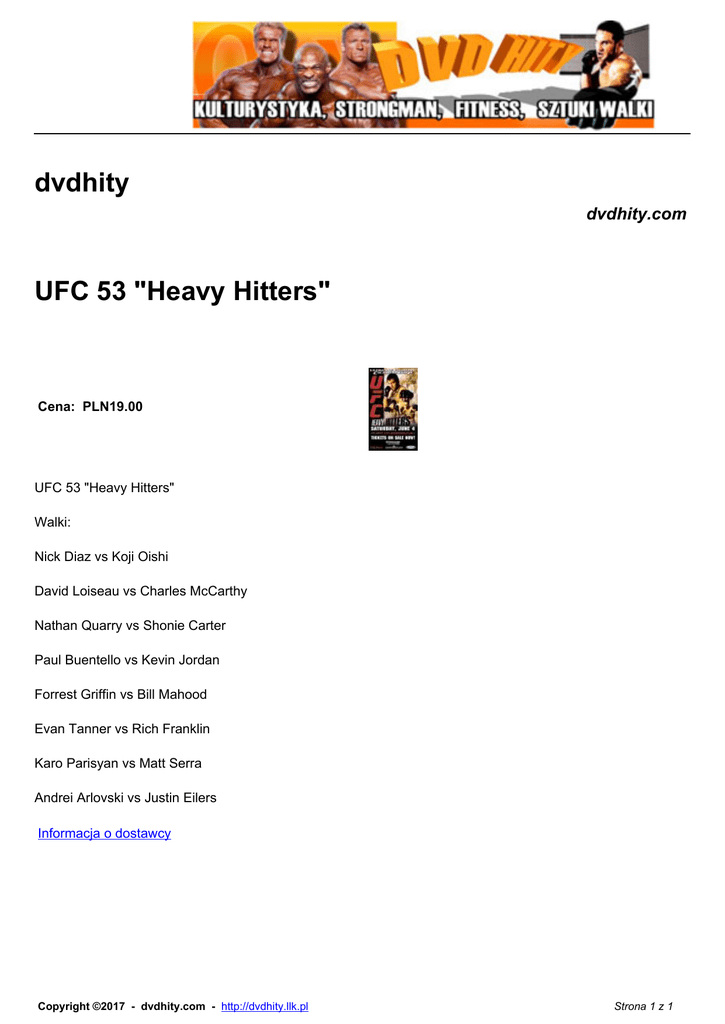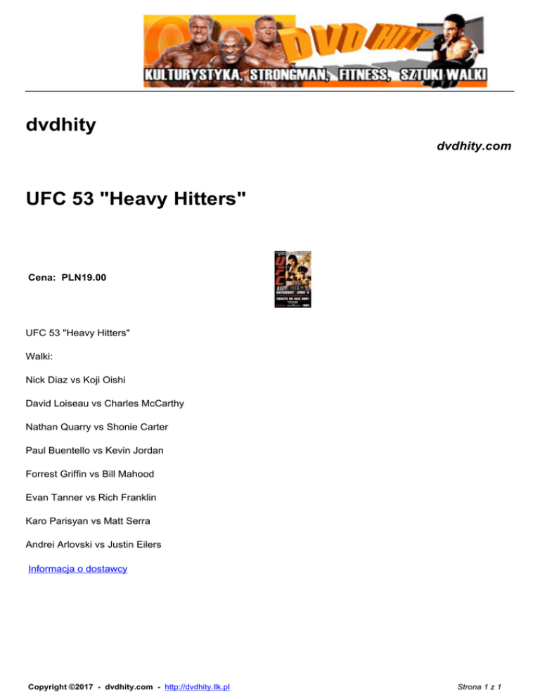 dvdhity dvdhity.com UFC 53 "Heavy Hitters" Cena: PLN19.00 UFC 53 "Heavy Hitters" Walki: Nick Diaz vs Koji Oishi David Loiseau vs Charles McCarthy Nathan Quarry vs Shonie Carter Paul Buentello vs Kevin Jordan Forrest Griffin vs Bill Mahood Evan Tanner vs Rich Franklin Karo Parisyan vs Matt Serra Andrei Arlovski vs Justin Eilers Informacja o dostawcy Copyright ©2017 - dvdhity.com - http://dvdhity.llk.pl Strona 1 z 1