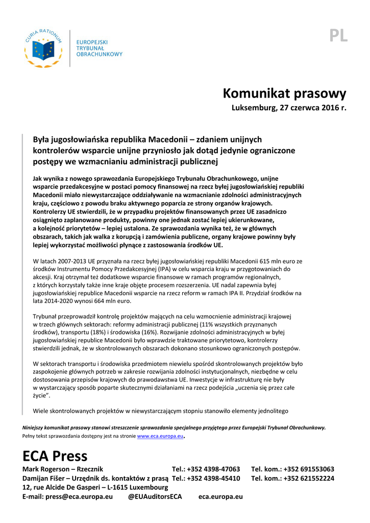 PL Komunikat prasowy Luksemburg, 27 czerwca 2016 r. Była jugosłowiańska republika Macedonii – zdaniem unijnych kontrolerów wsparcie unijne przyniosło jak dotąd jedynie ograniczone postępy we wzmacnianiu administracji publicznej Jak wynika z nowego sprawozdania Europejskiego Trybunału Obrachunkowego, unijne wsparcie przedakcesyjne w postaci pomocy finansowej na rzecz byłej jugosłowiańskiej republiki Macedonii miało niewystarczające oddziaływanie na wzmacnianie zdolności administracyjnych kraju, częściowo z powodu braku aktywnego poparcia ze strony organów krajowych. Kontrolerzy UE stwierdzili, że w przypadku projektów finansowanych przez UE zasadniczo osiągnięto zaplanowane produkty, powinny one jednak zostać lepiej ukierunkowane, a kolejność priorytetów – lepiej ustalona. Ze sprawozdania wynika też, że w głównych obszarach, takich jak walka z korupcją i zamówienia publiczne, organy krajowe powinny były lepiej wykorzystać możliwości płynące z zastosowania środków UE. W latach 2007-2013 UE przyznała na rzecz byłej jugosłowiańskiej republiki Macedonii 615 mln euro ze środków Instrumentu Pomocy Przedakcesyjnej (IPA) w celu wsparcia kraju w przygotowaniach do akcesji. Kraj otrzymał też dodatkowe wsparcie finansowe w ramach programów regionalnych, z których korzystały także inne kraje objęte procesem rozszerzenia. UE nadal zapewnia byłej jugosłowiańskiej republice Macedonii wsparcie na rzecz reform w ramach IPA II. Przydział środków na lata 2014-2020 wynosi 664 mln euro. Trybunał przeprowadził kontrolę projektów mających na celu wzmocnienie administracji krajowej w trzech głównych sektorach: reformy administracji publicznej (11% wszystkich przyznanych środków), transportu (18%) i środowiska (16%). Rozwijanie zdolności administracyjnych w byłej jugosłowiańskiej republice Macedonii było wprawdzie traktowane priorytetowo, kontrolerzy stwierdzili jednak, że w skontrolowanych obszarach dokonano stosunkowo ograniczonych postępów. W sektorach transportu i środowiska przedmiotem niewielu spośród skontrolowanych projektów było zaspokojenie głównych potrzeb w zakresie rozwijania zdolności instytucjonalnych, niezbędne w celu dostosowania przepisów krajowych do prawodawstwa UE. Inwestycje w infrastrukturę nie były w wystarczający sposób poparte skutecznymi działaniami na rzecz podejścia „uczenia się przez całe życie”. Wiele skontrolowanych projektów w niewystarczającym stopniu stanowiło elementy jednolitego Niniejszy komunikat prasowy stanowi streszczenie sprawozdania specjalnego przyjętego przez Europejski Trybunał Obrachunkowy. Pełny tekst sprawozdania dostępny jest na stronie www.eca.europa.eu. ECA Press Mark Rogerson – Rzecznik Tel.: +352 4398-47063 Damijan Fišer – Urzędnik ds. kontaktów z prasą Tel.: +352 4398-45410 12, rue Alcide De Gasperi – L-1615 Luxembourg E-mail: [email protected] @EUAuditorsECA eca.europa.eu Tel. kom.: +352 691553063 Tel. kom.: +352 621552224 PL i skoordynowanego podejścia, lub nie podjęto w związku z nimi odpowiednich działań następczych. Innym wyzwaniem, przed jakim stoi Komisja, jest określenie, w jaki sposób skrócić czas niezbędny do osiągnięcia rezultatów projektów od chwili zidentyfikowania potrzeby uzyskania wsparcia, który obecnie wynosi co najmniej cztery lata. Komisja dokonała decentralizacji procesu zarządzania w odniesieniu do 76% środków IPA przyznanych na rzecz krajowej administracji oraz wsparła struktury służące do zarządzania tymi środkami. W pewnym zakresie usprawniło to zdolność kraju do zarządzania środkami unijnymi. Komisja mogła jednak bardziej intensywnie wspierać najlepsze praktyki zastosowane w innych obszarach administracji krajowej. Mechanizmy dialogu politycznego miały charakter sprzyjający reformom. Naciski Komisji na wspieranie reform w obszarach newralgicznych były jednak bardzo ograniczone ze względu na brak ram dotyczących negocjacji akcesyjnych. – Wsparcie UE na rzecz wzmocnienia zdolności administracyjnych w byłej jugosłowiańskiej republice Macedonii musi zostać podporządkowane poprawnie określonym priorytetom i oparte na silnym krajowym zaangażowaniu w to, by wywarło ono zamierzone oddziaływanie – stwierdził Hans Gustaf Wessberg, członek Europejskiego Trybunału Obrachunkowego odpowiedzialny za to sprawozdanie. Kontrolerzy zalecają, aby Komisja: • ukierunkowała swoją pomoc na rzecz wzmacniania zdolności administracyjnych na uszeregowane priorytety, które dotyczą ważnych uchybień w głównych obszarach, takich jak te wskazane w sprawozdaniu; • dołożyła starań, by wzmocnić zdolności administracyjne w przypadku inwestowania w sektorach transportu i środowiska; • lepiej wykorzystała instrumenty polityki do wzmocnienia zaangażowania organów krajowych w proces reform; • precyzyjniej ukierunkowała projekty poprzez sekwencjonowanie ich w ramach spójnego podejścia służącego osiąganiu celów reform; • zachęcała organy krajowe do propagowania przykładów najlepszych praktyk wypracowanych w ramach zarządzania zdecentralizowanego środkami UE; • skorzystała z obecnych możliwości wdrażania reform w celu zapewnienia zaangażowania na rzecz wzmacniania zdolności administracyjnych. Informacje dla redaktorów Była jugosłowiańska republika Macedonii jest krajem kandydującym do członkostwa w UE od 2005 r. Od 2009 r. Komisja corocznie odnotowuje w swoich sprawozdaniach, że kraj ten spełnia obowiązkowe kryteria polityczne pozwalające na przejście do następnego etapu procesu akcesyjnego. Rada zgodziła się co do tego, że spełnia on kryteria polityczne, lecz nie podjęła decyzji o przyjęciu ram negocjacyjnych w celu otwarcia negocjacji akcesyjnych. W listopadzie 2015 r. Komisja oznajmiła, że jest gotowa przedłużyć rekomendację w sprawie otwarcia negocjacji akcesyjnych z byłą jugosłowiańską republiką Macedonii. Rekomendac