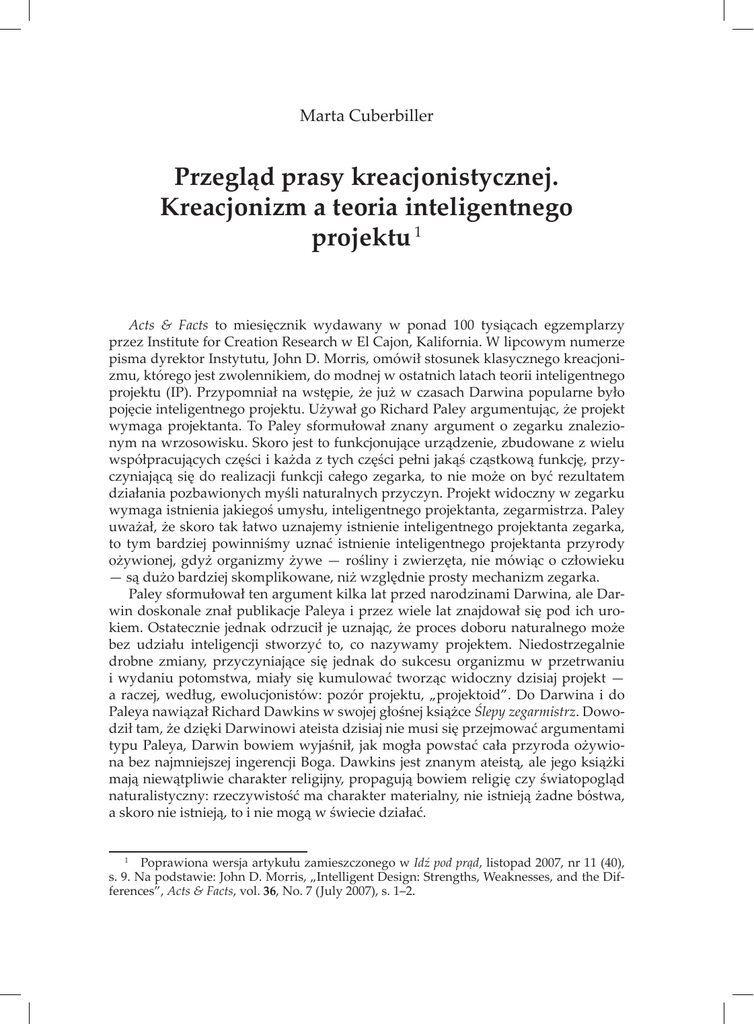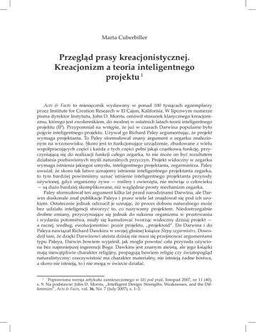 57 Marta Cuberbiller Przegląd prasy kreacjonistycznej. Kreacjonizm a teoria inteligentnego projektu 1 Acts & Facts to miesięcznik wydawany w ponad 100 tysiącach egzemplarzy przez Institute for Creation Research w El Cajon, Kalifornia. W lipcowym numerze pisma dyrektor Instytutu, John D. Morris, omówił stosunek klasycznego kreacjonizmu, którego jest zwolennikiem, do modnej w ostatnich latach teorii inteligentnego projektu (IP). Przypomniał na wstępie, że już w czasach Darwina popularne było pojęcie inteligentnego projektu. Używał go Richard Paley argumentując, że projekt wymaga projektanta. To Paley sformułował znany argument o zegarku znalezionym na wrzosowisku. Skoro jest to funkcjonujące urządzenie, zbudowane z wielu współpracujących części i każda z tych części pełni jakąś cząstkową funkcję, przyczyniającą się do realizacji funkcji całego zegarka, to nie może on być rezultatem działania pozbawionych myśli naturalnych przyczyn. Projekt widoczny w zegarku wymaga istnienia jakiegoś umysłu, inteligentnego projektanta, zegarmistrza. Paley uważał, że skoro tak łatwo uznajemy istnienie inteligentnego projektanta zegarka, to tym bardziej powinniśmy uznać istnienie inteligentnego projektanta przyrody ożywionej, gdyż organizmy żywe — rośliny i zwierzęta, nie mówiąc o człowieku — są dużo bardziej skomplikowane, niż względnie prosty mechanizm zegarka. Paley sformułował ten argument kilka lat przed narodzinami Darwina, ale Darwin doskonale znał publikacje Paleya i przez wiele lat znajdował się pod ich urokiem. Ostatecznie jednak odrzucił je uznając, że proces doboru naturalnego może bez udziału inteligencji stworzyć to, co nazywamy projektem. Niedostrzegalnie drobne zmiany, przyczyniające się jednak do sukcesu organizmu w przetrwaniu i wydaniu potomstwa, miały się kumulować tworząc widoczny dzisiaj projekt — a raczej, według, ewolucjonistów: pozór projektu, „projektoid”. Do Darwina i do Paleya nawiązał Richard Dawkins w swojej głośnej książce Ślepy zegarmistrz. Dowodził tam, że dzięki Darwinowi ateista dzisiaj nie musi się przejmować argumentami typu Paleya, Darwin bowiem wyjaśnił, jak mogła powstać cała przyroda ożywiona bez najmniejszej ingerencji Boga. Dawkins jest znanym ateistą, ale jego książki mają niewątpliwie charakter religijny, propagują bowiem religię czy światopogląd naturalistyczny: rzeczywistość ma charakter materialny, nie istnieją żadne bóstwa, a skoro nie istnieją, to i nie mogą w świecie działać. 1 Poprawiona wersja artykułu zamieszczonego w Idź pod prąd, listopad 2007, nr 11 (40), s. 9. Na podstawie: John D. Morris, „Intelligent Design: Strengths, Weaknesses, and the Differences”, Acts & Facts, vol. 36, No. 7 (July 2007), s. 1–2. 58 Problemy genezy, t. XV (2007), nr 11–12 (225–226) Istnieje oczywista różnica między naturalistami a kreacjonistami. Ci pierwsi uważają dzisiaj, że projekt jest skutkiem pojawiania się przypadkowych mutacji, z których dobór naturalny odsiewa te korzystne i usuwa niekorzystne. Kreacjoniści, których widzenie świata jest ukształtowane przez Biblię, twierdzą jednak, że widoczny w przyrodzie projekt jest skutkiem celowego działania rozumnego Stwórcy, o którym czytamy w Piśmie Świętym. Kreacjoniści twierdzą tak o projekcie od stuleci. Współcześnie pojęcie inteligentnego projektu zostało przejęte (w latach 1990.) właśnie przez Ruch Inteligentnego Projektu. Należą do niego uczeni z różnych dziedzin nauki i wyznający rozmaite światopoglądy. Są wśród nich agnostycy, zwolennicy New Age, chrześcijanie, a nawet ewolucjoniści (tyle że niedarwinowscy). Zwolennicy teorii inteligentnego projektu twierdzą, że przypadkowe mutacje i dobór naturalny są w stanie utworzyć jedynie niewielkie zmiany w organizmach żywych, że widoczny w tych ostatnich projekt leży poza zasięgiem tych czysto przyrodniczych procesów. Uważają też, że wyjaśnianie przyrody tylko przy pomocy przyczyn naturalnych jest czymś w rodzaju religii bez Boga. Publikacje przedstawicieli teorii inteligentnego projektu mają ściśle świecki charakter: nie odwołują się nigdy do świętych ksiąg jakiejkolwiek religii i nigdy nie identyfikują inteligentnego projektanta z jakimkolwiek Bóstwem. Na temat tożsamości inteligentnego projektanta nie wypowiadają się, gdyż ustalenie tej tożsamości wymaga wyjścia poza rozważania naukowe. Niektórzy z nich posiłkując się filozofią lub teologią ujawniają, kogo rozumieją pod imieniem „inteligentnego projektanta”, ale ich odpowiedzi są różne. Może to być Bóg, ale także jakaś inteligentna siła przenikająca Wszechświat, obce cywilizacje kosmiczne, a nawet podróżnicy w czasie. Trzeba jednak pamiętać, że gdy takie odpowiedzi słyszymy, to nie są one wygłaszane na terenie teorii inteligentnego projektu. Ta ostatnia wedle zgodnej opinii jej zwolenników jest zbyt słaba, by ustalić tożsamość inteligentnego projektanta. Zwolennicy doktryny IP uważają, że ich koncepcja lepiej odpowiada posiadanym faktom przyrodniczym i jako taka powinna być w jakimś stopniu obecna w szkołach. Trzeba jednak pamiętać, że główny ośrodek Ruchu Inteligentnego Projektu, Discovery Institute w Sea le, w stanie Oregon, nie zaleca wprowadzania do szkół publicznych nauczania tej teorii. Jednak niektóre rady szkolne w Ameryce próbowały umieścić w podręcznikach wzmiankę o istnieniu tej teorii. Spotkało się to z olbrzymią kampanią propagandową mass-mediów amerykańskich, opanowanych tak jak w Polsce przez siły lewicowe, laickie i ateistyczne. Kampania ta miała głównie charakter dezinformujący — oskarżano teorię ID o skryte propagowanie biblijnego kreacjonizmu, a nawet o utożsamianie inteligentnego projektanta z Bogiem. W dzisiejszych czasach siła mediów jest decydująca i zakazano w podręcznikach szkolnych nawet wymieniania teor