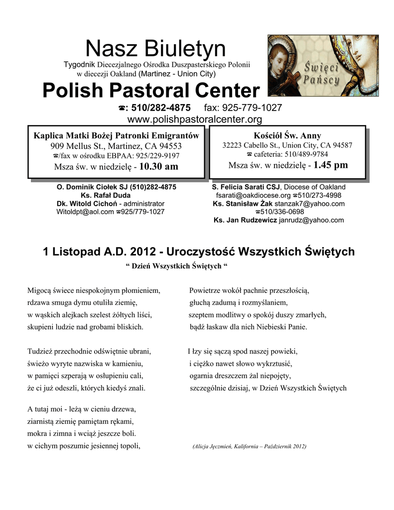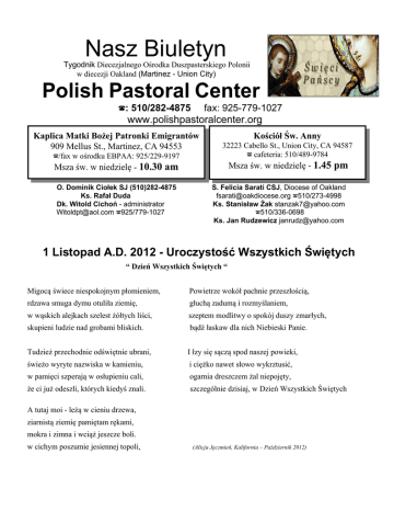 Nasz Biuletyn Tygodnik Diecezjalnego Ośrodka Duszpasterskiego Polonii w diecezji Oakland (Martinez - Union City) Polish Pastoral Center ?: 510/282-4875 fax: 925-779-1027 www.polishpastoralcenter.org Kaplica Matki Bożej Patronki Emigrantów 909 Mellus St., Martinez, CA 94553 ?/fax w ośrodku EBPAA: 925/229-9197 Kościół Św. Anny 32223 Cabello St., Union City, CA 94587 ? cafeteria: 510/489-9784 Msza św. w niedzielę - 1.45 pm Msza św. w niedzielę - 10.30 am O. Dominik Ciołek SJ (510)282-4875 Ks. Rafał Duda Dk. Witold Cichoń - administrator [email protected] ?925/779-1027 S. Felicia Sarati CSJ, Diocese of Oakland [email protected] ?510/273-4998 Ks. Stanisław Żak [email protected] ?510/336-0698 Ks. Jan Rudzewicz [email protected] 1 Listopad A.D. 2012 - Uroczystość Wszystkich Świętych “ Dzień Wszystkich Świętych “ Migocą świece niespokojnym płomieniem, Powietrze wokół pachnie przeszłością, rdzawa smuga dymu otuliła ziemię, głuchą zadumą i rozmyślaniem, w wąskich alejkach szelest żółtych liści, szeptem modlitwy o spokój duszy zmarłych, skupieni ludzie nad grobami bliskich. bądź łaskaw dla nich Niebieski Panie. Tudzież przechodnie odświętnie ubrani, I łzy się sączą spod naszej powieki, świeżo wyryte nazwiska w kamieniu, i ciężko nawet słowo wykrztusić, w pamięci szperają w osłupieniu cali, ogarnia dreszczem żal niepojęty, że ci już odeszli, których kiedyś znali. szczególnie dzisiaj, w Dzień Wszystkich Świętych A tutaj moi - leżą w cieniu drzewa, ziarnistą ziemię pamiętam rękami, mokra i zimna i wciąż jeszcze boli. w cichym poszumie jesiennej topoli, (Alicja Jęczmień, Kalifornia – Październik 2012) droga sącząca się spomiędzy palców dusza uścisk ciszy odpływającej tęczą przemija nieskończoność niewyschnięty pocałunek jeszcze w tańcu dwa kroki wiatrem snuty zapach wspomnienie miłości jesteś ? Ryszard Urbaniak Grafika- Bogusia Kizior Jakie cuda czyni ksiądz Popiełuszko Milena Kindziuk Nie ma tygodnia, żeby ktoś nie doznał łaski za wstawiennictwem bł. ks. Jerzego. I tak jest nieprzerwanie od 30 lat Mężczyzna w sile wieku w jednym z warszawskich szpitali przechodził właśnie operację kręgosłupa. Ale pojawiły się komplikacje. Zakończyło się implantacją metalowego rusztowania stabilizującego kręgosłup. – Wkrótce potem doznałem rozległego zawału serca – wspomina. Słabł z minuty na minutę, balansując na krawędzi utraty przytomności. Nabierał przekonania, że umiera. Nagle jeden z lekarzy zawołał: „Puściło naczynie…”. – Na twarzach pozostałych lekarzy zobaczyłem niepokój i wielkie napięcie. To traciłem, to odzyskiwałem świadomość, docierał do mnie dramatyzm sytuacji. Widząc, że jest to krytyczny moment, resztką sił zawołałem: „Księże Jerzy, pomóż…”. Zabiegi na sercu chorego mężczyzny trwały nadal, a on, jak opowiada, czuł, że ktoś trzyma go mocno za rękę. – Czułem szczególne ciepło. Przeszyły mnie dreszcze, zrozumiałem, że był przy mnie ks. Jerzy. I wtedy powoli wszystko zaczęło wracać do normy. – Poczułem przypływ sił, po chwili wszystko ucichło i po jakimś czasie usłyszałem głos lekarza: „Wszystko będzie dobrze”. Byłem pewien, że nic złego mnie nie spotka. Chociaż z medycznego punktu widzenia zagrożenie życia wciąż istniało, zawał okazał się nietypowy, wyjątkowo rozległy. Lekarze powiedzieli później choremu, że moment, w którym głośno zawołał ks. Jerzego, był decydujący. To on przyczynił się do uzdrowienia. Poza czasem i poza przestrzenią Z jednej strony coraz większa laicyzacja, ośmieszanie i wyszydzanie wartości, odchodzenie od wiary, z drugiej zaś, gdzieś w środku „oka cyklonu” toczy się prawdziwe życie Kościoła. I dzieją się cuda. Po cichu. Dyskretnie. Bo cuda są właśnie takie: nie rzucają się w oczy, nie krzyczą. Dlatego zwykli ludzie, którzy przybywają do grobu ks. Jerzego Popiełuszki w Warszawie i tam się modlą, często wyjeżdżają odmienieni. „Porażeni” łaskami, których się wcale nie spodziewali. – Choroby, jakie mnie nawiedzały od 7 lat, tutaj ustąpiły – opowiada starszy mężczyzna. – Były to przypadłości nowotworowe. Moje prośby za wstawiennictwem ks. Jerzego Popiełuszki zostały wysłuchane, a Pan Bóg pozwolił mi już dożyć 80. roku życia – dodaje. Kobieta z Poznania, która w czasie pobytu w Warszawie razem z córką modliła się przy grobie ks. Jerzego, opowiada: – Poprosiłam ks. Jerzego, aby odsunął ode mnie ból, jaki od kilku lat dokuczał mi w palcu lewej stopy. Był to ból nieustanny, promieniował na całą stopę. Chirurdzy byli bezradni, mówili, że ingerencja może spowodować uszkodzenie kości. Po powrocie do domu kobieta nagle zdała sobie sprawę, że nie czuje bólu. – Mój palec jest „czysty”, bez ropy, ran, a ból nie promieniuje na stopę! Mijają 3 miesiące od tego czasu i mam 100 proc. pewności, że moja modlitwa przy grobie ks. Jerzego przyniosła dar uzdrowienia – oznajmia kobieta. Łask za wstawiennictwem bł. ks. Jerzego doznają także ci, którzy modlą się za jego przyczyną w swoim domu lub parafialnym kościele czy też w jakimkolwiek miejscu na ziemi. Przestrzeń nie ma tu bowiem znaczenia. Święci działają poza czasem i poza przestrzenią. – Dostałem ataku kamicy pęcherzyka żółciowego. Po operacji pomodliłem się do bł. ks. Jerzego i nadzwyczaj szybko, bez żadnych komplikacji powróciłem do zdrowia. Jestem przekonany, że zawdzięczam to wstawiennictwu bł. Męczennika – mężczyzna z Warszawy opowiada o wydarzeniach z sierpnia 2012 r. Podobny przypadek zdarzył się mieszkance Zabrza, która zamówiła Mszę św. w intencji poprawy stanu zdrowia męża, który chorował na raka. Zaraz potem otrzymała od syna wiadomość, że badania nie wykazały procesu nowotworowego. – Łaskę tę otrzymałam dzięki wstawiennictwu ks. Jer