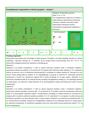 Kompleksowa rozgrzewka w dwóch grupach – wersja 1. Kategoria: Rozgrzewka grupowa Wiek: U 12 – U 18 Cel: przygotowanie organizmu do wysiłku w części głównej, doskonalenie koordynacji ruchowej i zdolności rytmizacji ruchów, doskonalenie elementów techniki indywidualnej, kształtowanie współpracy z partnerem. Ilość ćwiczących: Pole ćwiczenia: - 6/8 - 6/8 - 3 - 6 - 6 -2 - 4 - 7 -8 Przebieg rozgrzewki: Rozgrzewka wykonywana jest równolegle w dwóch grupach. W każdej z nich piłki posiadają zawodnicy A /oprócz ostatniego/, natomiast ćwiczący B i C ustawieni są po drugiej stronie wyznaczonego pola /30 x 40 m/. Po zakończeniu każdego powtórzenia zawodnicy zmieniają grupy. Wariant A: Zawodnik A po krótkim prowadzeniu /1/ piłki na wprost wykonuje określony zwód z ominięciem stojaków i wykonaniem podania po podłożu /2/ do partnera B. Po podaniu piłki wykonuje szybki skipping A /3/ w ustawieniu bokiem do kierunku ruchu na drabinkach koordynacyjnych i przebiega na miejsce partnera B. Ćwiczący B w tym samym czasie podaje piłkę po podłożu /5/ do wybiegającego na pozycję /4/ partnera B i wykonując ćwiczenia koordynacji w truchcie /np. obustronne krążenie RR w przód/ przebiega /6’/ na jego miejsce. Zawodnik C po wykonaniu prowadzenia piłki /6/ ze zmianą kierunku pomiędzy chorągiewkami podaje ją /7/ do ostatniego partnera ze swojej grupy i po wykonaniu wejść jednonóż /8/ do poszczególnych obręczy gimnastycznych staje na końcu drugiej grupy. Wariant B: Zawodnik A po krótkim prowadzeniu /1/ piłki na wprost wykonuje określony zwód z ominięciem stojaków i wykonaniem podania górnego; przerzutu piłki /2/ do partnera B. Po podaniu wykonuje kombinację rytmicznych wejść /3/ w poszczególne segmenty drabinki koordynacyjnej i przebiega na miejsce partnera B. Ćwiczący B po przyjęciu piłki z powietrza wymienia podanie po podłożu /4, 5, 6/ z partnerem C i po zagraniu mu piłki porusza się określonym sposobem /np. bieg zakosami tyłem/ na jego miejsce. Zawodnik C po wykonaniu prowadzenia piłki /7/ ze zmianą kierunku pomiędzy ustawionymi chorągiewkami podaje ją /8/ do ostatniego partnera ze swojej grupy i po wykonaniu przeskoków /9/ określonym sposobem przez trzy niskie płotki kończy powtórzenie startem /10/ na koniec drugiej grupy. Wskazówki: - rozgrzewka wykonywana jest równolegle przez zawodników obydwu grup, - minimalna ilość ćwiczących; 12, - można stosować po sobie dwa przedstawione warianty, bądź wykonywać je niezależnie, - w kolejnych powtórzeniach można /należy/ zmieniać sposób pokonania drabinki koordynacyjnej oraz obręczy i niskich płotków, - trener określa sposób prowadzenia piłki i rodzaj wykonywanych podań, - zawodnicy ustawieni po lewej stronie wykonują elementy techniki indywidualnej LN, ćwiczący po drugiej stronie PN, - zwracamy uwagę na szybkość i rytmiczność wykonywania ćwiczeń z wykorzystaniem przyborów pomocniczych, - zawodnik kończący ćwiczenie po każdym powtórzeniu zmienia grupę, - czas trwania rozgrzewki ze zmianą wariantów; 15 minut. www.footballtrening.pl www.strefa-trenera.com