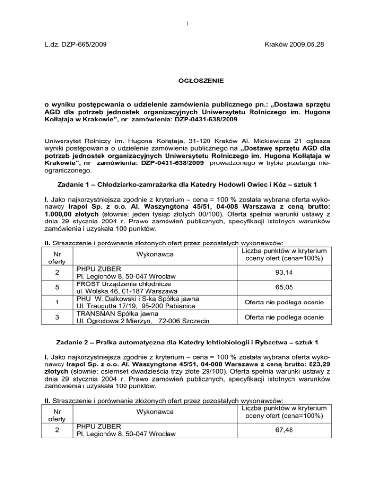 L.dz. DZP-665/2009 Kraków 2009.05.28 OGŁOSZENIE o wyniku