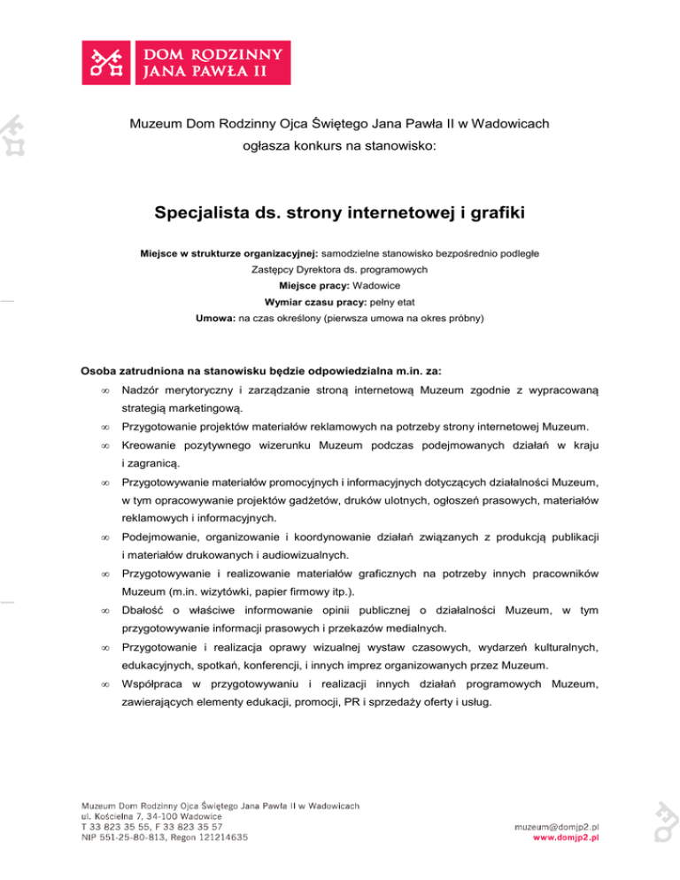 Muzeum Dom Rodzinny Ojca Świętego Jana Pawła II w Wadowicach ogłasza konkurs na stanowisko: Specjalista ds. strony internetowej i grafiki Miejsce w strukturze organizacyjnej: samodzielne stanowisko bezpośrednio podległe Zastępcy Dyrektora ds. programowych Miejsce pracy: Wadowice Wymiar czasu pracy: pełny etat Umowa: na czas określony (pierwsza umowa na okres próbny) Osoba zatrudniona na stanowisku będzie odpowiedzialna m.in. za: • Nadzór merytoryczny i zarządzanie stroną internetową Muzeum zgodnie z wypracowaną strategią marketingową. • Przygotowanie projektów materiałów reklamowych na potrzeby strony internetowej Muzeum. • Kreowanie pozytywnego wizerunku Muzeum podczas podejmowanych działań w kraju i zagranicą. • Przygotowywanie materiałów promocyjnych i informacyjnych dotyczących działalności Muzeum, w tym opracowywanie projektów gadżetów, druków ulotnych, ogłoszeń prasowych, materiałów reklamowych i informacyjnych. • Podejmowanie, organizowanie i koordynowanie działań związanych z produkcją publikacji i materiałów drukowanych i audiowizualnych. • Przygotowywanie i realizowanie materiałów graficznych na potrzeby innych pracowników Muzeum (m.in. wizytówki, papier firmowy itp.). • Dbałość o właściwe informowanie opinii publicznej o działalności Muzeum, w tym przygotowywanie informacji prasowych i przekazów medialnych. • Przygotowanie i realizacja oprawy wizualnej wystaw czasowych, wydarzeń kulturalnych, edukacyjnych, spotkań, konferencji, i innych imprez organizowanych przez Muzeum. • Współpraca w przygotowywaniu i realizacji innych działań programowych Muzeum, zawierających elementy edukacji, promocji, PR i sprzedaży oferty i usług. Wymagania stawiane pracownikowi: • wykształcenie wyższe kierunkowe; • minimum 1 rok doświadczenia na podobnym stanowisku; • bardzo dobra / biegła znajomości języka angielskiego w mowie i piśmie (warunek konieczny); • wysoko rozwinięte umiejętności interpersonalne; • odporność na stres oraz umiejętność organizacji pracy własnej; • kreatywność, komunikatywność i umiejętność pracy w zespole; • umiejętność długofalowego planowania i ustalania priorytetów; • doświadczenie w negocjacjach; • umiejętność redagowania tekstów; • biegła znajomość pakietu MS Office, środowiska CMS i elementów kodu html; • znajomość oprogramowania środowiska Windows. Wymagane dokumenty: • list motywacyjny; • życiorys (CV), który powinien być opatrzony podpisanym oświadczeniem kandydata: „Wyrażam zgodę na przetwarzanie moich danych osobowych dla potrzeb niezbędnych przy realizacji procesu rekrutacji zgodnie z Ustawą z dnia 29 sierpnia 1997 r. o ochronie danych osobowych (t. jedn., Dz. U. z 2002 r., Nr 101, poz. 926 z późn. zm.).”; • kserokopie dokumentów potwierdzających doświadczenie zawodowe; • kserokopie dokumentów potwierdzających zdobyte wykształcenie; • kserokopie zaświadczeń o ukończonych kursach, szkoleniach itp. Wszystkie oświadczenia składane przez kandydata muszą być przez niego podpisane. Wymagane dokumenty aplikacyjne należy składać osobiście lub pocztą na adres: Muzeum Dom Rodzinny Ojca Świętego Jana Pawła II w Wadowicach ul. Spadzista 8, 34-100 Wadowice w terminie do dnia 30.12.2014 r. (decyduje data wpływu). Zgłoszenia kandydatów złożone po terminie, w inny sposób niż określony w ogłoszeniu lub bez kompletu wymaganych dokumentów, nie będą brane pod uwagę w postępowaniu rekrutacyjnym. Muzeum zastrzega sobie możliwość kontaktu jedynie z wybranymi kandydatami oraz prawo do powiadomienia o podjęciu decyzji w sprawie obsadzenia stanowiska jedynie wybranego kandydata. O terminie rozmowy kwalifikacyjnej kandydaci, którzy spełniają wymagania formalne zostaną poinformowani telefonicznie. Dyrektor – ks. Dariusz Raś