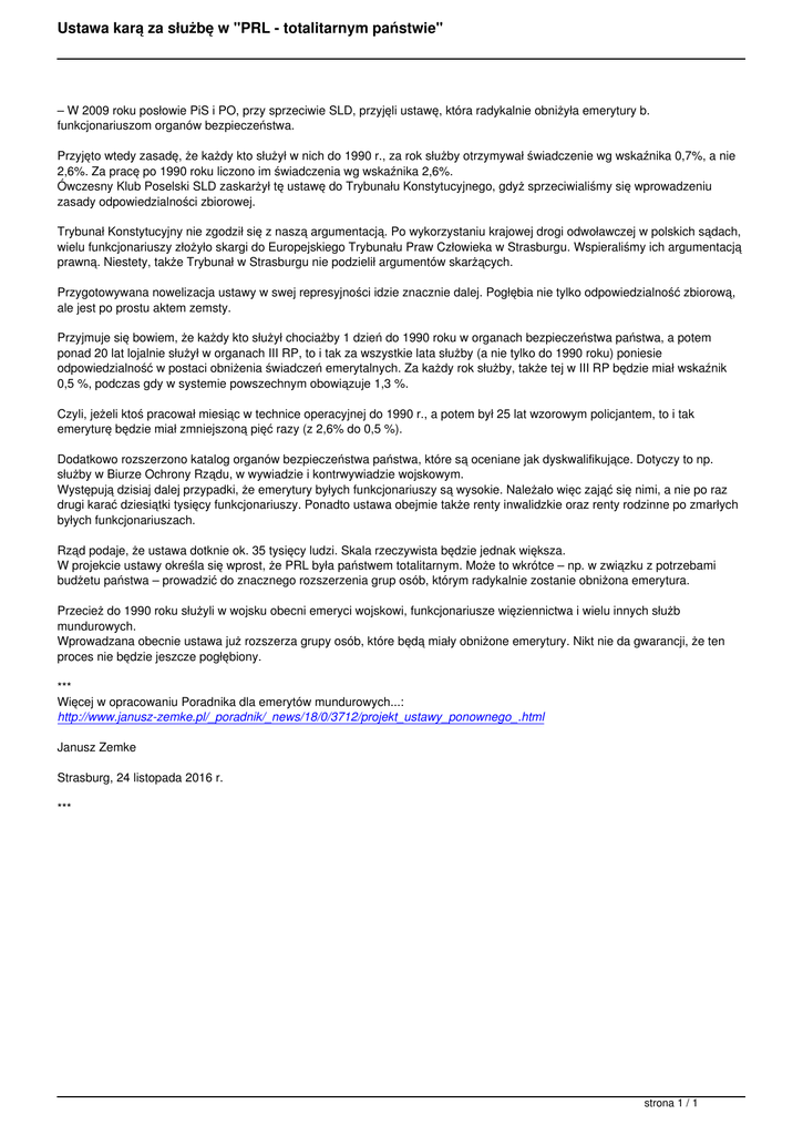 Ustawa karą za służbę w "PRL - totalitarnym państwie" – W 2009 roku posłowie PiS i PO, przy sprzeciwie SLD, przyjęli ustawę, która radykalnie obniżyła emerytury b. funkcjonariuszom organów bezpieczeństwa. Przyjęto wtedy zasadę, że każdy kto służył w nich do 1990 r., za rok służby otrzymywał świadczenie wg wskaźnika 0,7%, a nie 2,6%. Za pracę po 1990 roku liczono im świadczenia wg wskaźnika 2,6%. Ówczesny Klub Poselski SLD zaskarżył tę ustawę do Trybunału Konstytucyjnego, gdyż sprzeciwialiśmy się wprowadzeniu zasady odpowiedzialności zbiorowej. Trybunał Konstytucyjny nie zgodził się z naszą argumentacją. Po wykorzystaniu krajowej drogi odwoławczej w polskich sądach, wielu funkcjonariuszy złożyło skargi do Europejskiego Trybunału Praw Człowieka w Strasburgu. Wspieraliśmy ich argumentacją prawną. Niestety, także Trybunał w Strasburgu nie podzielił argumentów skarżących. Przygotowywana nowelizacja ustawy w swej represyjności idzie znacznie dalej. Pogłębia nie tylko odpowiedzialność zbiorową, ale jest po prostu aktem zemsty. Przyjmuje się bowiem, że każdy kto służył chociażby 1 dzień do 1990 roku w organach bezpieczeństwa państwa, a potem ponad 20 lat lojalnie służył w organach III RP, to i tak za wszystkie lata służby (a nie tylko do 1990 roku) poniesie odpowiedzialność w postaci obniżenia świadczeń emerytalnych. Za każdy rok służby, także tej w III RP będzie miał wskaźnik 0,5 %, podczas gdy w systemie powszechnym obowiązuje 1,3 %. Czyli, jeżeli ktoś pracował miesiąc w technice operacyjnej do 1990 r., a potem był 25 lat wzorowym policjantem, to i tak emeryturę będzie miał zmniejszoną pięć razy (z 2,6% do 0,5 %). Dodatkowo rozszerzono katalog organów bezpieczeństwa państwa, które są oceniane jak dyskwalifikujące. Dotyczy to np. służby w Biurze Ochrony Rządu, w wywiadzie i kontrwywiadzie wojskowym. Występują dzisiaj dalej przypadki, że emerytury byłych funkcjonariuszy są wysokie. Należało więc zająć się nimi, a nie po raz drugi karać dziesiątki tysięcy funkcjonariuszy. Ponadto ustawa obejmie także renty inwalidzkie oraz renty rodzinne po zmarłych byłych funkcjonariuszach. Rząd podaje, że ustawa dotknie ok. 35 tysięcy ludzi. Skala rzeczywista będzie jednak większa. W projekcie ustawy określa się wprost, że PRL była państwem totalitarnym. Może to wkrótce – np. w związku z potrzebami budżetu państwa – prowadzić do znacznego rozszerzenia grup osób, którym radykalnie zostanie obniżona emerytura. Przecież do 1990 roku służyli w wojsku obecni emeryci wojskowi, funkcjonariusze więziennictwa i wielu innych służb mundurowych. Wprowadzana obecnie ustawa już rozszerza grupy osób, które będą miały obniżone emerytury. Nikt nie da gwarancji, że ten proces nie będzie jeszcze pogłębiony. *** Więcej w opracowaniu Poradnika dla emerytów mundurowych...: http://www.janusz-zemke.pl/_poradnik/_news/18/0/3712/projekt_ustawy_ponownego_.html Janusz Zemke Strasburg, 24 listopada 2016 r. *** strona 1 / 1