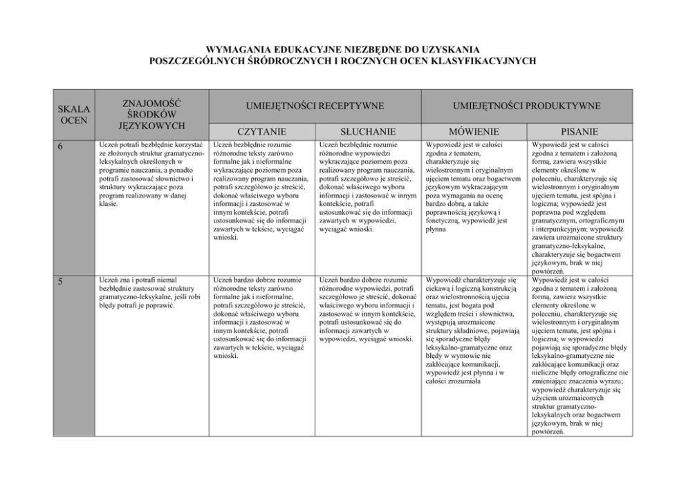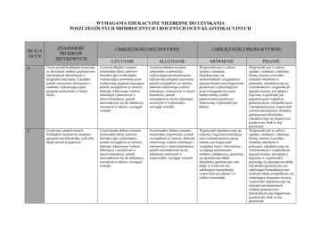 WYMAGANIA EDUKACYJNE NIEZBĘDNE DO UZYSKANIA POSZCZEGÓLNYCH ŚRÓDROCZNYCH I ROCZNYCH OCEN KLASYFIKACYJNYCH SKALA OCEN ZNAJOMOŚĆ ŚRODKÓW JĘZYKOWYCH UMIEJĘTNOŚCI RECEPTYWNE UMIEJĘTNOŚCI PRODUKTYWNE CZYTANIE SŁUCHANIE MÓWIENIE PISANIE Wypowiedź jest w całości zgodna z tematem i założoną formą, zawiera wszystkie elementy określone w poleceniu, charakteryzuje się wielostronnym i oryginalnym ujęciem tematu, jest spójna i logiczna; wypowiedź jest poprawna pod względem gramatycznym, ortograficznym i interpunkcyjnym; wypowiedź zawiera urozmaicone struktury gramatyczno-leksykalne, charakteryzuje się bogactwem językowym, brak w niej powtórzeń. Wypowiedź jest w całości zgodna z tematem i założoną formą, zawiera wszystkie elementy określone w poleceniu, charakteryzuje się wielostronnym i oryginalnym ujęciem tematu, jest spójna i logiczna; w wypowiedzi pojawiają się sporadyczne błędy leksykalno-gramatyczne nie zakłócające komunikacji oraz nieliczne błędy ortograficzne nie zmieniające znaczenia wyrazu; wypowiedź charakteryzuje się użyciem urozmaiconych struktur gramatycznoleksykalnych oraz bogactwem językowym, brak w niej powtórzeń. 6 Uczeń potrafi bezbłędnie korzystać ze złożonych struktur gramatycznoleksykalnych określonych w programie nauczania, a ponadto potrafi zastosować słownictwo i struktury wykraczające poza program realizowany w danej klasie. Uczeń bezbłędnie rozumie różnorodne teksty zarówno formalne jak i nieformalne wykraczające poziomem poza realizowany program nauczania, potrafi szczegółowo je streścić, dokonać właściwego wyboru informacji i zastosować w innym kontekście, potrafi ustosunkować się do informacji zawartych w tekście, wyciągać wnioski. Uczeń bezbłędnie rozumie różnorodne wypowiedzi wykraczające poziomem poza realizowany program nauczania, potrafi szczegółowo je streścić, dokonać właściwego wyboru informacji i zastosować w innym kontekście, potrafi ustosunkować się do informacji zawartych w wypowiedzi, wyciągać wnioski. Wypowiedź jest w całości zgodna z tematem, charakteryzuje się wielostronnym i oryginalnym ujęciem tematu oraz bogactwem językowym wykraczającym poza wymagania na ocenę bardzo dobrą, a także poprawnością językową i fonetyczną, wypowiedź jest płynna 5 Uczeń zna i potrafi niemal bezbłędnie zastosować struktury gramatyczno-leksykalne, jeśli robi błędy potrafi je poprawić. Uczeń bardzo dobrze rozumie różnorodne teksty zarówno formalne jak i nieformalne, potrafi szczegółowo je streścić, dokonać właściwego wyboru informacji i zastosować w innym kontekście, potrafi ustosunkować się do informacji zawartych w tekście, wyciągać wnioski. Uczeń bardzo dobrze rozumie różnorodne wypowiedzi, potrafi szczegółowo je streścić, dokonać właściwego wyboru informacji i zastosować w innym kontekście, potrafi ustosunkować się do informacji zawartych w wypowiedzi, wyciągać wnioski. Wypowiedź charakteryzuje się ciekawą i logiczną konstrukcją oraz wielostronnością ujęcia tematu, jest bogata pod względem treści i słownictwa, występują urozmaicone struktury składniowe, pojawiają się sporadyczne błędy leksykalno-gramatyczne oraz błędy w wymowie nie zakłócające komunikacji, wypowiedź jest płynna i w całości zrozumiała 4 Uczeń zna i potrafi zastosować większość struktur gramatycznoleksykalnych, popełnia nieliczne błędy, które nie zakłócają komunikacji i które potrafi samodzielnie poprawić. Uczeń dobrze rozumie różnorodne teksty, potrafi je streścić, dokonać właściwego wyboru informacji i zastosować w innym kontekście, potrafi ustosunkować się do informacji zawartych w tekście, często wyciągając poprawne wnioski na jego podstawie. Uczeń rozumie różnorodne wypowiedzi, potrafi wydobyć z nich informacje kluczowe i szczegółowe, chociaż możliwe są pewne nieścisłości w rozumieniu informacji szczegółowych, które nie mają jednak istotnego wpływu na całościowe zrozumienie. Wypowiedź charakteryzuje się logiczną konstrukcją, jest bogata pod względem treści i słownictwa, występują niezbyt urozmaicone struktury składniowe, pojawiają się sporadyczne błędy leksykalnogramatyczne oraz błędy w wymowie, które nie zakłócają komunikacji, wypowiedź jest płynna i w całości zrozumiała 3 Uczeń zna i potrafi zastosować podstawowe struktury określone w programie nauczania, popełnia dość liczne błędy czasami zakłócające komunikację. Uczeń rozumie ogólny sens przeczytanego tekstu, potrafi wyszukać informacje kluczowe i niektóre szczegółowe, potrafi w większości przypadków uzasadnić swoje odpowiedzi Uczeń potrafi określić ogólny sens wysłuchanego tekstu, określić jego problematykę, częściowo wydobyć informacje kluczowe i szczegółowe. Wypowiedź jest poprawna pod względem konstrukcji, jest uboga pod względem treści, charakteryzuje się jednostronnością ujęcia tematu, użyciem podstawowego słownictwa zgodnego z tematem wypowiedzi oraz ograniczonym zakresem użytych struktur, występują liczne powtórzenia oraz błędy językowe i błędy w wymowie częściowo zakłócające komunikację, wypowiedź jest niezbyt płynna, jednak w większości zrozumiała Wypowiedź jest w całości zgodna z tematem, zgodna z założoną formą z niewielkimi uchybieniami, zawiera wszystkie elementy określone w poleceniu; charakteryzuje się poprawnym ujęciem tematu, wypowiedź w znacznym stopniu jest spójna i logiczna, występują nieliczne błędy gramatycznoleksykalne nie zakłócające komunikacji, pojawiają się nieliczne błędy ortograficzne nie zmieniające znaczenia wyrazu, interpunkcja w dużym stopniu poprawna, w wypowiedzi występują zróżnicowane struktury gramatycznoleksykalne, pojawiają się nieliczne powtórzenia Wypowiedź jest częściowo zgodna z tematem i założoną formą, zawiera większość elementów okre