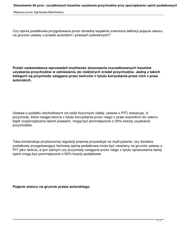 Stosowanie 50 proc. ryczałtowych kosztów uzyskania przychodów przy sporządzaniu opinii podatkowych Wpisany przez Agnieszka Bienkiewicz Czy opinia podatkowa przygotowana przez doradcę wypełnia znamiona definicji pojęcia utworu na gruncie ustawy o prawie autorskim i prawach pokrewnych? Polski ustawodawca wprowadził możliwość stosowania zryczałtowanych kosztów uzyskania przychodów w odniesieniu do niektórych źródeł przychodów. Jedną z takich kategorii są przychody osiągane przez twórców z tytułu korzystania przez nich z praw autorskich. Ustawa o podatku dochodowym od osób fizycznych (dalej: ustawa o PIT) wskazuje, iż przychody, które osiąga twórca z tytułu korzystania przez niego z praw autorskich do utworu bądź rozporządzania takimi prawami, mogą być pomniejszone o 50% koszty uzyskania przychodów. Taka konstrukcja przytoczonej regulacji prawnej przywołuje na myśl pytanie, czy doradca podatkowy przygotowujący fachową opinię podatkową może być uważany na gruncie ustawy o PIT jako twórca, a tym samym czy przychody osiągane przez niego z tytułu opracowania takiej opinii mogą być pomniejszone o 50% koszty podatkowe. Pojęcie utworu na gruncie prawa autorskiego 1/7 Stosowanie 50 proc. ryczałtowych kosztów uzyskania przychodów przy sporządzaniu opinii podatkowych Wpisany przez Agnieszka Bienkiewicz W pierwszej kolejności należałoby poddać pod rozwagę to, czy opinia podatkowa przygotowana przez doradcę wypełnia znamiona definicji pojęcia utworu na gruncie ustawy o prawie autorskim i prawach pokrewnych (dalej: ustawa o prawie autorskim). Wspomniany akt prawny definiuje pojęcie utworu jako każdy przejaw działalności twórczej o indywidualnym charakterze, ustalony w jakiejkolwiek postaci, niezależnie od wartości, przeznaczenia i sposobu wyrażenia. Niewątpliwie powyższa definicja pojęcia utworu jest bardzo szeroka. Wskazuje ona bowiem, iż każda kompozycja bez względu na postać, w jakiej jest utrwalona, swoją wartość czy też przeznaczenie, jeżeli tylko ma swój indywidualny i niepowtarzalny charakter, może zostać uznana za utwór w rozumieniu prawa autorskiego. Tak ogólna definicja, choć pod pewnymi względami korzystna dla twórców, może także nastręczać wiele wątpliwości natury interpretacyjnej. Pewne wytyczne w tym zakresie wyznaczył Sąd Najwyższy (sygn. wyroku III CSK 40/05). Organ orzekający wskazał bowiem, iż aby dzieło mogło być uznane za utwór w myśl prawa autorskiego, musi spełniać trzy główne cechy, to jest: 1. dobro takie jest przejawem działalności twórczej, 2. ma charakter indywidualny, 3. zostało ustalone w jakiejkolwiek postaci. 2/7 Stosowanie 50 proc. ryczałtowych kosztów uzyskania przychodów przy sporządzaniu opinii podatkowych Wpisany przez Agnieszka Bienkiewicz Ponadto Sąd Najwyższy zaznaczył, iż rezultat wysiłku intelektualnego nie może być rutynowy, standardowy i typowy. Nie może być uznany za utwór i objęty ochroną prawa autorskiego taki przejaw ludzkiej aktywności umysłowej, któremu brak cech dostatecznie indywidualizujących, tj. odróżniających go od innych wytworów podobnego rodzaju i przeznaczenia". Uzupełnieniem powyższego orzeczenia jest kolejny wyrok Sądu Najwyższego (sygn. akt I CK 281/05), w którym czytamy, iż wymaganie nowości nie jest niezbędną cechą twórczości jako przejawu intelektualnej działalności człowieka. Utworem może być kompilacja wykorzystująca dane powszechnie dostępne pod warunkiem, że ich wybór, segregacja, sposób przedstawienia ma znamiona oryginalności". Przytoczone orzecznictwo pozwala na wyodrębnienie pewnych charakterystycznych cech, które powinna mieć opinia podatkowa, aby mogła być uznana za utwór w rozumieniu prawa autorskiego. Przede wszystkim powinna więc mieć znamiona dzieła indywidualnego, wyróżniającego się doborem i uporządkowaniem zawartych w niej informacji, a także powinna być pozbawiona jakichkolwiek znamion pospolitości czy szablonowości. Co na to fiskus? Niestety, tak samo jak nie sposób jednolicie określić, który przejaw działalności ludzkiej spełnia definicję utworu na gruncie prawa autorskiego, tak samo i organy podatkowe nie wypracowały do tej pory jednolitego stanowiska w stosunku do kwalifikacji opinii podatkowych jako utworów 3/7 Stosowanie 50 proc. ryczałtowych kosztów uzyskania przychodów przy sporządzaniu opinii podatkowych Wpisany przez Agnieszka Bienkiewicz chronionych prawem autorskim. Pewien kierunek interpretacyjny nadało Ministerstwo Kultury, które w 2001 roku w swoim piśmie (Nr DP/WPA.024/189/01) wskazało, iż kluczowe przy klasyfikacji fachowych opinii i ekspertyz jako utworu chronionego prawem autorskim jest ustalenie, czy przygotowywane są one według z góry ustalonego wzoru niezależnie od autora, czy też autor danego dzieła ma swobodę w kształtowaniu jego treści i formy. Niemniej Minister zaznaczył, iż nie sposób określić jednolitej klasyfikacji, a każdy przypadek powinien być rozpatrywany indywidualnie w okolicznościach konkretnego stanu faktycznego. W tym miejscu można posłużyć się pewną analogią. Swego czasu dość często dyskutowany był przypadek klasyfikacji raportów i opinii biegłych rewidentów jako przejawu działalności twórczej o indywidualnym charakterze. Jak wskazał Minister Finansów w piśmie skierowanym do Krajowej Izby Biegłych Rewidentów (PO 5/JS-1397/0378/97, Biul. Skarb. Nr 3/97) większość raportów i opinii sporządzanych przez biegłych rewidentów w ramach sprawozdań finansowych, będących jednocześnie przedstawieniem sytuacji majątkowej i finansowej badanej jednostki oraz stosowanego przez nią systemu rachunkowości sprowadza się wyłącznie do prostego zestawienia faktów czy danych statystycznych, nie podlega ochronie prawnej. Nie można jednak, zdaniem Ministra, pozbawić każdej opinii biegłego rewidenta charakteru indywidualnej twórczości bez wcześniejsz