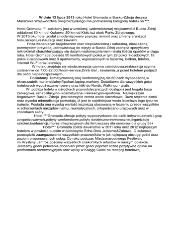 W dniu 12 lipca 2013 roku Hotel Gromada w Busku-Zdroju decyzją Marszałka Województwa Świętokrzyskiego ma podniesioną kategorię hotelu na ***. Hotel Gromada *** położony jest w urokliwej, uzdrowiskowej miejscowości Busko-Zdrój oddalonej 80 km od Krakowa ,50 km od Kielc tuż obok Parku Zdrojowego. W 2013roku hotel został zmodernizowany poprzez remont oraz zmianę aranżacji holu,recepcji,restauracji oraz kawiarni. Poza wspaniałym krajobrazem oraz niepowtarzalną i naturalną, nieskażoną przemysłem przyrodą uzdrowiskową do wizyty w Busko Zdrój zachęca specyficzny mikroklimat charakteryzujący się dużym nasłonecznieniem i małą ilością opadów w ciągu roku. Hotel Gromada posiada 50 komfortowych pokoi,w tym 29 pokoi 1-osobowych,18 pokoi 2-osobowych oraz 3 apartamenty, wyposażonych w łazienkę, balkon, telefon, internet Wi-Fi oraz telewizję . W hotelu znajduje się winda,recepcja czynna całodobowa,restauracja czynna codziennie od 7.00-22.00,Room-service,Drink Bar , kawiarnia.,a przed hotelem podjazd dla osób niepełnosprawnych. Posiadamy klimatyzowaną salę konferencyjną dla 60 osób wyposażoną w ekran,rzutnik multimedialny,flipchart,laptop,markery. Dodatkowo dla wszystkich gości hotelowych wypożyczamy rowery oraz kijki do Nordic Walkingu - gratis. W pobliżu hotelu w ośrodkach przyrodoleczniczych dostępna jest bogata baza zabiegowa, rehabilitacyjno- kosmetyczna i rekreacyjno-sportowa. Największym bogactwem Buska- Zdroju jest niezwykle cenna woda siarczkowa. Duże stężenie siarki oraz wysoka mineralizacja powodują, iż jest to najsilniejsza woda lecznicza tego typu na świecie. Posiada ona wysoką wartość leczniczą stosowaną w leczeniu przede wszystkim w schorzeniach narządów ruchu, reumatycznych, ortopedyczno-urazowych oraz w chorobach skóry. Hotel ***Gromada oferuje pobyty wypoczynkowe dla osób indywidualnych i grup zorganizowanych,pobyty weekendowe,pobyty świąteczno-noworoczne,organizację szkoleń,konferencji,imprez integracyjnych dla firm,wczasy dla seniorów dla grupy 55+. Hotel*** Gromada został dwukrotnie w 2011 roku oraz 2012 najlepszym hotelem w powiecie buskim w plebiscycie Echa Dnia Jedzenie&Zabawa .O sukcesie przesądziło zaangażowanie wszystkich pracowników w jak najlepszą obsługę gości oraz poziom proponowanych usług. Co roku podczas Międzynarodowego Festiwalu im.Krystyny Jamroz gościmy wszystkich znakomitych artystów w naszym obiekcie. Jesteśmy godni polecenia,doceniani przez gości poprzez liczne pozytywne opinie na platformach rezerwacyjnych oraz wpisy w Księgę Gości na recepcji hotelowej.