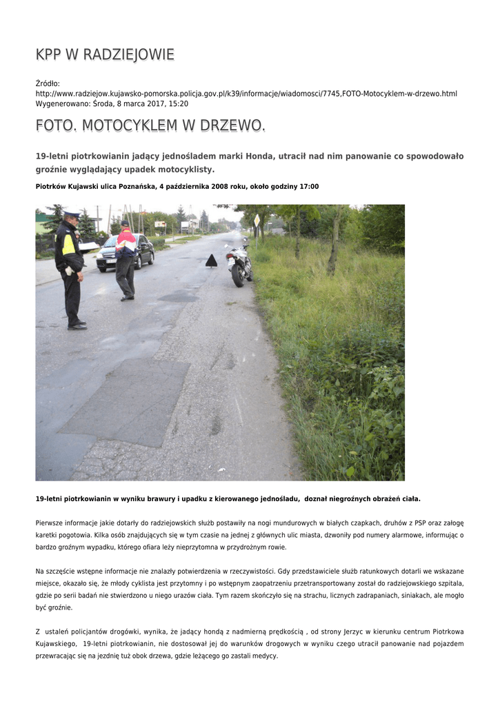 KPP W RADZIEJOWIE Źródło: http://www.radziejow.kujawsko-pomorska.policja.gov.pl/k39/informacje/wiadomosci/7745,FOTO-Motocyklem-w-drzewo.html Wygenerowano: Środa, 8 marca 2017, 15:20 FOTO. MOTOCYKLEM W DRZEWO. 19-letni piotrkowianin jadący jednośladem marki Honda, utracił nad nim panowanie co spowodowało groźnie wyglądający upadek motocyklisty. Piotrków Kujawski ulica Poznańska, 4 października 2008 roku, około godziny 17:00 19-letni piotrkowianin w wyniku brawury i upadku z kierowanego jednośladu, doznał niegroźnych obrażeń ciała. Pierwsze informacje jakie dotarły do radziejowskich służb postawiły na nogi mundurowych w białych czapkach, druhów z PSP oraz załogę karetki pogotowia. Kilka osób znajdujących się w tym czasie na jednej z głównych ulic miasta, dzwoniły pod numery alarmowe, informując o bardzo groźnym wypadku, którego ofiara leży nieprzytomna w przydrożnym rowie. Na szczęście wstępne informacje nie znalazły potwierdzenia w rzeczywistości. Gdy przedstawiciele służb ratunkowych dotarli we wskazane miejsce, okazało się, że młody cyklista jest przytomny i po wstępnym zaopatrzeniu przetransportowany został do radziejowskiego szpitala, gdzie po serii badań nie stwierdzono u niego urazów ciała. Tym razem skończyło się na strachu, licznych zadrapaniach, siniakach, ale mogło być groźnie. Z ustaleń policjantów drogówki, wynika, że jadący hondą z nadmierną prędkością , od strony Jerzyc w kierunku centrum Piotrkowa Kujawskiego, 19-letni piotrkowianin, nie dostosował jej do warunków drogowych w wyniku czego utracił panowanie nad pojazdem przewracając się na jezdnię tuż obok drzewa, gdzie leżącego go zastali medycy. Niewątpliwie przed groźnymi skutkami uchronił młodzieńca, kask ale i tak przez chwilę wydawało się to bardzo groźne dla zdrowia poszkodowanego. 19-latek za przyczynienie się do zaistniałej sytuacji na drodze, ukarany został 200 złotowym mandatem. Dopisano również do jego konta 6pkt karnych. (foto: starszy sierżant Marek Maniewski KPP Radziejów) Autor: red2.kpra Publikacja: red2.kpra Ocena: 0/5 (0) Tweetnij