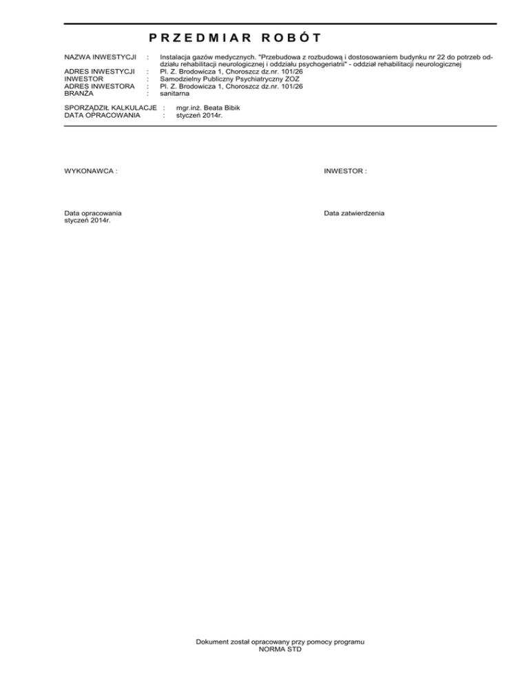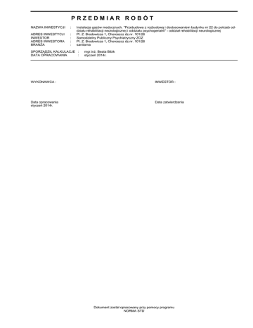 PRZEDMIAR ROBÓT NAZWA INWESTYCJI : ADRES INWESTYCJI INWESTOR ADRES INWESTORA BRANŻA : : : : Instalacja gazów medycznych. "Przebudowa z rozbudową i dostosowaniem budynku nr 22 do potrzeb oddziału rehabilitacji neurologicznej i oddziału psychogeriatrii" - oddział rehabilitacji neurologicznej Pl. Z. Brodowicza 1, Choroszcz dz.nr. 101/26 Samodzielny Publiczny Psychiatryczny ZOZ Pl. Z. Brodowicza 1, Choroszcz dz.nr. 101/26 sanitarna SPORZĄDZIŁ KALKULACJE : DATA OPRACOWANIA : mgr.inż. Beata Bibik styczeń 2014r. WYKONAWCA : INWESTOR : Data opracowania styczeń 2014r. Data zatwierdzenia Dokument został opracowany przy pomocy programu NORMA STD OGÓLNA CHARAKTERYSTYKA OBIEKTU NAZWA ZADANIA INSTALACJA GAZÓW MEDYCZNYCH Przebudowa z rozbudową i dostosowaniem budynku nr 22 do potrzeb oddziału rehabilitacji neurologicznej i oddziału psychogeriatrii wraz z zagospodarowaniem terenu. OPIS ROBÓT Niniejszy przedmiar i kosztorys dotyczy robót sanitarnych związanych z budową instalacji gazów medycznych: tlenu na terenie Szpitala Psychiatrycznego w Choroszczy. DANE CHARAKTERYSTYCZNE Niniejsza wycena obejmuje montaż instalacji tlenu. Wycenia się rurociągi z rur miedzianych przeznaczonych do gazów medycznych. Nad łóżkami pacjentów przewidziano podtynkowe oraz natynkowe punkty poboru tlenu. Miejsce włączenia przebudowywanej instalacji znajduje się w budynku 22A do rurociągu fi 22x1 mm. ZAKRES PRAC Roboty montażowe -2- Norma STD Wersja 4.36 Nr seryjny: 12077 Lp. Podstawa Nr Opis i wyliczenia spec. techn. INSTALACJA GAZÓW MEDYCZNYCH 1 45330000-9 INSTALACJA POWIETRZA MEDYCZNEGO 1.1 Instalacja powietrza medycznego - rurociągi 1 KNR 2-15 SST.III. Montaż rurociągów miedzianych fi 10x1 mm d.1. 0601-02 5.1 1 33.0 2 KNR 2-15 d.1. 0601-03 1 SST.III. Montaż rurociągów miedzianych fi 12x1 mm 5.1 trójnik miedziany fi 10/10/10 mm - 2szt trójnik miedziany fi 12/10/10 mm - 1szt 3.0 4 KNR 2-15 d.1. 0606-02 1 SST.III. Montaż kolan miedzianych fi 10 mm 5.1 SST.III. Montaż kolan miedzianych fi 12 mm 5.1 szt. szt. SST.III. Połączenia lutowane elementów instalacji gazów medycznych fi 10 mm 5.1 2.000 3.000 RAZEM 3.000 16.000 RAZEM 16.000 3.000 RAZEM 3.000 40.000 RAZEM 40.000 7.000 RAZEM 7.000 szt. szt. SST.III. Połączenia lutowane elementów instalacji gazów medycznych fi 12 mm 5.1 7.0 1.2 8 KNR 2-15 d.1. 0633-01 2 2.000 RAZEM szt. 40.0 7 KNR 2-15 d.1. 0634-04 1 33.000 szt. szt. 3.0 6 KNR 2-15 d.1. 0634-03 1 33.000 RAZEM szt. 16.0 5 KNR 2-15 d.1. 0606-03 1 szt. szt. Instalacja powietrza medycznego - próby, uruchomienia SST.III. Przygotowanie instalacji gazów medycznych do uruchomienia - przedmu- pkt.po 5.1 chanie b. poz.12 pkt.po b. 4.000 RAZEM 9 KNR 2-15 d.1. 0633-02 2 odc.30 m 1.000 RAZEM odc.30 m 0.167 RAZEM 0.167 SST.III. Przygotowanie instalacji gazów medycznych do uruchomienia - napełnie- pkt.po 5.1 nie b. poz.12 pkt.po b. 4.000 RAZEM 1.3 1.000 SST.III. Przygotowanie instalacji gazów medycznych do uruchomienia - próba na odc.30 5.1 ciśnienie do 1.0 MPa - nast. 30 m m ((poz.1+poz.2)-30)/30 11 KNR 2-15 d.1. 0633-06 2 4.000 SST.III. Przygotowanie instalacji gazów medycznych do uruchomienia - próba na odc.30 5.1 ciśnienie do 1.0 MPa - pierwsze 30 m m 1.0 10 KNR 2-15 d.1. 0633-03 2 Razem m m SST.III. Montaż trójników miedzianych fi 10 mm 5.1 Poszcz m m 2.0 3 KNR 2-15 d.1. 0604-02 1 j.m. Instalacja powietrza medycznego - punkty poboru -3- Norma STD Wersja 4.36 Nr seryjny: 12077 4.000 Lp. Podstawa 12 KNR 2-15 d.1. 0613-01 3 Nr Opis i wyliczenia spec. techn. SST.III. Montaż punktów poboru tlenu - nadtynkowych 5.1 nadtynkowy punkt poboru tlenu AGA 4.0 1.4 13 KNR 2-15 d.1. 0617-02 4 Instalacja powietrza medycznego - armatura SST.III. Montaż skrzynki zaworowo-informacyjnej 5.1 Poszcz Razem kpl. kpl. skrzynka zaworowo-informacyjna SZI-2 1.0 1.5 14 KNR 4-01 d.1. 0333-17 5 j.m. 4.000 RAZEM 4.000 1.000 RAZEM 1.000 2.000 RAZEM 2.000 kpl. kpl. Instalacja powietrza medycznego - towarzyszące roboty budowlane SST.III. Przebicie otworów w ścianach z cegieł o gr. 1 1/2 cegły na zaprawie ce- szt. 5.1 mentowej 2.0 szt. -4- Norma STD Wersja 4.36 Nr seryjny: 12077