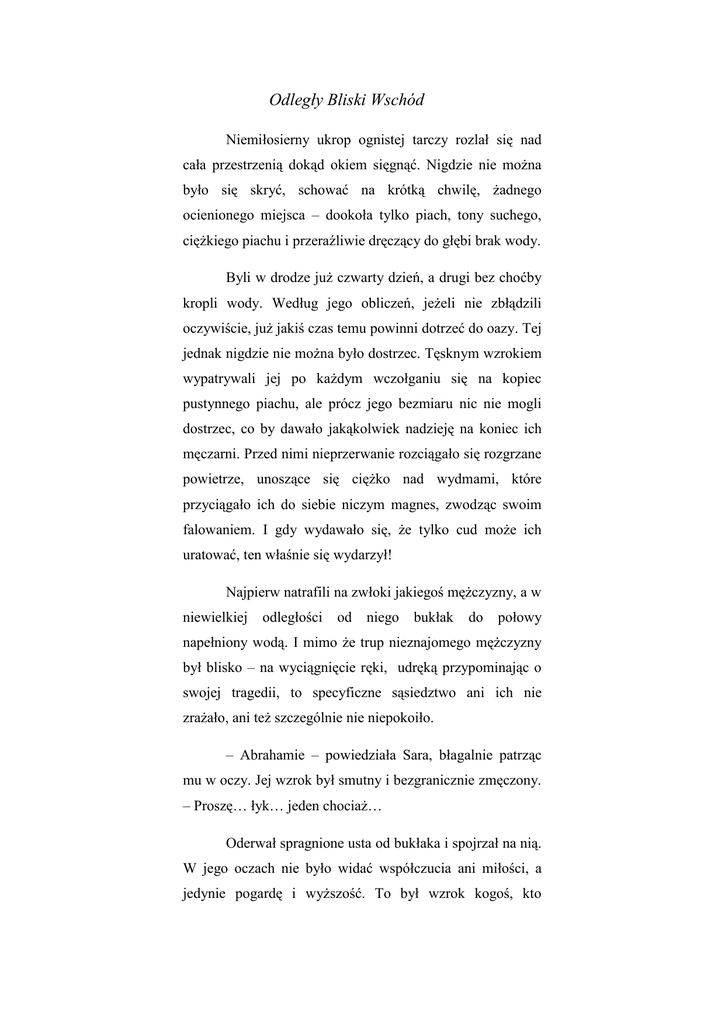 Odległy Bliski Wschód Niemiłosierny ukrop ognistej tarczy rozlał się nad cała przestrzenią dokąd okiem sięgnąć. Nigdzie nie można było się skryć, schować na krótką chwilę, żadnego ocienionego miejsca – dookoła tylko piach, tony suchego, ciężkiego piachu i przeraźliwie dręczący do głębi brak wody. Byli w drodze już czwarty dzień, a drugi bez choćby kropli wody. Według jego obliczeń, jeżeli nie zbłądzili oczywiście, już jakiś czas temu powinni dotrzeć do oazy. Tej jednak nigdzie nie można było dostrzec. Tęsknym wzrokiem wypatrywali jej po każdym wczołganiu się na kopiec pustynnego piachu, ale prócz jego bezmiaru nic nie mogli dostrzec, co by dawało jakąkolwiek nadzieję na koniec ich męczarni. Przed nimi nieprzerwanie rozciągało się rozgrzane powietrze, unoszące się ciężko nad wydmami, które przyciągało ich do siebie niczym magnes, zwodząc swoim falowaniem. I gdy wydawało się, że tylko cud może ich uratować, ten właśnie się wydarzył! Najpierw natrafili na zwłoki jakiegoś mężczyzny, a w niewielkiej odległości od niego bukłak do połowy napełniony wodą. I mimo że trup nieznajomego mężczyzny był blisko – na wyciągnięcie ręki, udręką przypominając o swojej tragedii, to specyficzne sąsiedztwo ani ich nie zrażało, ani też szczególnie nie niepokoiło. – Abrahamie – powiedziała Sara, błagalnie patrząc mu w oczy. Jej wzrok był smutny i bezgranicznie zmęczony. – Proszę… łyk… jeden chociaż… Oderwał spragnione usta od bukłaka i spojrzał na nią. W jego oczach nie było widać współczucia ani miłości, a jedynie pogardę i wyższość. To był wzrok kogoś, kto przypominał nim o odwiecznym i trwałym podziale – na pana i sługę, i kto tutaj jest właśnie owym panem! Przez dłuższą chwilę przypatrywał jej się w milczeniu, jakby zbierał w sobie siły na atak, aż w końcu niespodziewanie powiedział: – Trzymaj – podał jej bukłak z wodą i zaraz dodał tonem upomnienia: – Ale nie za dużo! Dwa razy nie trzeba było jej powtarzać. Szybkim ruchem otworzyła bukłak i już w następnej chwili życiodajny płyn gasił jej nieokiełznane pragnienie. Chłonęła wodę zachłannie, głucha na cały zewnętrzny, pustynny świat, który i tak nie miał jej nic do powiedzenia – był niemy. – Dosyć! – warknął gwałtownie Abraham, brutalnie wyrywając jej pojemnik z wodą. – Zwariowałaś?! Nie wiadomo, ile jeszcze drogi przed nami, a ty, jak zwykle, zachowujesz się bezmyślnie. – Pociągnął jeszcze dwa krótkie łyki i przewiesił sobie bukłak przez ramię. Był wycieńczony, ale ta sytuacja jakby odrodziła w nim dawną energię. – Jesteś tylko kobietą, nie zapominaj o tym! – powiedział i zabrzmiało to tak, jak co najmniej jakiś wyrzut. Jakby wolał być teraz tutaj z jakimś innym mężczyzną, albo nawet sam. Jakby bycie z kobietą było jakimś ciężkim grzechem, występkiem czy w ogóle jakąś okrutną zbrodnią wymierzoną przeciwko ludzkości. – Nawet jeżeli wyzioniesz tutaj ducha, to… – wykonał nieokreślony ruch ręką – nic się nie stanie. Sama dobrze o tym wiesz, że jesteś… jesteś mniej przydatna w obecnych warunkach. Gdyby nie ty, to… to może… – zawahał się – to z pewnością miałbym większe 2 szanse przeżycia z tą odrobina wody, jaką mamy. Chyba to rozumiesz? Skinęła głowa. Nie miała sił na niego spojrzeć, a co dopiero spierać się z nim. „Trudno uwierzyć, że tyle lat z nim wytrzymałam – pomyślała. – Z tą chłodną, beznamiętną istotą, pozbawioną ludzkich uczuć. Zniszczył mnie… Nie mam nawet siły plunąć mu w twarz. Zresztą, co by to dało…? Boże, pozwól mi umrzeć bez cierpień. Uwolnij mnie od tej bestii w ludzkiej…” – No co – odezwał się po chwili – odpoczęłaś? Trzeba się zbierać. Jest szansa, że się stąd wydostaniemy. Ale pod jednym warunkiem – musimy iść, ciągle iść, nie zatrzymywać się. Nic nie odpowiedziała. Ogromne zmęczenie drogą, której końca nie było widać, spowodowało nagłą senność. Mimo lejącego się leniwie i bezlitośnie żaru z pękniętego nieba, spała. Snem przyjemnym, w którym byli wszyscy najbliżsi – zarówno ci żyjący, jak i ci, którzy jakiś czas temu odeszli, ale gdzie wszyscy razem byli uśmiechnięci i dziwnie beztroscy. A wokół pełno było soczystej zieleni. Gdy nie odpowiedziała, Abraham spojrzał na nią i w tym samym momencie jakby doznał olśnienia. Pomyślał: „Musisz mnie zrozumieć, Saro – bez ciebie mam większą szansę. Samemu mi się uda, z tobą…” – Wolno wstał i nie oglądając się za siebie, ruszył w dalszą drogę. Jego oddalająca się postać powoli malała, ginęła w drętwym powietrzu, sprawiając wrażenie, jakby się zapadała w gorącym, suchym pisaku, tworząc z nim spójną całość. Wkrótce, odprowadzana spokojnym wzrokiem Sary, znikła ostatecznie. 3 17.04.1988 r. 4