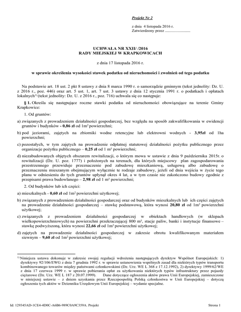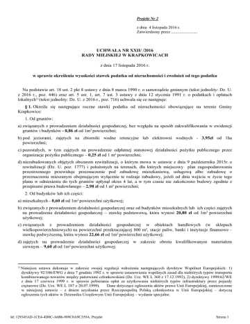 Projekt Nr 2 z dnia 4 listopada 2016 r. Zatwierdzony przez ......................... UCHWAŁA NR XXII/ /2016 RADY MIEJSKIEJ W KRAPKOWICACH z dnia 17 listopada 2016 r. w sprawie określenia wysokości stawek podatku od nieruchomości i zwolnień od tego podatku Na podstawie art. 18 ust. 2 pkt 8 ustawy z dnia 8 marca 1990 r. o samorządzie gminnym (tekst jednolity: Dz. U. z 2016 r., poz. 446) oraz art. 5 ust. 1, art. 7 ust. 3 ustawy z dnia 12 stycznia 1991 r. o podatkach i opłatach lokalnych1) (tekst jednolity: Dz. U. z 2016 r., poz. 716) uchwala się co następuje: § 1. Określa się następujące roczne stawki podatku od nieruchomości obowiązujące na terenie Gminy Krapkowice: 1. Od gruntów: a) związanych z prowadzeniem działalności gospodarczej, bez względu na sposób zakwalifikowania w ewidencji gruntów i budynków - 0,86 zł od 1m2 powierzchni; b) pod jeziorami, zajętych na zbiorniki wodne retencyjne lub elektrowni wodnych - 3,95zł od 1ha powierzchni; c) pozostałych, w tym zajętych na prowadzenie odpłatnej statutowej działalności pożytku publicznego przez organizacje pożytku publicznego – 0,25 zł od 1 m² powierzchni; d) niezabudowanych objętych obszarem rewitalizacji, o którym mowa w ustawie z dnia 9 października 2015r. o rewitalizacji (Dz. U. poz. 1777) i położonych na terenach, dla których miejscowy plan zagospodarowania przestrzennego przewiduje przeznaczenie pod zabudowę mieszkaniową, usługową albo zabudowę o przeznaczeniu mieszanym obejmującym wyłącznie te rodzaje zabudowy, jeżeli od dnia wejścia w życie tego planu w odniesieniu do tych gruntów upłynął okres 4 lat, a w tym czasie nie zakończono budowy zgodnie z przepisami prawa budowlanego – 2,98 zł od 1 m² powierzchni; 2. Od budynków lub ich części: a) mieszkalnych - 0,60 zł od 1m2 powierzchni użytkowej; b) związanych z prowadzeniem działalności gospodarczej oraz od budynków mieszkalnych lub ich części zajętych na prowadzenie działalności gospodarczej – stawkę podstawową, która wynosi 20,80 zł od 1m2 powierzchni użytkowej; c) związanych z prowadzeniem działalności gospodarczej w obiektach handlowych (w sklepach wielkopowierzchniowych) na powierzchni przekraczającej 800 m², stacje paliw, banki i instytucje finansowe – stawkę podwyższoną, która wynosi 22,66 zł od 1m2 powierzchni użytkowej; d) zajętych na prowadzenie działalności gospodarczej w zakresie obrotu kwalifikowanym materiałem siewnym – 9,60 zł od 1m2 powierzchni użytkowej; 1) Niniejsza ustawa dokonuje w zakresie swojej regulacji wdrożenia następujących dyrektyw Wspólnot Europejskich: 1) dyrektywy 92/106/EWG z dnia 7 grudnia 1992 r. w sprawie ustanowienia wspólnych zasad dla niektórych typów transportu kombinowanego towarów między państwami członkowskimi (Dz. Urz. WE L 368 z 17.12.1992), 2) dyrektywy 1999/62/WE z dnia 17 czerwca 1999 r. w sprawie pobierania opłat za użytkowania niektórych typów infrastruktury przez pojazdy ciężarowe (Dz. Urz. WE L 187 z 20.07.1999). Dane dotyczące ogłoszenia aktów prawa Unii Europejskiej, zamieszczone w niniejszej ustawie – z dniem uzyskania przez Rzeczpospolitą Polską członkostwa w Unii Europejskiej – dotyczą ogłoszenia tych aktów w Dzienniku Urzędowym Unii Europejskiej – wydanie specjalne. Id: 129345AD-1CE4-4D0C-A6B6-989C0A9C359A. Projekt Strona 1 e) związanych z udzielaniem świadczeń zdrowotnych w rozumieniu przepisów o działalności leczniczej, zajętych przez podmioty udzielające tych świadczeń - 4,61 zł od 1m2 powierzchni użytkowej; f) pozostałych, w tym zajętych na prowadzenie odpłatnej statutowej działalności pożytku publicznego przez organizacje pożytku publicznego z wyłączeniem stanowiących garaże zlokalizowane poza budynkami mieszkalnymi nie związane z prowadzeniem działalności gospodarczej - 4,10 zł od 1m2 powierzchni użytkowej; g) pozostałych, w tym zajętych na prowadzenie odpłatnej statutowej działalności pożytku publicznego stanowiących garaże zlokalizowane poza budynkami mieszkalnymi nie związane z prowadzeniem działalności gospodarczej – 6,35 zł od 1m2 powierzchni użytkowej; 3. Od budowli 2% ich wartości określonej na podstawie art. 4 ust. 1 pkt. 3 i ust. 3-7 ustawy o podatkach i opłatach lokalnych. § 2. Zwalnia się od podatku od nieruchomości grunty, budynki i budowle stanowiące własność (współwłasność) albo będące w posiadaniu (współposiadaniu) lub trwałym zarządzie, z wyjątkiem zajętych na prowadzenie działalności gospodarczej: 1) zajęte na potrzeby ochrony przeciwpożarowej; 2) zajęte na potrzeby bezpieczeństwa publicznego; 3) zajęte na prowadzenie działalności kulturalnej, sportowej; 4) zajęte na prowadzenie statutowej działalności oświatowej, charytatywno-opiekuńczej; 5) zajęte na potrzeby pomocy społecznej. § 3. Z dniem 31 grudnia 2016 roku traci moc uchwała nr XI/128/2015 Rady Miejskiej w Krapkowicach z dnia 5 listopada 2015r. w sprawie określenia wysokości stawek podatku od nieruchomości i zwolnień od tego podatku. § 4. Wykonanie uchwały powierza się Burmistrzowi Krapkowic. § 5. Uchwała wchodzi w życie z dniem 1 stycznia 2017r. i po jej ogłoszeniu w Dzienniku Urzędowym Województwa Opolskiego. Podlega ogłoszeniu na tablicach ogłoszeń, Biuletynie Informacji Publicznej Urzędu Miasta i gminy w Krapkowicach. Burmistrz Krapkowic Andrzej Kasiura Id: 129345AD-1CE4-4D0C-A6B6-989C0A9C359A. Projekt Strona 2 Uzasadnienie W przedłożonym projekcie zaproponowano stawki podatkowe w wysokości obowiązującej w 2016r., z wyjątkiem stawki dla budynków związanych z prowadzeniem działalności gospodarczej w obiektach handlowych (w sklepach wielkopowierzchniowych) na powierzchni przekraczającej 800m², stacje paliw, banki i instytucje finansowe, którą należało zmniejszyć z kwoty 22,86 zł do kwoty 22,66 zł oraz stawki związanych z udzielaniem świadczeń zdrowotnych w rozumieniu przepisów o działalno