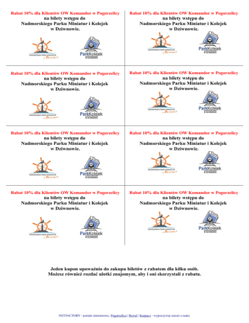 Rabat 10% dla Klientów OW Komandor w Pogorzelicy Rabat 10% dla Klientów OW Komandor w Pogorzelicy na bilety wstępu do Nadmorskiego Parku Miniatur i Kolejek w Dziwnowie. na bilety wstępu do Nadmorskiego Parku Miniatur i Kolejek w Dziwnowie. Rabat 10% dla Klientów OW Komandor w Pogorzelicy Rabat 10% dla Klientów OW Komandor w Pogorzelicy na bilety wstępu do Nadmorskiego Parku Miniatur i Kolejek w Dziwnowie. na bilety wstępu do Nadmorskiego Parku Miniatur i Kolejek w Dziwnowie. Rabat 10% dla Klientów OW Komandor w Pogorzelicy Rabat 10% dla Klientów OW Komandor w Pogorzelicy na bilety wstępu do Nadmorskiego Parku Miniatur i Kolejek w Dziwnowie. na bilety wstępu do Nadmorskiego Parku Miniatur i Kolejek w Dziwnowie. Rabat 10% dla Klientów OW Komandor w Pogorzelicy Rabat 10% dla Klientów OW Komandor w Pogorzelicy na bilety wstępu do Nadmorskiego Parku Miniatur i Kolejek w Dziwnowie. na bilety wstępu do Nadmorskiego Parku Miniatur i Kolejek w Dziwnowie. Jeden kupon upoważnia do zakupu biletów z rabatem dla kilku osób. Możesz również rozdać ulotki znajomym, aby i oni skorzystali z rabatu. NETFACTORY - portale internetowe. Pogorzelica | Rewal | Karpacz - wypoczywaj razem z nami.