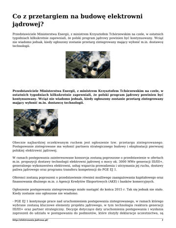Co z przetargiem na budowę elektrowni jądrowej? Przedstawiciele Ministerstwa Energii, z ministrem Krzysztofem Tchórzewskim na czele, w ostatnich tygodniach kilkukrotnie zapewniali, że polski program jądrowy powinien być kontynuowany. Wciąż nie wiadomo jednak, kiedy ogłoszony zostanie przetarg zintegrowany mający wyłonić m.in. dostawcę technologii. Przedstawiciele Ministerstwa Energii, z ministrem Krzysztofem Tchórzewskim na czele, w ostatnich tygodniach kilkukrotnie zapewniali, że polski program jądrowy powinien być kontynuowany. Wciąż nie wiadomo jednak, kiedy ogłoszony zostanie przetarg zintegrowany mający wyłonić m.in. dostawcę technologii. Obecnie najbardziej oczekiwanym ruchem jest ogłoszenie tzw. przetargu zintegrowanego. Postępowanie zintegrowane ma wyłonić partnera strategicznego budowy i eksploatacji pierwszej polskiej elektrowni jądrowej. W ramach postępowania zainteresowane konsorcja zostaną poproszone o przedstawienie w ofertach m.in. propozycji dostawy technologii elektrowni jądrowej o mocy ok. 3000 MWe generacji III/III+, generalnego wykonawstwa elektrowni, usług wsparcia prowadzenia i utrzymania jej ruchu, dostawy paliwa jądrowego oraz programu transferu kompetencji do PGE EJ 1. Oferenci zostaną poproszeni o przedstawienie również możliwego zaangażowania kapitałowego oraz finansowania dłużnego m.in. z Agencji Kredytów Eksportowych (AKE) i banków komercyjnych. Ogłoszenie postępowania zintegrowanego miało nastąpić do końca 2015 r. Tak się jednak nie stało. Kiedy zostanie ono ogłoszone nie wiadomo. - PGE EJ 1 kontynuuje prace nad uruchomieniem postępowania zintegrowanego, w ramach którego wybrane zostaną kluczowe elementy projektu jądrowego, w tym technologia reaktora generacji III/III+ oraz partner strategiczny. Decyzje dotyczące daty uruchomienia postępowania i wysłania zaproszeń do udziału w postępowaniu do podmiotów, które złożyły deklaracje uczestnictwa, są http://elektrownia-jadrowa.pl/ 1 obecnie w przygotowaniu - poinformowała wnp.pl spółka PGE EJ1, która ma być odpowiedzialna za budowę i eksploatację pierwszej polskiej elektrowni jądrowej. PGE EJ 1 dodaje, że szczegółowy harmonogram postępowania zintegrowanego zostanie przedstawiony w momencie jego uruchomienia. Przypomnijmy, że we wrześniu 2014 r. PGE EJ 1 podpisała ze spółką AMEC Foster Wheeler umowę na usługi doradztwa technicznego w procesie inwestycyjnym związanym z budową pierwszej polskiej elektrowni jądrowej. AMEC Foster Wheeler ma wspierać PGE EJ 1 m.in. w przeprowadzeniu przetargu na wybór dostawcy i technologii reaktora. PGE EJ 1 już dość dawno otrzymała deklaracje o przystąpieniu do postępowania zintegrowanego od czołowych koncernów dysponujących technologiami atomowymi, tj. od Arevy, GE Hitachi, Westinghouse, SNC Lavalin i Kepco. Postępowanie ma być prowadzone na podstawie przyjętego regulaminu, a nie na podstawie prawa zamówień publicznych. Wcześniej PGE EJ 1 zakładało, że jeżeli przetarg zintegrowany zostanie ogłoszony w 2015 r., to jego rozstrzygnięcia można spodziewać się w roku 2019. Teoretycznie ten termin jest do utrzymania, ale w praktyce może on ulec przesunięciu. W przyjętym przez rząd PO-PSL w styczniu 2014 Programie Polskiej Energetyki Jądrowej zapisano, że uruchomienie pierwszego bloku jądrowego w Polsce nastąpi w roku 2024. W ubiegłym roku PGE w korespondencji technicznej z Polskimi Sieciami Elektroenergetycznymi (PSE) zapowiedziała, że pierwszy blok jądrowy ruszy w roku 2029. Dawne Ministerstwo Gospodarki szacowało, że 220 polskich firm jest zainteresowanych udziałem w polskim projekcie jądrowym, z czego 58 ma doświadczenie w tej dziedzinie. Polskie firmy pracują, bądź pracowały, m.in. na budowach bloków jądrowych Olkiluoto III w Finlandii oraz Flamanville 3 we Francji. źródło: wnp.pl http://elektrownia-jadrowa.pl/ 2