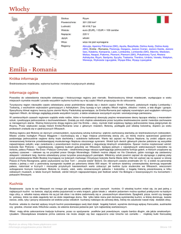 Włochy Stolica: Rzym Powierzchnia: 301 230 km² Ludność: 60 418,7 tys Waluta: euro (EUR), 1 EUR = 100 centów Napięcie: 220 V Język: włoski Wiza: wiza nie jest wymagana Regiony: Abruzja, Apeniny Północne (SKI), Apulia, Bazylikata, Dolina Aosty, Dolina Aosty (SKI), Emilia - Romania, Florencja, Gargano, Jezioro Comer, Jezioro Garda, Jezioro Iseo, Kalabria, Kampania, Lazio, Lombardia, Lombardia (SKI), Marche, Mediolan, Moliza, Neapol, Palermo, Piemont, Piemont (SKI), Południowy Tyrol, Riwiera Adriatycka, Rzym, Sardynia, Sycylia, Toskania, Trentino, Umbria, Veneto, Watykan, Wenecja, Wybrzeże Liguryjskie, Wyspa Elba, Wyspy Liparyjskie Emilia - Romania Krótka informacja Średniowieczne miasteczka, wyborna kuchnia i mnóstwo turystycznych atrakcji. Informacje ogólne Powodów do odwiedzenia niezwykle ciekawego i historycznego regionu jest niemało. Średniowieczny klimat miasteczek, występujące w wielu miejscach rzymskie mozaiki i przede wszystkim wyborna kuchnia są w tej części Włoch propozycją nie do odrzucenia. Turystyczny region niezwykle często odwiedzany przez podróżników składa się z dwóch części: Emilii i Romanii, położonych między Lombardią i Toskanią, z wschodnim wybrzeżem graniczącym z Adriatykiem. Zimy bywają w tym zakątku Włoch mgliste, chłodne i mokre, a lata długie i gorące. Specyficzny klimat regionu tworzą żyzne ziemie Niziny Padeńskiej sprawiające, że Emilia-Romania jest najlepiej rozwiniętym pod względem rolniczym regionem Włoch, do którego zaglądają przede wszystkim turyści, a także smakosze soczystych szynek i aromatycznego parmezanu. W zamierzchłych czasach regionem rządziło wiele rodów, które w konsekwencji stworzyły prężne renesansowe dwory łączące władzę z mecenatem sztuki, rywalizujące jednocześnie z duchowieństwem. Zostały po nich chętnie odwiedzane przez turystów średniowieczne zamki i twierdze zachowane w nienagannym stanie. Ważną historycznie drogą regionu jest Via Emilia – stary, rzymski trakt wojskowy będący jednocześnie trasą pielgrzymek do Rzymu. Przez większość swojej historii Emilia-Romania wraz z głównym miastem, Bolonią, podlegała pod władzę kościelną, dopiero po wielu protestach znalazła się w zjednoczonych Włoszech. Stolicą regionu jest Bolonia ze słynnym uniwersytetem, wyszukaną sztuką kulinarną i pięknie zachowaną starówką ze średniowiecznym rodowodem. Miasto urzeka rozległym Piazza Maggiore i rozchodzącą się z tego miejsca promienistą siecią ulic, po której można spacerować godzinami podziwiając jednocześnie ceglane domy kryte dachówką i ozdobione balkonami. Warto też zajrzeć na Piazza Neptune, by zrobić zdjęcie przy renesansowej fontannie przedstawiającej muskularnego Neptuna otoczonego syrenami. Wokół tych dwóch głównych placów położone są wszystkie najważniejsze zabytki, więc zwiedzanie z powodzeniem można przeplatać z degustacją lokalnych smakołyków. Spacer można rozplanować wśród: kościoła San Petronio – najciekawszej, ceglanej budowli gotyckiej we Włoszech, będącej jednym z największych wielonawowych kościołów na świecie, pałacu Palazzo Re Enzo i Palazzo Comunale – średniowiecznego ratusza spełniającego jednocześnie funkcje galerii, w których urządzane są wystawy czasowe – ciekawe są na przykład prace Giorgia Morandiego. Oddech można złapać na Via Clavature, gdzie rozciąga się zastawiony sklepami i stoiskami targ, tłumnie odwiedzany przez turystów poszukujących pamiątek. Miłośnicy sztuki powinni zajrzeć do słynącego z pięknej piety (czyli przedstawienia Matki Boskiej trzymającej na kolanach martwego Chrystusa) kościoła Santa Maria della Vita lub wybrać się na spacer w stronę Piazza di Porta Ravegnana, gdzie usytuowane są Due Torri – „krzywe wieże” Bolonii. Do obecnych czasów przetrwało ich 12, a widok na panoramę miasta z jednej z nich z pewnością wynagrodzi wysiłek po pokonaniu blisko 500 stopni. W centrum dzielnicy uniwersyteckiej dominują wspaniałe pałace, natomiast w licznych i niezwykle przytulnych kawiarenkach warto zobaczyć jak kwitnie życie studenckie we Włoszech, wieczorami wzbogacane licznymi koncertami. Bolonia to miasto, wież, wielu renesansowych pałaców i kościołów, z bogatą historią prezentowaną w kilku ciekawych muzeach, a także licznych festiwali, wśród których najpopularniejszy jest festiwal sztuki Via Bologna z towarzyszącymi mu koncertami i pokazami filmowymi. Kuchnia Świętowanie życia to we Włoszech nic innego jak spożywanie posiłków i picie zacnych trunków. O włoskiej kuchni mówi się, że jest jedną z najlepszych kuchni na świecie, stąd jej wielka popularność w wielu krajach, gdzie lokale z włoskim jedzeniem można spotkać praktycznie na każdym rogu ulicy, a włoskie nazwy własne nie są już tak obce i na dobre zadomowiły się w powszechnym słownictwie. Spaghetti, pizza, ravioli czy lasagna to potrawy, które na stałe zagościły też na stole niejednego domu. Nie tylko takie menu jest domeną wyśmienitej kuchni, w której dominują świeże owoce, zioła, ryby i jarzyny stosowane od wieków przez włoskich kucharzy należące do zdrowej diety, której nie zaszkodzi nawet mały dodatek oliwy. Kuchnia włoska to również wpływy innych kuchni pozostawiające swój ślad dzięki bogatej historii, wyraźnie dominują wpływy francuskie, austriackie czy greckie, chociaż wielu Włochów uważa, że właśnie domowe jedzenie jest tym najbardziej wartościowym. Włosi mają silnie zakorzenione tradycje kulinarne, przez co spożywanie posiłków jest prawdziwym, często bardzo długim, ale jakże smakowitym rytuałem. Obowiązkowe śniadanie prima calzione nie może obejść się bez cappuccino oraz brioche lub cornetto – miękkiej bułki francuskiej Wydruk ze strony http://www.pbpkrosno.com Informacje przygotowane przez MerlinX Strona 1/6 nadziewanej dżemem, kremem czy czekoladą, t