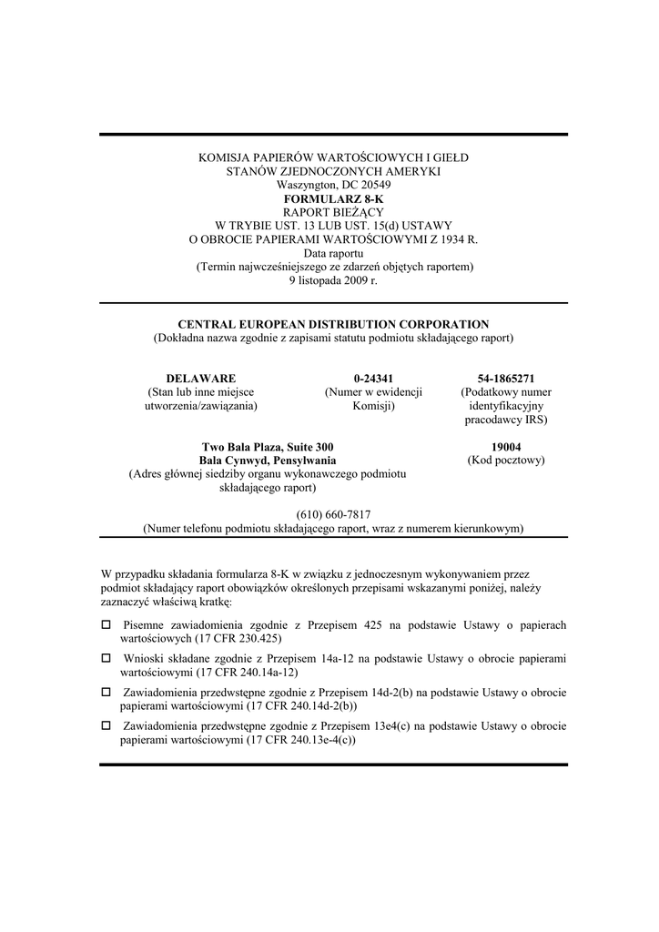 KOMISJA PAPIERÓW WARTOŚCIOWYCH I GIEŁD STANÓW ZJEDNOCZONYCH AMERYKI Waszyngton, DC 20549 FORMULARZ 8-K RAPORT BIEśĄCY W TRYBIE UST. 13 LUB UST. 15(d) USTAWY O OBROCIE PAPIERAMI WARTOŚCIOWYMI Z 1934 R. Data raportu (Termin najwcześniejszego ze zdarzeń objętych raportem) 9 listopada 2009 r. CENTRAL EUROPEAN DISTRIBUTION CORPORATION (Dokładna nazwa zgodnie z zapisami statutu podmiotu składającego raport) DELAWARE (Stan lub inne miejsce utworzenia/zawiązania) 0-24341 (Numer w ewidencji Komisji) Two Bala Plaza, Suite 300 Bala Cynwyd, Pensylwania (Adres głównej siedziby organu wykonawczego podmiotu składającego raport) 54-1865271 (Podatkowy numer identyfikacyjny pracodawcy IRS) 19004 (Kod pocztowy) (610) 660-7817 (Numer telefonu podmiotu składającego raport, wraz z numerem kierunkowym) W przypadku składania formularza 8-K w związku z jednoczesnym wykonywaniem przez podmiot składający raport obowiązków określonych przepisami wskazanymi poniŜej, naleŜy zaznaczyć właściwą kratkę: Pisemne zawiadomienia zgodnie z Przepisem 425 na podstawie Ustawy o papierach wartościowych (17 CFR 230.425) Wnioski składane zgodnie z Przepisem 14a-12 na podstawie Ustawy o obrocie papierami wartościowymi (17 CFR 240.14a-12) Zawiadomienia przedwstępne zgodnie z Przepisem 14d-2(b) na podstawie Ustawy o obrocie papierami wartościowymi (17 CFR 240.14d-2(b)) Zawiadomienia przedwstępne zgodnie z Przepisem 13e4(c) na podstawie Ustawy o obrocie papierami wartościowymi (17 CFR 240.13e-4(c)) Ustęp 1.01. Zawarcie Istotnej Umowy Rozporządzającej Zgodnie z wcześniejszą informacją, w dniu 9 lipca 2008 r. Central European Distribution Corporation (“Spółka”) wraz z Lion Capital LLP (“Lion Capital”) oraz niektórymi spółkami zaleŜnymi Lion (wraz z Lion Capital zwane dalej “Lion”) i pewnymi innymi inwestorami dokonała inwestycji, w wyniku której Spółka, Lion i wspomniani inni inwestorzy nabyli wszystkie pozostające w obrocie udziały kapitałowe Russian Alcohol Group (“RAG”) (“Wcześniejsza Umowa”). Zgodnie z informacją ujawnioną we wcześniejszym raporcie na Formularzu 8-K złoŜonym przez Spółkę w dniu 30 kwietnia 2009 r., w dniu 24 kwietnia 2009 r. Spółka zawarła nowe umowy z Lion, zastępujące Wcześniejszą Umowę, które umoŜliwiają Spółce, w drodze wieloetapowej transakcji nabycia udziałów, w ciągu pięciu kolejnych lat (włącznie z rokiem 2009) nabycie całości udziału w kapitale RAG naleŜącego do Lion (“Nabycie”). W momencie Nabycia określone pośrednie mniejszościowe udziały kapitałowe w RAG znajdowały się w posiadaniu podmiotów, które sprzedały RAG na rzecz Lion i Spółki. Istotna część tych udziałów mniejszościowych została następnie nabyta przez Lion/Rally Cayman 6 („Cayman 6”) – spółkę utworzoną na Kajmanach, będącą spółką holdingową dla kapitału RAG znajdującego się w posiadaniu Lion i Spółki. Pozostały pośredni udział kapitałowy w RAG, który nie znajdował się w posiadaniu Lion lub Spółki („Pozostały Udział RAG”) naleŜał do Kylemore International Invest Corp., spółki z Brytyjskich Wysp Dziewiczych („Kylemore”). Dnia 9 listopada 2009 r. Spółka zawarła Umowę („Umowa”) z Kylemore, Cayman 6, Pasalba Limited – spółką utworzoną zgodnie z prawem cypryjskim oraz Lion/Rally Lux 1 – spółką utworzoną w Luksemburgu, zgodnie z którą, między innymi i z zastrzeŜeniem pewnych zawartych w niej warunków, spółka Kylemore wyraziła zgodę na sprzedaŜ Pozostałego Udziału RAG na rzecz Cayman 6 za wynagrodzenie obejmujące (1) emisję 949 034 akcji zwykłych Spółki („Zapłata w Akcjach”) o wartości nominalnej 0,01 USD za jedną akcję („Akcja Zwykła”), wycenionych na 30 000 000 USD, biorąc pod uwagę średnią cenę waŜoną wolumenem za jedną Akcję Zwykłą na rynku Nasdaq Global Select Market w okresie od dnia 2 listopada 2009 r. do dnia 6 listopada 2009 r.; (2) kwotę 5 000 000 USD netto po odliczeniu podatku u źródła i podatku od przekazania, podatku ad valorem, opłaty skarbowej i innych podobnych podatków, płatną po uzyskaniu zgody Rosyjskiego Federalnego Urzędu Antymonopolowego; oraz (3) kwotę 5 000 000 USD netto po odliczeniu podatku u źródła i podatku od przekazania, podatku ad valorem, opłaty skarbowej i innych podobnych podatków, płatną dnia 1 lutego 2011 r. Zgodnie z Umową, Zapłata w Akcjach została przekazana Kylemore, a Pozostały Udział RAG został wydany Cayman 6 dnia 10 listopada 2009 r. Kopia Umowy jest załączona jako Załącznik 10.1 do niniejszego Raportu BieŜącego na Formularzu 8-K i jest niniejszym włączona przez odesłanie, wszelkie opisy Umowy są zaś niniejszym takŜe włączone przez odesłanie. Ustęp 2.01 Zamknięcie Transakcji Nabycia lub Rozporządzenie Składnikami Majątku W zakresie wymaganym przez Ustęp 2.01 Formularza 8-K informacje zawarte w Ustępie 1.01 niniejszego Raportu BieŜącego zostają niniejszym włączone poprzez odesłanie. Ustęp 3.02. Nierejestrowana SprzedaŜ Papierów Wartościowych W zakresie wymaganym przez Ustęp 3.02 Formularza 8-K informacje zawarte w Ustępie 1.01 niniejszego Raportu BieŜącego zostają niniejszym włączone poprzez odesłanie. W związku z transakcją nabycia Pozostałego Udziału RAG i jako wynagrodzenie za to nabycie, Spółka wyraziła zgodę na wyemitowanie Zapłaty w Akcjach na rzecz Kylemore. Zapłata w Akcjach była negocjowana pomiędzy Spółką a Kylemore w związku z negocjacjami Umowy. Oferta dotycząca Zapłaty w Akcjach skierowana będzie tylko do osób, które nie są „Osobami Amerykańskimi” zgodnie z definicją w Regule 902(k) Regulacji S zawartej w ustawie o papierach wartościowych z 1933 r. (ang. Securities Act of 1933), z późniejszymi zmianami („Ustawa o Papierach Wartościowych”). Zapłata w Akcjach nie zostanie zarejestrowana zgodnie z Ustawą o Papierach Wartościowych ani zgodnie z Ŝadnymi innymi st