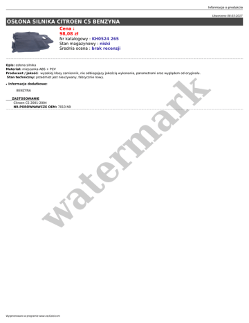 Informacje o produkcie Utworzono 08-03-2017 OSŁONA SILNIKA CITROEN C5 BENZYNA Cena : 98,08 zł Nr katalogowy : KH0524 265 Stan magazynowy : niski Średnia ocena : brak recenzji Opis: osłona silnika Materiał: mieszanka ABS + PCV Producent / jakość: wysokiej klasy zamiennik, nie odbiegający jakością wykonania, parametrami oraz wyglądem od oryginału. Stan techniczny: przedmiot jest nieużywany, fabrycznie nowy. ● Informacje dodatkowe: er m ar k BENZYNA w at ____ZASTOSOWANIE Citroen C5 2001-2004 NR.PORÓWNAWCZE OEM: 7013 N9 Wygenerowano w programie www.oscGold.com