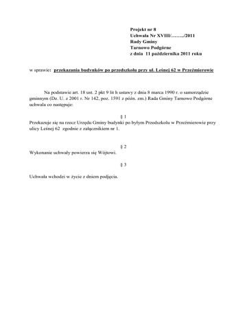 Projekt nr 8 Uchwała Nr XVIII/……../2011 Rady Gminy Tarnowo Podgórne z dnia 11 października 2011 roku w sprawie: przekazania budynków po przedszkolu przy ul. Leśnej 62 w Przeźmierowie Na podstawie art. 18 ust. 2 pkt 9 lit h ustawy z dnia 8 marca 1990 r. o samorządzie gminnym (Dz. U. z 2001 r. Nr 142, poz. 1591 z późn. zm.) Rada Gminy Tarnowo Podgórne uchwala co następuje: §1 Przekazuje się na rzecz Urzędu Gminy budynki po byłym Przedszkolu w Przeźmierowie przy ulicy Leśnej 62 zgodnie z załącznikiem nr 1. §2 Wykonanie uchwały powierza się Wójtowi. §3 Uchwała wchodzi w życie z dniem podjęcia. Załącznik Nr 1 do Projektu nr Uchwały nr XVIII/…../2011 Rady Gminy Tarnowo Podgórne z dnia 11 października 2011 r. w sprawie: przekazania budynków po przedszkolu przy ul. Leśnej 62 w Przeźmierowie 1. Budynek po byłym przedszkolu zlokalizowany jest w Przeźmierowie przy ul. Leśnej 62. Charakterystyka obiektu: Budynek jest obiektem dwukondygnacyjnym z poddaszem użytkowym, częściowo podpiwniczony. Na pierwszym piętrze znajdują się mieszkania lokatorskie. Na parterze budynku pomieszczenia użytkowane przez przedszkole. Dane techniczne budynku: - powierzchnia zabudowy – 411,0 m² - powierzchnia użytkowa – 313,0 m² - kubatura - 3.299,0 m³ Opis techniczny: Ściany konstrukcyjne budynku wykonane są z cegły ceramicznej pełnej na zaprawie cementowo-wapiennej. Grubości ścian wynosi 29, 41 i 54 cm /z obustronnym tynkiem/. Nad piwnicą strop wykonany jest z pustaków ceramicznych na belkach stropowych. Strop nad salą letnią (taras)- konstrukcja j. w. Pozostałe stropy drewniane. Dach budynku jest wielospadowy o konstrukcji drewnianej, kryty papą. Konstrukcja dachu płatwiowa ze ścianką kolankową. Klatka schodowa dwubiegowa - drewniana. Na parterze schody zabiegowe. Bieg do piwnicy betonowy. Stolarka okienna - na parterze budynku –stolarka drewniana, na piętrze okna PCV Stolarka drzwiowa – drzwi wejściowe zewnętrzne –stalowe, drzwi wewnętrzne drewniane Instalacje – budynek wyposażony jest w instalację wodno – kanalizacyjną, elektryczną, gazową oraz telefoniczną. Wartość budynku wg dokumentu PT: - wartość początkowa - 224 492,71 zł - wartość umorzenia - 100 394,75 zł - wartość nieumorzona - 124 097,96 zl 2. Budynek magazynowy murowany o powierzchni: 22,0 m² Wartość budynku wg dokumentu PT: - wartość początkowa - 5 844,17 zł - wartość umorzenia - 1 953,77 zł - wartość nieumorzona - 3 890,40 zł 3. Ogrodzenie z siatki o długości: 280,0 m Wartość budowli wg dokumentu PT: - wartość początkowa - 3 266,81 - wartość umorzenia - 2 570,00 - wartość nieumorzona - 696,81 4. Chodnik z kostki brukowej o powierzchni: 410,0 m² Chodnik z kostki betonowej o powierzchni: 48,0 m² Wartość budowli wg dokumentu PT: - wartość początkowa - 22 519,78 zł - wartość umorzenia - 3 884,70 zł - wartość nieumorzona - 18 635,08 zł