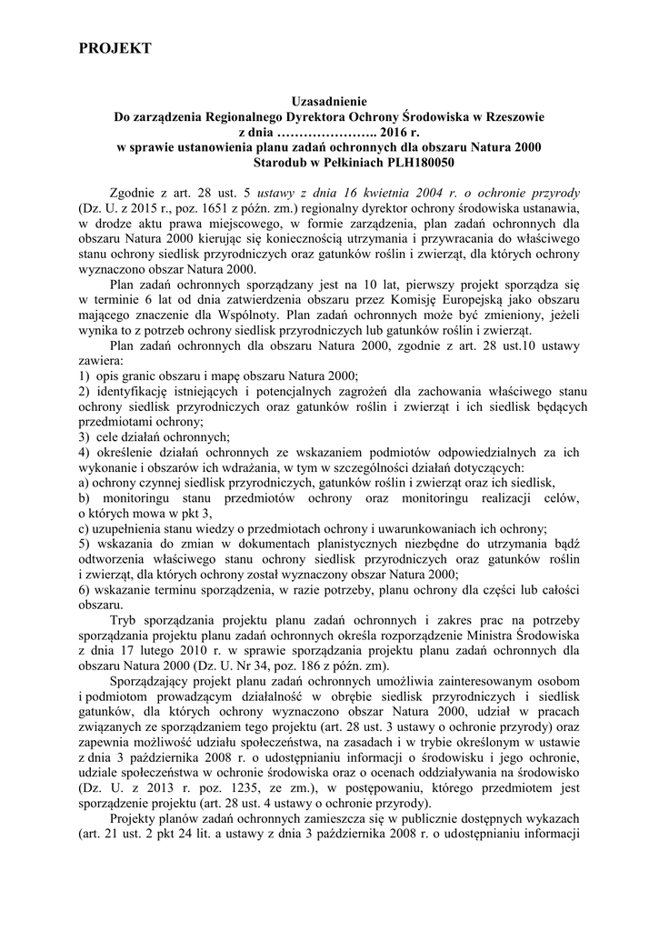 PROJEKT Uzasadnienie Do zarządzenia Regionalnego Dyrektora Ochrony Środowiska w Rzeszowie z dnia ………………….. 2016 r. w sprawie ustanowienia planu zadań ochronnych dla obszaru Natura 2000 Starodub w Pełkiniach PLH180050 Zgodnie z art. 28 ust. 5 ustawy z dnia 16 kwietnia 2004 r. o ochronie przyrody (Dz. U. z 2015 r., poz. 1651 z późn. zm.) regionalny dyrektor ochrony środowiska ustanawia, w drodze aktu prawa miejscowego, w formie zarządzenia, plan zadań ochronnych dla obszaru Natura 2000 kierując się koniecznością utrzymania i przywracania do właściwego stanu ochrony siedlisk przyrodniczych oraz gatunków roślin i zwierząt, dla których ochrony wyznaczono obszar Natura 2000. Plan zadań ochronnych sporządzany jest na 10 lat, pierwszy projekt sporządza się w terminie 6 lat od dnia zatwierdzenia obszaru przez Komisję Europejską jako obszaru mającego znaczenie dla Wspólnoty. Plan zadań ochronnych może być zmieniony, jeżeli wynika to z potrzeb ochrony siedlisk przyrodniczych lub gatunków roślin i zwierząt. Plan zadań ochronnych dla obszaru Natura 2000, zgodnie z art. 28 ust.10 ustawy zawiera: 1) opis granic obszaru i mapę obszaru Natura 2000; 2) identyfikację istniejących i potencjalnych zagrożeń dla zachowania właściwego stanu ochrony siedlisk przyrodniczych oraz gatunków roślin i zwierząt i ich siedlisk będących przedmiotami ochrony; 3) cele działań ochronnych; 4) określenie działań ochronnych ze wskazaniem podmiotów odpowiedzialnych za ich wykonanie i obszarów ich wdrażania, w tym w szczególności działań dotyczących: a) ochrony czynnej siedlisk przyrodniczych, gatunków roślin i zwierząt oraz ich siedlisk, b) monitoringu stanu przedmiotów ochrony oraz monitoringu realizacji celów, o których mowa w pkt 3, c) uzupełnienia stanu wiedzy o przedmiotach ochrony i uwarunkowaniach ich ochrony; 5) wskazania do zmian w dokumentach planistycznych niezbędne do utrzymania bądź odtworzenia właściwego stanu ochrony siedlisk przyrodniczych oraz gatunków roślin i zwierząt, dla których ochrony został wyznaczony obszar Natura 2000; 6) wskazanie terminu sporządzenia, w razie potrzeby, planu ochrony dla części lub całości obszaru. Tryb sporządzania projektu planu zadań ochronnych i zakres prac na potrzeby sporządzania projektu planu zadań ochronnych określa rozporządzenie Ministra Środowiska z dnia 17 lutego 2010 r. w sprawie sporządzania projektu planu zadań ochronnych dla obszaru Natura 2000 (Dz. U. Nr 34, poz. 186 z późn. zm). Sporządzający projekt planu zadań ochronnych umożliwia zainteresowanym osobom i podmiotom prowadzącym działalność w obrębie siedlisk przyrodniczych i siedlisk gatunków, dla których ochrony wyznaczono obszar Natura 2000, udział w pracach związanych ze sporządzaniem tego projektu (art. 28 ust. 3 ustawy o ochronie przyrody) oraz zapewnia możliwość udziału społeczeństwa, na zasadach i w trybie określonym w ustawie z dnia 3 października 2008 r. o udostępnianiu informacji o środowisku i jego ochronie, udziale społeczeństwa w ochronie środowiska oraz o ocenach oddziaływania na środowisko (Dz. U. z 2013 r. poz. 1235, ze zm.), w postępowaniu, którego przedmiotem jest sporządzenie projektu (art. 28 ust. 4 ustawy o ochronie przyrody). Projekty planów zadań ochronnych zamieszcza się w publicznie dostępnych wykazach (art. 21 ust. 2 pkt 24 lit. a ustawy z dnia 3 października 2008 r. o udostępnianiu informacji PROJEKT o środowisku i jego ochronie, udziale społeczeństwa w ochronie środowiska oraz o ocenach oddziaływania na środowisko – (Dz. U. 2013 r., poz. 1235 z późn. zm.). Projekt planu wymaga uzgodnienia z wojewodą (art. 59 ust. 2 ustawy z dnia 23 stycznia 2009 r. o wojewodzie i administracji rządowej w województwie, (Dz. U. Nr 31, poz. 206) i może być przedmiotem opiniowania przez regionalną radę ochrony przyrody (art. 97 ust. 3 pkt 2 ustawy o ochronie przyrody). Obszar Natura 2000 Starodub w Pełkiniach PLH180050 (zwany dalej Obszarem), jako obszar mający znaczenie dla Wspólnoty zatwierdzono decyzją Komisji Europejskiej 2011/64/UE decyzja Komisji z dnia 10 stycznia 2011 r. w sprawie przyjęcia na mocy dyrektywy Rady 92/43/EWG czwartego zaktualizowanego wykazu terenów mających znaczenie dla Wspólnoty składających się na kontynentalny region biogeograficzny, notyfikowana jako dokument nr C(2010) 9669; Dziennik Urzędowy Unii Europejskiej L 33/146 z 08.02.2011). Aktualny status prawny, powierzchnia obszaru oraz jego współrzędne geograficzne określa Decyzja Wykonawcza Komisji (UE) 2015/69 z dnia 3 grudnia 2014 r. w sprawie przyjęcia ósmego zaktualizowanego wykazu terenów mających znaczenie dla Wspólnoty składających się na kontynentalny region biogeograficzny (notyfikowana jako dokument nr C (2014)9072). Obszar ten obejmuje teren usytuowany koło Jarosławia, na granicy Pradoliny Podkarpackiej i Doliny Dolnego Sanu. Tworzy go mozaika pól uprawnych i łąk położonych pomiędzy miejscowościami Pełkinie, Ujezna, Jagiełła i Rozbórz. Jako przedmiot ochrony Obszaru jego Standardowy Formularz Danych (SDF) wymienia: 6410 Zmiennowilgotne łąki trzęślicowe (Molinion), 6510 Niżowe i górskie łąki użytkowane ekstensywnie (Arrhenatherion elatioris) oraz 1617 Starodub łąkowy Ostericum palustre. Plan zadań ochronnych dla obszaru mającego znaczenie dla Wspólnoty Starodub w Pełkiniach PLH180050, został sporządzony z uwzględnieniem wymagań określonych w art. 28 ust. 10 ustawy z dnia 16 kwietnia 2004 r. o ochronie przyrody oraz zgodnie z zapisami rozporządzenia Ministra Środowiska z dnia 17 lutego 2010 r. w sprawie sporządzania projektu planu zadań ochronnych dla obszaru Natura 2000 (Dz. U. Nr 34, poz. 186, z późn. zm.). Założeniem do opracowania projektu planu zadań ochronnych dla Obszaru jest utrzymanie lub odtworzenie właściwego stanu przedmiotów ochrony, który to obowiązek wynika z art. 6 (1) Dyrektyw