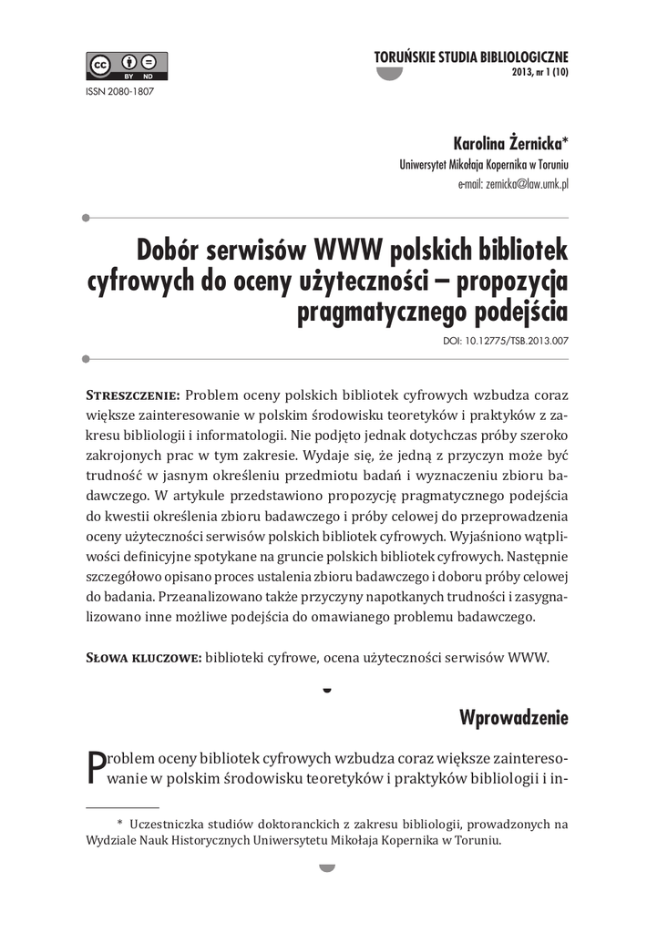 Toruńskie Studia Bibliologiczne 2013, nr 1 (10) ISSN 2080-1807 Karolina Żernicka* 1 Uniwersytet Mikołaja Kopernika w Toruniu e-mail: [email protected] Dobór serwisów WWW polskich bibliotek cyfrowych do oceny użyteczności – propozycja pragmatycznego podejścia DOI: 10.12775/TSB.2013.007 Streszczenie: Problem oceny polskich bibliotek cyfrowych wzbudza coraz większe zainteresowanie w polskim środowisku teoretyków i praktyków z zakresu bibliologii i informatologii. Nie podjęto jednak dotychczas próby szeroko zakrojonych prac w tym zakresie. Wydaje się, że jedną z przyczyn może być trudność w jasnym określeniu przedmiotu badań i wyznaczeniu zbioru badawczego. W artykule przedstawiono propozycję pragmatycznego podejścia do kwestii określenia zbioru badawczego i próby celowej do przeprowadzenia oceny użyteczności serwisów polskich bibliotek cyfrowych. Wyjaśniono wątpliwości definicyjne spotykane na gruncie polskich bibliotek cyfrowych. Następnie szczegółowo opisano proces ustalenia zbioru badawczego i doboru próby celowej do badania. Przeanalizowano także przyczyny napotkanych trudności i zasygnalizowano inne możliwe podejścia do omawianego problemu badawczego. Słowa kluczowe: biblioteki cyfrowe, ocena użyteczności serwisów WWW. Wprowadzenie P roblem oceny bibliotek cyfrowych wzbudza coraz większe zainteresowanie w polskim środowisku teoretyków i praktyków bibliologii i in- * Uczestniczka studiów doktoranckich z zakresu bibliologii, prowadzonych na Wydziale Nauk Historycznych Uniwersytetu Mikołaja Kopernika w Toruniu. 128 Karolina Żernicka formatologii. Dostrzega się rosnącą potrzebę prowadzenia badań w tym zakresie, jednak liczba inicjowanych projektów badawczych wydaje się nadal niewystarczająca. Analizując polskie piśmiennictwo bibliologiczne, można zauważyć, że tematyka oceny bibliotek cyfrowych jest stosunkowo słabo reprezentowana w literaturze przedmiotu1. Nie można jednak powiedzieć, że kwestiami oceny polskich bibliotek cyfrowych nie zajmowano się wcale. Ukazało się wiele publikacji, w których podejmowano próby ustalenia metod, kryteriów i miar oceny2, lecz badania te nie wychodziły poza rozważania teoretyczne. Podczas gdy jedni autorzy nie podjęli się oceny konkretnych kolekcji cyfrowych za pomocą przedstawionych przez siebie kryteriów i metod, inni – dokonali oceny jedynie wybranych zagadnień funkcjonowania polskich bibliotek cyfrowych. Stanisław Skórka3 przeanalizował sposób organizacji treści na przykładzie trzech polskich kolekcji cyfrowych, Anna Durska dokonała oceny kilku bibliotek pod kątem ich przydatności dla użytkowników z dysfunkcją wzroku4, Jadwiga Woźniak-Kasperek zajęła się kilkoma wybranymi aspektami oceny biblioteki cyfrowej e-bUW (głównie w obszarze funkcjonalności i dostępności)5. 1 Por. M. Wójcik, Literatura na temat bibliotek cyfrowych – analiza bibliometryczna, [w:] Biblioteki cyfrowe, pod red. M. Janiak, M. Krakowskiej, M. Próchnickiej, Warszawa 2012, s. 291. 2 Por. np. M. Janiak, M. Krakowska, Ocena jakości bibliotek cyfrowych, [w:] Biblioteki cyfrowe…, s. 135–178; E. Głowacka, Jakość bibliotek cyfrowych – aspekty i kryteria oceny. E-mentor. Dwumiesięcznik Szkoły Głównej Handlowej w Warszawie [on-line] 2011, nr 2 (39) [dostęp 31 marca 2013]. Dostępny w World Wide Web: http://www.e-mentor.edu. pl/artykul/index/numer/39/id/828; M. Górny, Porównawcza ocena efektywności bibliotek cyfrowych na etapie budowy i początkowego rozwoju – podejście pragmatyczne, [w:] Studia z informacji naukowej i dyscyplin pokrewnych: prace dedykowane Profesor Barbarze Stefaniak, pod red. E. Gondek, D. Pietruch-Reizes, Katowice 2007, s. 244–253. 3 S. Skórka, Ewaluacja jakości bibliotek cyfrowych w ujęciu architektury informacji, [w:] XVIII edycja seminarium z cyklu „Digitalizacja”: Biblioteki cyfrowe – systemy zarządzania, obsługi oraz kryteria oceny, Warszawa, 11 stycznia 2012 r., Warszawa 2012, s. 155–186. 4 A. Durska, Cyfrowe książki i biblioteki – próba oceny przydatności dla osób z dysfunkcją wzroku, „Zagadnienia Informacji Naukowej” 2008, nr 2, s. 29–43. 5 J. Woźniak-Kasperek, Funkcjonalność i dostępność bibliotek cyfrowych, [w:] Uniwersum piśmiennictwa wobec komunikacji elektronicznej, pod red. K. Migonia, M. Skalskiej-Zlat, Wrocław 2009, s. 393–406. Dobór serwisów WWW polskich bibliotek cyfrowych do oceny użyteczności… Kilku badaczy podjęło próbę bardziej kompleksowej oceny polskich bibliotek cyfrowych. Lidia Derfert-Wolf w swoich pracach6 krytycznie spojrzała na realizację projektów różnych bibliotek w Polsce, a Henryk Hollender w licznych publikacjach oceniał – często dość krytycznie – zawartość, organizację i widoczność w sieci rodzimych bibliotek cyfrowych7. Elementy oceny zawarły też w swoich opracowaniach m.in. Jolanta Mazurek (przeprowadziła badania ankietowe wśród użytkowników8) oraz Anna Wałek (dokonała szczegółowej charakterystyki kilkunastu największych polskich bibliotek na platformie dLibra9). Obok wskazanych wyżej przykładów, nie zainicjowano dotychczas szeroko zakrojonych badań oceny polskich bibliotek cyfrowych czy wypracowania konsekwentnej metodologii ich oceny. Wydaje się, że przyczyny takiego stanu rzeczy należy upatrywać w trudnościach związanych z precyzyjnym określeniem przedmiotu badań oraz wyznaczeniem zbioru badawczego. W niniejszym artykule podjęto próbę przedstawienia pragmatycznego podejścia do kwestii doboru materiału badawczego i określenia próby celowej na potrzeby przeprowadzenia oceny użyteczności serwisów polskich bibliotek cyfrowych. Zasygnalizowano także możliwe ograniczenia, jakie potencjalny badacz może spotkać podczas realizacji tego zadania. 6 Por. np. L. Derfert-Wolf, Jak posługiwać się biblioteką cyfrową?, [w:] Cyfrowy świat dokumentu: Wydawnictwa, biblioteki, muzea, archiwa, pod red. H. Hollendra, W