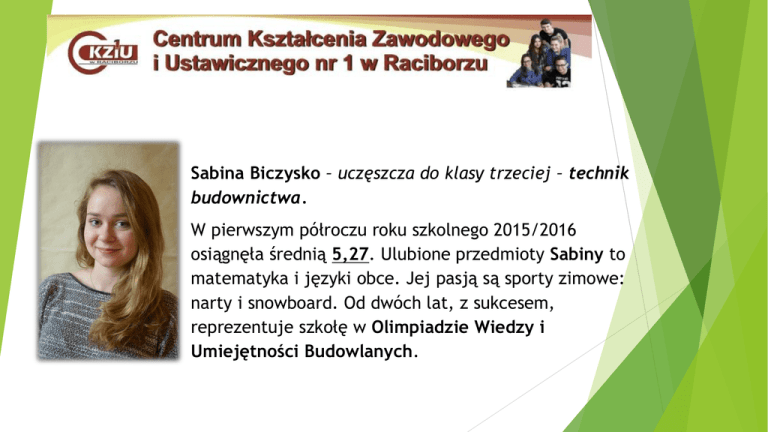 Sabina Biczysko – uczęszcza do klasy trzeciej – technik budownictwa. W pierwszym półroczu roku szkolnego 2015/2016 osiągnęła średnią 5,27. Ulubione przedmioty Sabiny to matematyka i języki obce. Jej pasją są sporty zimowe: narty i snowboard. Od dwóch lat, z sukcesem, reprezentuje szkołę w Olimpiadzie Wiedzy i Umiejętności Budowlanych. Sabina Musioł – technik logistyk – uczennica klasy drugiej. W pierwszym półroczu uzyskała średnią 5,11. Szczególnie fascynują ją przedmioty zawodowe. W Konkursie Wiedzy Logistycznej, który odbył się w Dąbrowie Górniczej, zajęła 14 miejsce w Polsce. Fotografia krajobrazu to pozaszkolne hobby Sabiny. Oczywiście swoją przyszłość wiąże ze studiami, które chciałaby godzić z pracą. Magdalena Szuba – uczennica klasy trzeciej – technik analityk. Lubi biologię i chemię, szczególnie zajęcia laboratoryjne. Pierwsze półrocze zakończyła ze średnią 5,07. Wielokrotnie brała udział w Konkursie Gwary Śląskiej. W czasie wolnym lubi piec i gotować. Michaela Wiktorin jest uczennicą klasy trzeciej – technik ekonomista. Pierwsze półrocze roku szkolnego 2015/2016 zakończyła ze średnią ocen 5,07. Michaela lubi język niemiecki i rachunkowość, ale to nie jedyne jej pasje, ponieważ czas wolny poświęca fotografii amatorskiej. W przyszłości chciałaby podjąć studia związane z rachunkowością, bądź finansami. Martina Fiołka – uczennica klasy drugiej – technik ekonomista. Pierwsze półrocze zakończyła ze średnią 5,0. Martina szczególnie lubi matematykę i przedmioty zawodowe. Dwukrotnie brała udział w Olimpiadzie Ekonomicznej oraz w Konkursie Wiedzy o Podatkach. W szkole pełni rolę przewodniczącej Samorządu Uczniowskiego. Jej pasją pozaszkolną jest jazda konna i gotowanie. Sandra Rudzok to uczennica klasy pierwszej - technik ekonomista. W pierwszym półroczu roku szkolnego 2015/2016 wypracowała sobie średnią 5,0. Sandra lubi matematykę i biologię. Jej pozaszkolne hobby to taniec. Natalia Reczuch – średnia ocen 5,0. Uczennica klasy trzeciej – technik hotelarstwa. Natalia lubi zajęcia wychowania fizycznego, język angielski i język niemiecki. Brała udział w Konkursie Wiedzy Hotelarskiej w Wiśle. Czas wolny spędza na szkicowaniu natury. Natalia Tomaszkiewicz – uczy się w klasie trzeciej – technik logistyk. W pierwszym półroczu roku szkolnego 2015/2016 wypracowała średnią ocen 5,0. Natalia lubi język angielski i język polski. W czasie wolnym zajmuje się tłumaczeniem książek dla młodzieży z języka angielskiego na polski. Michał Rzytki zakończył pierwsze półrocze ze średnią 5,0. Michał jest uczniem klasy trzeciej – monter sieci, instalacji i urządzeń sanitarnych. W tym roku zajął III miejsce w ogólnopolskim Turnieju Budowlanym ,,Złota Kielnia” w kwalifikacji: wykonywanie robót związanych z montażem i remontem instalacji sanitarnych. W czasie wolnym uprawia jogging.