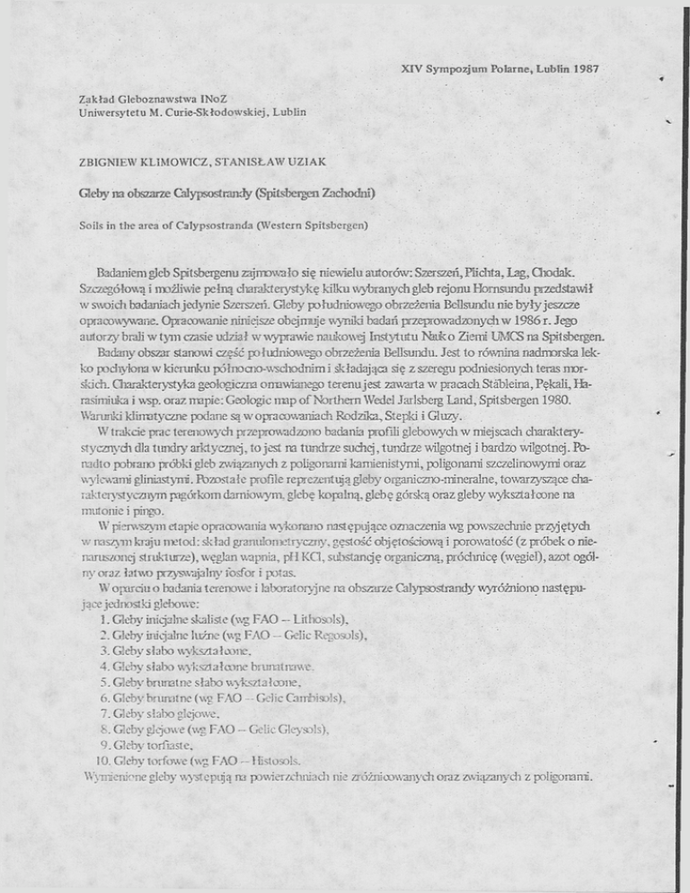 XIV Sympozjum Polarne, Lublin 1987 Zakład Gleboznawstwa INoZ Uniwersytetu M. Curie-Skłodowskiej, Lublin ZBIGNIEW KLIMOWICZ, STANISŁAW UZIAK Qeby га obszarze Calypsostrandy (Spitsbergen Zachodni) Soils in the area of Calypsostranda (Western Spitsbergen) Badaniem gleb Spitsbergenu zajmowało się niewielu autorów: Szerszeń, Piichta. Lag, Chodak. Szczegółową i możliwie pełną clmakterystykę Mku wybranych gleb rejonu Hornsundu przedstawił w swoich badaniach jedynie Szerszeń. Gleby południowego obrzeżenia BeBsundu nie były jeszcze opracowywane. Opracowanie niniejsze obejnsrje wyniki badań przeprowadzonych w 1986 r. Jego autorzy brali w tym czasie udział w wyprawie naukowej Instytutu >kiko Ziemi UMCS na Spitsbergen. Badany obszar stanowi część południowego obrzeżenia BeUśundu. Jest to równina nadmorska lekko pochylona w kierunku północno-wschodnim i składająca się z szeregu podniesionych teras morskich. Charakterystyka geologiczra oniiwianego terenu jest zawarta w pracach Stableina, Pękali, Harasimiuka i wsp. oraz mapie: Geologie map of Northern Wedel Jarlsberg land, Sptsbergen 1980. Warunki klimatyczne podane są w opracowaniach Rodzika, Stępki i Gluzy. W trakcie prac terenowych przeprowadzono badania profili glebowych w miejscach charakterystycznych dla tundry arktycznej, to jest ra tundrze suchej, tundrze wilgotnej i bardzo wilgotnej. Ponadto pobrano próbki gleb związanych z poligonami kamienistymi, poligonami szczelinowymi oraz wylewani gliniastymi. Ibzostałe profile reprezentują gleby organiczno-mineralne, towarzyszce charakterystycznym pagórkom darniowym, glebę kopalną, glebę górską oraz gleby wykształcone na muionie i pingo. W pierwszym etapie opracowania wykonano następujące oznaczenia wg powszechnie przyjętych w nasili) kraju metod: skład gramilometryczny, gęstość objętościową i porowatość (z próbek o nienaruszony strukturze), węglan wapnia, pl! KQ, substancję organiczną, pródmicę (węgiel), azot ogólny oraz łatwo przyswajalny fosfor i potas. W oparciu o badania terenowe i laboratoryjne na obszarze Galypśostrandy wyróżniono następujące jednostki glebowe: 1. Gleby inicjalne skaliste (wg FAO - Lithosols), 2. Gleby inicjalne luźne (wg FAO - Gelic Regosols), 3. Gleby słabo wykształcone, 4. Qeby słabo wykształcone bromtnawe. 5. Gleby brunatne słabo wykształcone, 6. Gleby brunatne (wg FAO — Gelic Carrfósols), 7. Gleby słabo glejowe. S. Gleby glejowe (wg FAO— Gelic Qeyscds), 9. Gleby torfiaste. !0. Gleby torfowe (wg FAO — Ifistosols. Wjuienicne gleby występną na powierzchniach nie zróżnicowanych oraz związanych z poligonami. 201 Na kształtowanie się badanych gleb oraz ich właściwości decydujący wpływ wywiera litologia oraz prooesy typowe dla obszarów ark tycznych, takie jak: segregacja mrozowa, pęcznienie i pękanie gruntu, a także soifflukqa (wg wielu autorów w tworzeniu się gleb arktyćznych procesy kriogeniczne dominują nad glebowymi). Nie mały wpływ odgrywają tutaj również lokalne stosunki wodne, mikroklimat Oraz roślinność jako w dużym stopniu zależna od dwódi pierwszych. Na znacznych powierzchniach Calypsostrandy pokrywa glebowa w ogóle nie występuje bądź jest w stanie inicjalnym. Na wyższych poziomach teras morskich są to przeważnie wychodnie litych skał lub gruzowiska skalne z prymitywnymi glebairn i bardzo rzadką roślmnośdą (lokalnie łitosole), w niższej części równiny, a także w szerokich dolinach rzecznych — piaszczyste żwirowiska z mniejszą lub większą domieszką kamieni (ЬШтё ijgosole). Gleby Calypsostrandy wytworzone są гапжш z utworów lekkich, jak średnich i dężkich. wyraźną przewagę stanowią jednak gliny lekkie i średnie, często pylaste. Pod względem typologicznym są to przeważnie gleby glejowe i słabo glejowe. Lżgszy skład gianulometryc/ny piaszc/.ysto-gliniasty ze znaczną domieszką materiału żwirowego jest dość typowy dla gleb słabo wykształconych i brunatnych, względnie brunatnawych. Węglan wapnia występige w zdecydowanej większości gleb. Jego zawartość rośnie z regu ły wraz z głębokością i dochodzi maksymalnie do 46%. Odczyn badanych gleb nie wykazuje dużego zróżnicowania. Przeważnie jest on obojętny lub zasadowy. Jedynie górne poziomy gleb organicznych są lekko kwaśne. W kilku profilach zaznacza się niewielki wzrost pil wiąz z głębokością. 'Zarówno na obszarze tundry suchą jak i wilgotnej gleby podroślinnośdą zwartą wykazują nieco niższe pH niż pod rzadką (kępkową). Prawid łowości takich nie wykazują ani gleby poligonu kamienistego ani wylewu gliniastego. Alkaliczność większości gleb Calypsostrandy należy tłumaczyć właściwościami skał macierzystych (powszechne występowanie węglanów), bardzo słabym przemywaniem, a także intensywnymi possani mrozowymi, powodująeymi ciągłe ruchy pionowe tworżywa glebowego. Największą zawartość substancji organiczną oraz miąższość poziomów organicznych stwierdzono w glebach torfowych i torfiastyćh wytworzonych na pagórkach darniowych oraz w glebach poligonalnych na liniach szczelin mrozowych. Wobrębie tudry suchej i wilgotnej 'więcej węgla organicznego mają gleby pod zwartą roślinnością niż pod roślinnością kępkową. Niewielką zawartość węgla wykazują gleby związane z wielobokami kamienistymi (szczególnie w środkowej części poligonu). Węgiel organiczny stwierdza się w całym profilu glebowym, przy czymw poziomach górnych jest go z reguły najwięcej. Zawartość azotu ogólnego jest zróżnicowana i zależ)'głównie od zawartości próchnicy. Stosunek C/N waha się w dość szerokich granicach (nawet wobrębie poszczególnych profili)-jest onjednak zazwyczaj wąski,a niekiedy bardzowąski. Gleby omawianego obszaru, ana logicznie jak gleby w rejonie Ibrnsundu, zawierają zazwyczaj stosunkowo dużo węgla organicznego, mało przyswajalnego fosforu i potasu (w glebach mineraln