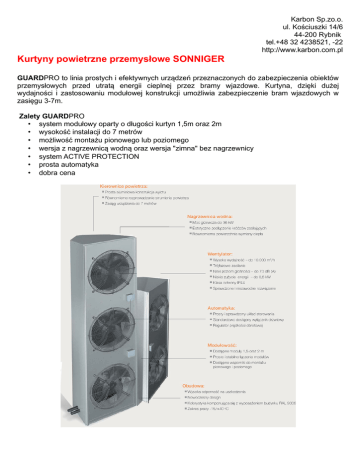Karbon Sp.zo.o. ul. Kościuszki 14/6 44-200 Rybnik tel.+48 32 4238521, -22 http://www.karbon.com.pl Kurtyny powietrzne przemysłowe SONNIGER GUARDPRO to linia prostych i efektywnych urządzeń przeznaczonych do zabezpieczenia obiektów przemysłowych przed utratą energii cieplnej przez bramy wjazdowe. Kurtyna, dzięki dużej wydajności i zastosowaniu modułowej konstrukcji umożliwia zabezpieczenie bram wjazdowych w zasięgu 3-7m. Zalety GUARDPRO • system modułowy oparty o długości kurtyn 1,5m oraz 2m • wysokość instalacji do 7 metrów • możliwość montażu pionowego lub poziomego • wersja z nagrzewnicą wodną oraz wersja "zimna" bez nagrzewnicy • system ACTIVE PROTECTION • prosta automatyka • dobra cena Automatyka Regulator prędkości obrotowej SPEEDER • Pięciostopniowa regulacja prędkości • Możliwość sterowania 3 wentylatorami, regulator 2A (SPEEDER 3) • Możliwość sterowania 6 wentylatorami, regulator 4A (SPEEDER 6) • Możliwość sterowania 10 wentylatorami, regulator 7A (SPEEDER 10) Wyłącznik drzwiowy DOORSTOP • • • Włączanie/wyłączanie silników kurtyny w momencie otwarcia/zamknięcia bramy wjazdowej Montaż w dolnej części prowadnicy drzwi podnoszonych Klasa ochrony IP67 Dane techniczne Parametry techniczne długość kurtyny maksymalna wysokość drzwi zakres mocy grzewczej* maksymalny wydatek powietrza maksymalne ciśnienie robocze średnica króćców przyłączeniowych maksymalny spadek ciśnienia wody** napięcie zasilania elektrycznego moc silnika elektrycznego maksymalny pobór prądu masa z wodą / bez wody klasa ochrony IP [m] [m] [kW] [m³/h] [MPa] [cale] [kPa] [V/Hz] [kW] [A] [kg] Kurtyny wodne GUARDPRO GUARDPRO 150W 200W 1,5 2 7 7 25 38 6250 8600 1,6 1,6 3/4 3/4 5,31 6,08 400/50 400/50 0,60 0,85 1,20 1,70 47 65 IP44 IP44 Kurtyny zimne GUARDPRO GUARDPRO 150C 200C 1,5 2 7 7 6500 8800 400/50 400/50 0,55 0,80 1,15 1,65 43 59 IP44 IP44