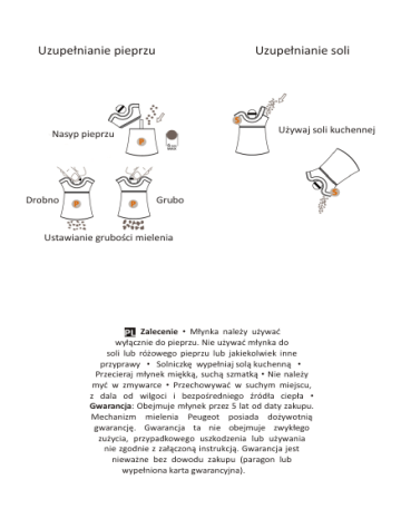 Uzupełnianie pieprzu Uzupełnianie soli Używaj soli kuchennej Nasyp pieprzu Drobno Grubo Ustawianie grubości mielenia PL Zalecenie • Młynka należy używać wyłącznie do pieprzu. Nie używać młynka do soli lub różowego pieprzu lub jakiekolwiek inne przyprawy • Solniczkę wypełniaj solą kuchenną • Przecieraj młynek miękką, suchą szmatką • Nie należy myć w zmywarce • Przechowywać w suchym miejscu, z dala od wilgoci i bezpośredniego źródła ciepła • Gwarancja: Obejmuje młynek przez 5 lat od daty zakupu. Mechanizm mielenia Peugeot posiada dożywotnią gwarancję. Gwarancja ta nie obejmuje zwykłego zużycia, przypadkowego uszkodzenia lub używania nie zgodnie z załączoną instrukcją. Gwarancja jest nieważne bez dowodu zakupu (paragon lub wypełniona karta gwarancyjna).