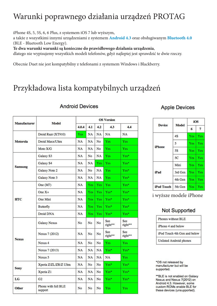 Warunki poprawnego działania urządzeń PROTAG iPhone 4S, 5, 5S, 6, 6 Plus, z systemem iOS 7 lub wyższym, a także z wszystkimi innymi urządzeniami z systemem Android 4.3 oraz obsługiwanym Bluetooth 4.0 (BLE - Bluetooth Low Energy). Te dwa warunki warunki są konieczne do prawidłowego działania urządzenia, dlatego nie wypisujemy wszystkich modeli telefonów, gdyż najlepiej jest sprawdzić te dwie rzeczy. Obecnie Duet nie jest kompatybilny z telefonami z systemem Windows i Blackberry. Przykładowa lista kompatybilnych urządzeń i wyższe modele iPhone