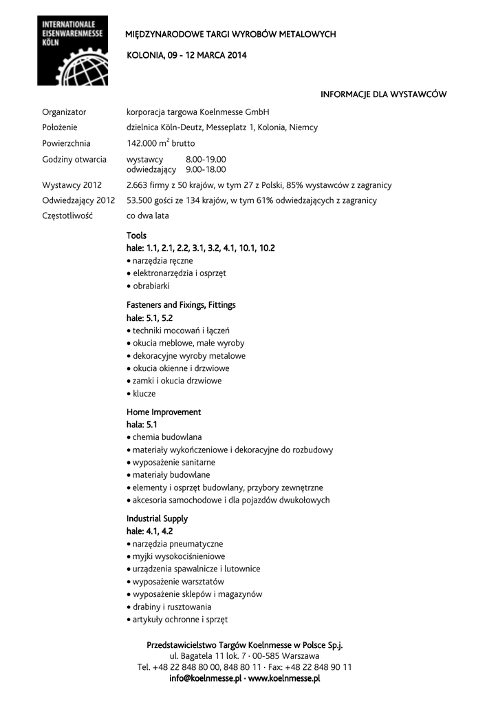 MIĘDZYNARODOWE TARGI WYROBÓW METALOWYCH KOLONIA, 09 - 12 MARCA 2014 INFORMACJE DLA WYSTAWCÓW Organizator korporacja targowa Koelnmesse GmbH Położenie dzielnica Köln-Deutz, Messeplatz 1, Kolonia, Niemcy Powierzchnia 142.000 m2 brutto Godziny otwarcia wystawcy odwiedzający Wystawcy 2012 2.663 firmy z 50 krajów, w tym 27 z Polski, 85% wystawców z zagranicy Odwiedzający 2012 53.500 gości ze 134 krajów, w tym 61% odwiedzających z zagranicy Częstotliwość co dwa lata 8.00-19.00 9.00-18.00 Tools hale: 1.1 1.1, .1, 2.1, 2.2, 3.1, 3.2, 4.1, 10.1, 10.2 narzędzia ręczne elektronarzędzia i osprzęt obrabiarki Fasteners and Fixings Fixings, Fittings hale: 5.1, 5.2 techniki mocowań i łączeń okucia meblowe, małe wyroby dekoracyjne wyroby metalowe okucia okienne i drzwiowe zamki i okucia drzwiowe klucze Home Improvement hala: 5.1 chemia budowlana materiały wykończeniowe i dekoracyjne do rozbudowy wyposażenie sanitarne materiały budowlane elementy i osprzęt budowlany, przybory zewnętrzne akcesoria samochodowe i dla pojazdów dwukołowych Industrial Supply hale: 4.1, 4.2 narzędzia pneumatyczne myjki wysokociśnieniowe urządzenia spawalnicze i lutownice wyposażenie warsztatów wyposażenie sklepów i magazynów drabiny i rusztowania artykuły ochronne i sprzęt Przedstawicielstwo Targów Koelnmesse w Polsce Sp.j. ul. Bagatela 11 lok. 7 · 00-585 Warszawa Tel. +48 22 848 80 00, 848 80 11 · Fax: +48 22 848 90 11 [email protected] · www.koelnmesse.pl MIĘDZYNARODOWE TARGI WYROBÓW METALOWYCH KOLONIA, 09 - 12 MARCA 2014 Koszty obowiązkowe wszystkie podane wartości są cenami netto Stoisko zgłoszenie do 31. 31.05.2013 05.2013 165,50 EURO/ m2 powierzchnia targowa za m2 bez zabudowy wszystkie rodzaje stoisk zgłoszenie do 31. 31.10.2013 10.2013 175,50 EURO/ m2 zgłoszenie od 01.11.2013 01.11.2013 185,50 EURO/ m2 Ryczałt za energię ogólne zużycie prądu, wody itp. 9,00 EURO/ m2 AUMA opłata na rzecz federacji targowej 0,60 EURO/ m2 Ryczałt na poczet usług serwisowych NKA dla firm biorących udział w targach po raz pierwszy dla firm biorących udział w targach kolejny raz rozliczany po targach w zależności od zużycia 664,50 EURO ryczałt naliczany jest na poziomie poniesionych kosztów podczas poprzedniej edycji targów Pakiet medialny Katalog drukowany/online/mobil 239,00 EURO wliczony w ryczałt na poczet usług serwisowych Pakiet promocyjny dla odwiedzających Nieograniczona ilość kuponów na jednodniowe bilety wstępu do zaproszeń dla klientów podlegające obowiązkowej rejestracji 389,00 EURO jednorazowa cena ryczałtowa Zgłoszenie w celu dokonania zgłoszenia firmy do udziału w targach niezbędne jest nadesłanie wypełnionych dokumentów zgłoszeniowych procedurę rozpoczynają nadesłane formularze 1.10 oraz 1.30. Wynajem powierzchni min. wielkość stoiska 12 m2 max. wysokość stoiska 3,00 m Montaż stoiska od 03.03.2014 od godz. 8.00 do 08.03.2014 do godz.20.00 możliwe przedłużenie godzin montażu, odpłatne Demontaż stoiska od 12.03.2014 od godz.18.00 do 15.03.2014 do godz.20.00 Zabudowa Koelnmesse Service http://stand.koelnmesse-service.de Wejściówki wystawcy bezpłatne, ważne w dni targowe oraz montażu i demontażu stoiska 4 wejściówki dla stoiska 12 m2 // 6 wejściówek dla stoiska do 20 m2 1 wejściówka za każde następne rozpoczęte 10 m2 do wielkości 100 m2 1 wejściówka za każde następne rozpoczęte 20 m2 powyżej 100 m2 odpłatne, dodatkowe wejściówki na zamówienie Koszty rezygnacji regulamin w dokumentach zgłoszeniowych zawarty w warunkach uczestnictwa: skrót punkt 11, część szczegółowa punkt 3.9., ogólna punkt II 8. Niniejsze informacje ważne są wyłącznie z warunkami uczestnictwa w targach znajdującymi się w dokumentach zgłoszeniowych i nie stanowią oferty handlowej w rozumieniu art. 66 § 1 Kodeksu Cywilnego. www.eisenwarenmesse.de // www.eisenwarenmesse.com www.eisenwarenmesse.com Przedstawicielstwo Targów Koelnmesse w Polsce Sp.j. ul. Bagatela 11 lok. 7 · 00-585 Warszawa Tel. +48 22 848 80 00, 848 80 11 · Fax: +48 22 848 90 11 [email protected] · www.koelnmesse.pl