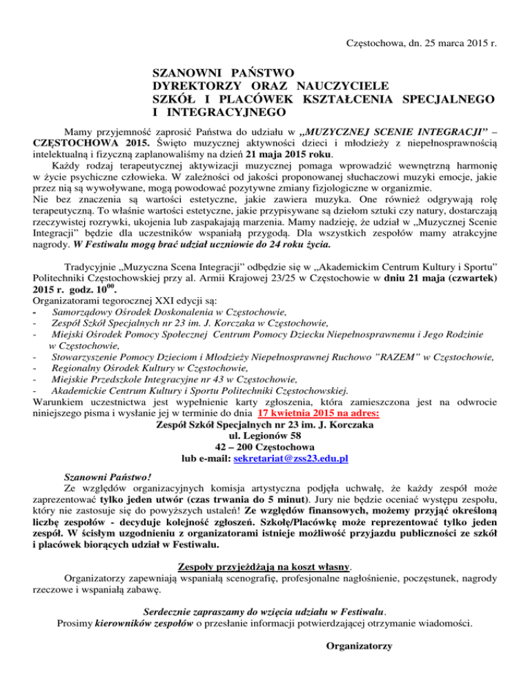 Częstochowa, dn. 25 marca 2015 r. SZANOWNI PAŃSTWO DYREKTORZY ORAZ NAUCZYCIELE SZKÓŁ I PLACÓWEK KSZTAŁCENIA SPECJALNEGO I INTEGRACYJNEGO Mamy przyjemność zaprosić Państwa do udziału w „MUZYCZNEJ SCENIE INTEGRACJI” – CZĘSTOCHOWA 2015. Święto muzycznej aktywności dzieci i młodzieży z niepełnosprawnością intelektualną i fizyczną zaplanowaliśmy na dzień 21 maja 2015 roku. Każdy rodzaj terapeutycznej aktywizacji muzycznej pomaga wprowadzić wewnętrzną harmonię w życie psychiczne człowieka. W zależności od jakości proponowanej słuchaczowi muzyki emocje, jakie przez nią są wywoływane, mogą powodować pozytywne zmiany fizjologiczne w organizmie. Nie bez znaczenia są wartości estetyczne, jakie zawiera muzyka. One również odgrywają rolę terapeutyczną. To właśnie wartości estetyczne, jakie przypisywane są dziełom sztuki czy natury, dostarczają rzeczywistej rozrywki, ukojenia lub zaspakajają marzenia. Mamy nadzieję, że udział w „Muzycznej Scenie Integracji” będzie dla uczestników wspaniałą przygodą. Dla wszystkich zespołów mamy atrakcyjne nagrody. W Festiwalu mogą brać udział uczniowie do 24 roku życia. Tradycyjnie „Muzyczna Scena Integracji” odbędzie się w „Akademickim Centrum Kultury i Sportu” Politechniki Częstochowskiej przy al. Armii Krajowej 23/25 w Częstochowie w dniu 21 maja (czwartek) 2015 r. godz. 1000. Organizatorami tegorocznej XXI edycji są: - Samorządowy Ośrodek Doskonalenia w Częstochowie, - Zespół Szkół Specjalnych nr 23 im. J. Korczaka w Częstochowie, - Miejski Ośrodek Pomocy Społecznej Centrum Pomocy Dziecku Niepełnosprawnemu i Jego Rodzinie w Częstochowie, - Stowarzyszenie Pomocy Dzieciom i Młodzieży Niepełnosprawnej Ruchowo ”RAZEM” w Częstochowie, - Regionalny Ośrodek Kultury w Częstochowie, - Miejskie Przedszkole Integracyjne nr 43 w Częstochowie, - Akademickie Centrum Kultury i Sportu Politechniki Częstochowskiej. Warunkiem uczestnictwa jest wypełnienie karty zgłoszenia, która zamieszczona jest na odwrocie niniejszego pisma i wysłanie jej w terminie do dnia 17 kwietnia 2015 na adres: Zespół Szkół Specjalnych nr 23 im. J. Korczaka ul. Legionów 58 42 – 200 Częstochowa lub e-mail: [email protected] Szanowni Państwo! Ze względów organizacyjnych komisja artystyczna podjęła uchwałę, że każdy zespół może zaprezentować tylko jeden utwór (czas trwania do 5 minut). Jury nie będzie oceniać występu zespołu, który nie zastosuje się do powyższych ustaleń! Ze względów finansowych, możemy przyjąć określoną liczbę zespołów - decyduje kolejność zgłoszeń. Szkołę/Placówkę może reprezentować tylko jeden zespół. W ścisłym uzgodnieniu z organizatorami istnieje możliwość przyjazdu publiczności ze szkół i placówek biorących udział w Festiwalu. Zespoły przyjeżdżają na koszt własny. Organizatorzy zapewniają wspaniałą scenografię, profesjonalne nagłośnienie, poczęstunek, nagrody rzeczowe i wspaniałą zabawę. Serdecznie zapraszamy do wzięcia udziału w Festiwalu. Prosimy kierowników zespołów o przesłanie informacji potwierdzającej otrzymanie wiadomości. Organizatorzy